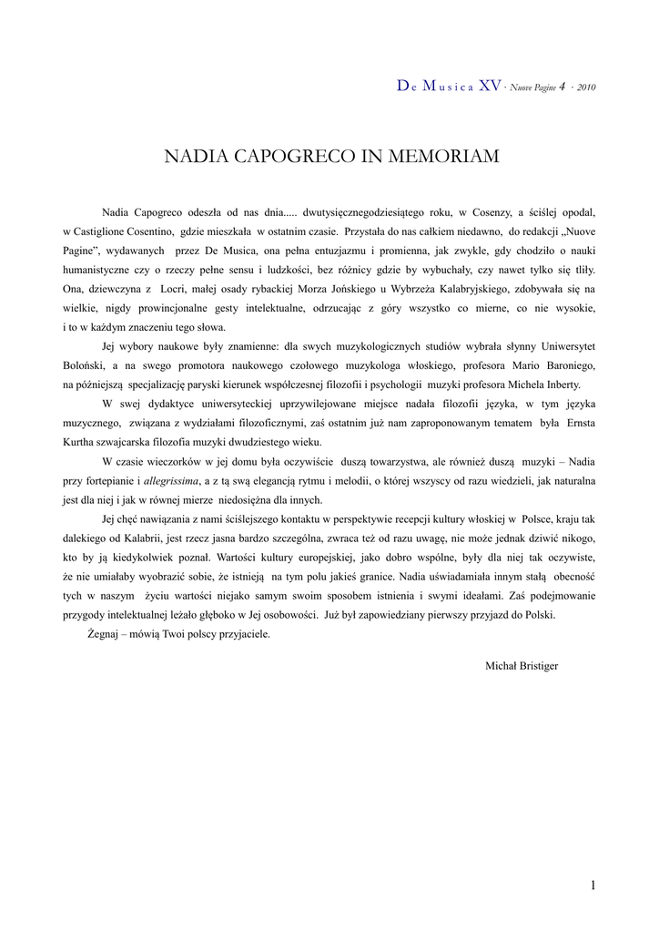D e M u s i c a XV· Nuove Pagine 4 · 2010 NADIA CAPOGRECO IN MEMORIAM Nadia Capogreco odeszła od nas dnia..... dwutysięcznegodziesiątego roku, w Cosenzy, a ściślej opodal, w Castiglione Cosentino, gdzie mieszkała w ostatnim czasie. Przystała do nas całkiem niedawno, do redakcji „Nuove Pagine”, wydawanych przez De Musica, ona pełna entuzjazmu i promienna, jak zwykle, gdy chodziło o nauki humanistyczne czy o rzeczy pełne sensu i ludzkości, bez różnicy gdzie by wybuchały, czy nawet tylko się tliły. Ona, dziewczyna z Locri, małej osady rybackiej Morza Jońskiego u Wybrzeża Kalabryjskiego, zdobywała się na wielkie, nigdy prowincjonalne gesty intelektualne, odrzucając z góry wszystko co mierne, co nie wysokie, i to w każdym znaczeniu tego słowa. Jej wybory naukowe były znamienne: dla swych muzykologicznych studiów wybrała słynny Uniwersytet Boloński, a na swego promotora naukowego czołowego muzykologa włoskiego, profesora Mario Baroniego, na późniejszą specjalizację paryski kierunek współczesnej filozofii i psychologii muzyki profesora Michela Inberty. W swej dydaktyce uniwersyteckiej uprzywilejowane miejsce nadała filozofii języka, w tym języka muzycznego, związana z wydziałami filozoficznymi, zaś ostatnim już nam zaproponowanym tematem była Ernsta Kurtha szwajcarska filozofia muzyki dwudziestego wieku. W czasie wieczorków w jej domu była oczywiście duszą towarzystwa, ale również duszą muzyki – Nadia przy fortepianie i allegrissima, a z tą swą elegancją rytmu i melodii, o której wszyscy od razu wiedzieli, jak naturalna jest dla niej i jak w równej mierze niedosiężna dla innych. Jej chęć nawiązania z nami ściślejszego kontaktu w perspektywie recepcji kultury włoskiej w Polsce, kraju tak dalekiego od Kalabrii, jest rzecz jasna bardzo szczególna, zwraca też od razu uwagę, nie może jednak dziwić nikogo, kto by ją kiedykolwiek poznał. Wartości kultury europejskiej, jako dobro wspólne, były dla niej tak oczywiste, że nie umiałaby wyobrazić sobie, że istnieją na tym polu jakieś granice. Nadia uświadamiała innym stałą obecność tych w naszym życiu wartości niejako samym swoim sposobem istnienia i swymi ideałami. Zaś podejmowanie przygody intelektualnej leżało głęboko w Jej osobowości. Już był zapowiedziany pierwszy przyjazd do Polski. Żegnaj – mówią Twoi polscy przyjaciele. Michał Bristiger 1