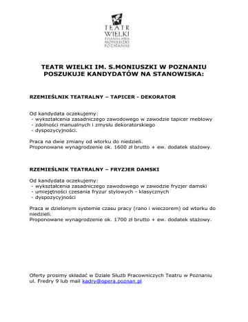 TEATR WIELKI IM. S.MONIUSZKI W POZNANIU POSZUKUJE KANDYDATÓW NA STANOWISKA: RZEMIEŚLNIK TEATRALNY – TAPICER - DEKORATOR Od kandydata oczekujemy: - wykształcenia zasadniczego zawodowego w zawodzie tapicer meblowy - zdolności manualnych i zmysłu dekoratorskiego - dyspozycyjności. Praca na dwie zmiany od wtorku do niedzieli. Proponowane wynagrodzenie ok. 1600 zł brutto + ew. dodatek stażowy. RZEMIEŚLNIK TEATRALNY – FRYZJER DAMSKI Od kandydata oczekujemy: - wykształcenia zasadniczego zawodowego w zawodzie fryzjer damski - umiejętności czesania fryzur stylowych - klasycznych - dyspozycyjności Praca w dzielonym systemie czasu pracy (rano i wieczorem) od wtorku do niedzieli. Proponowane wynagrodzenie ok. 1700 zł brutto + ew. dodatek stażowy. Oferty prosimy składać w Dziale Służb Pracowniczych Teatru w Poznaniu ul. Fredry 9 lub mail [email protected]