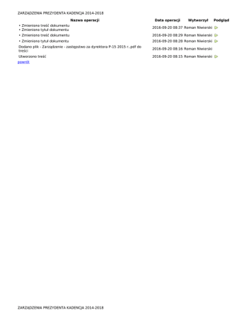ZARZĄDZENIA PREZYDENTA KADENCJA 2014-2018 Nazwa operacji Data operacji Wytworzył • Zmieniono treść dokumentu • Zmieniono tytuł dokumentu 2016-09-20 08:37 Roman Niwierski • Zmieniono treść dokumentu 2016-09-20 08:29 Roman Niwierski • Zmieniono tytuł dokumentu 2016-09-20 08:28 Roman Niwierski Dodano plik - Zarządzenie - zastępstwo za dyrektora P-15 2015 r..pdf do treści 2016-09-20 08:16 Roman Niwierski Utworzono treść 2016-09-20 08:15 Roman Niwierski powrót ZARZĄDZENIA PREZYDENTA KADENCJA 2014-2018 Podgląd
