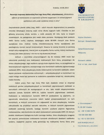 Kraków, 10.06.2013 Recenzja rozprawy doktorskiej Pani mgr Anny Piłat, zatytułowanej „Modulatory effects of melanosoms on expression of heme oxygenase-1 in retinal pigment epithelium cells under oxidative stress in vitro" UNIWERSYTET IAGIELLONSKI W KRAKOWIE Zwyrodnienie plamki żółtej (ang. AMD — adult macular degeneration) to poważ na choroba dotykająca znaczną część coraz dł użej żyjących ludzi. Choroba ta jest główną przyczyną utraty wzroku u osób powyżej 60 roku życia w krajach rozwiniętych. Jej patogeneza jest nadal słabo poznana. Wystę pują dwie postacie Wydział Biochemii, AMD: forma sucha, częstsza, dotykająca około 80-90% chorych oraz forma Biofizyki i Biotechnologii wysiękowa (tzw. mokra). Cechą charakterystyczną formy wysiękowej jest patologiczny rozrost naczyń krwionoś nych. Stwarza to szansę leczenia za pomocą Zakł ad Biotechnologii terapii anty-angiogennej. Inaczej jest w przypadku formy suchej, której mechanizm rozwoju jest słabo poznany i nie ma na nią skutecznej terapii. Medycznej Jednym z czynników przyczyniających się do rozwoju AMD może być zaburzenie produkcji oraz inaktywacji reaktywnych form tlenu, prowadzące do stresu oksydacyjnego. Jego nasileniu sprzyja duże stężenie tlenu, w szczególności w Kierownik zakł adu Prof. dr hab. Józef Dulak fotoreceptorach segmentu zewnętrznego oraz komórkach nabłonka pigmentowego siatkówki (RPE). Stres oksydacyjny dział a niekorzystnie na komórki siatkówki, zatem lepsze poznanie mechanizmów ochronnych — antyoksydacyjnych w komórkach tej części mózgu może być pomocne w znalezieniu sposobów terapii tej nieuleczalnej nadal choroby. Celem pracy Pani mgr Anny Piłat było zbadanie zmian w ekspresji niektórych genów antyoksydacyjnych w komórkach pigmentowych siatkówki w warunkach zbliżonych do wystę pujących w oku. Jako model eksperymentalny wybrane zostały komórki ARPE-19, ludzkie komórki pigmentowe siatkówki. Hodowane w laboratorium komórki ARPE-19 pozbawione są pigmentu, co ograniczało dotychczas znaczenie takich bada ń przeprowadzonych na tych komórkach, w których oznaczono ich odpowiedź na stres oksydacyjny. Autorka ul. Gronostajowa 7 zdecydowała się przybliżyć warunki naturalne, w których komórki pigmentowe PL 30-387 Kraków siatkówki zawierają barwnik, badając komórki uzyskane poprzez fagocytozę melanosomów. Jako kontrolne do takich doświadczeń zastosowa ła ARPE-19, którym tei. +48 12 664 6375 podała nieaktywne biologicznie kulki czarnego lateksu. Stres oksydacyjny osiągany +48 506 006 083 był poprzez jednorazowe traktowanie komórek określonymi dawkami nadtlenku fax +48 12 664 6918 wodoru, względnie poprzez stałą generację tej reaktywnej formy tlenu przy jozef.du ł [email protected] http://biatka.moLui.edu.pl/zbm/ wykorzystaniu oksydazy glukozy i glukozy. Innym modelem stresu oksydacyjnego było poddanie komórek ekspozycji na światło niebieskie, a także zastosowanie efektu fotodynamicznego z wykorzystaniem czerwieni bengalskiej i ekspozycji na światło zielone. Wpływ stresu oksydacyjnego na żywotność komórek oceniany był poprzez pomiar aktywności dehydrogenaz mitochondrialnych z wykorzystaniem testu redukcji MTT oraz pomiar fluorescencji jodku propydyny. Doktorantka oceniała ekspresję wybranych genów o potencjalnie antyoksydacyjnym działaniu: oksygenazy hemowej-1 oraz -2, peroksydazy glutationowej, katalazy i ferrytyny. Wykorzystała w tym celu technikę Western blot. Doktorantka oceniała także konsumpcję tlenu przez komórki z wykorzystaniem spektroskopii elektronowego rezonansu paramagnetycznego (EPR). Ponadto związane z wiekiem zmiany w melaninie komórek pigmentowych oceniane był y poprzez oznaczanie produktów degradacji melaniny (badania wykonane we współ pracy z Fujita Health University School of Health Sciences w Aichi w Japonii) i korelowane ze zmianami paramagnetycznymi wykrywanymi za pomocą spektroskopii EPR. W wyniku przeprowadzonych doświadczeń Autorka wykaza ła, że fagocytoza melanosomów bądź czarnych kulek lateksowych indukuje przejściowo — w trakcie 24 godzin - ekspresję HO-1 oraz GPX. Podobnie zwiększoną ekspresję powodowało traktowanie nadtlenkiem wodoru. Po siedmiu dniach od fagocytozy ekspresja badanych genów był a jednak taka sama zarówno w komórkach kontrolnych jak i fagocytujących. Co ciekawe, fagocytoza melanosomów, ale nie kulek lateksowych chroniła komórki ARPE-19 przed stresem oksydacyjnym powodowanym jednorazową dawką nadtlenku wodoru, czemu towarzyszyła wyższa ekspresja HO-1, ale niższa GPX (rycina 9). Tymczasem ekspozycja komórek na stałe stężenie H202, generowane przez oksydazę glukozy powodowała spadek ekspresji HO-1 oraz GPX w komórkach zawierających melanosomy lub kulki lateksu, przy silniejszym efekcie obserwowanym w komórkach ze sfagocytowanymi melanosomami (ryc. 12) Podobnie jak w przypadku ekspozycji na nadtlenek wodoru, także w przypadku stresu spowodowanego sub-letalnymi dawkami światła niebieskiego komórki zawierające sfagocytowane cząstki, w szczególności melanosomy, wzrost ekspresji HO-1 oraz GPX był częściowo zahamowany (ryc. 15). Natomiast stres oksydacyjny spowodowany reakcją fotodynamiczną indukował wzrost ekspresji HO-1 niezależ nie od tego, czy komórki zawierały czy też były pozbawione sfagocytowanych cząstek, chociaż w mniejszym stopniu w komórkach z lateksem lub melanosomami (ryc. 20). Autorka zaobserwowała także, że umiarkowany wzrost ekspresji HO-1 oraz ferrytyny nastę pował w komórkach ARPE-19 w wyniku ekspozycji na niskocząsteczkowe kompleksy żelaza (ryc. 21) a także na melanosomy wzbogacone w ten pierwiastek (ryc. 22). Ponadto, badając właściwości melaniny autorka wykazała zmiany, które interpretuje jako związane z wiekiem, a spowodowane utlenianiem melaniny. Za zaletę pracy można uznać zastosowanie modelu zbliżającego w pewnym stopniu warunki, jakie komórki