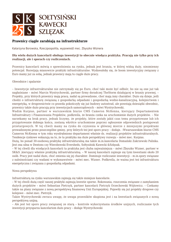 Prawnicy ciągle zarabiają na infrastrukturze Katarzyna Borowska, Rzeczpospolita, wypowiedź mec. Zbyszko Wiznera Dla wielu dużych kancelarii obsługa inwestycji to obecnie wiodąca praktyka. Pracują nie tylko przy ich realizacji, ale i sporach czy rozliczeniach. Prawnicy kancelarii mówią o spowolnieniu na rynku, jednak jest branża, w której widzą duży, niezmienny potencjał. Rozwijają mianowicie praktyki infrastrukturalne. Wydawałoby się, że boom inwestycyjny związany z Euro mamy już za sobą, jednak prawnicy mają tu ciągle dużo pracy. Obwodnice i spalarnie – Inwestycje infrastrukturalne nie zatrzymały się po Euro, choć taki może być odbiór, bo nie są one już tak nagłaśniane – mówi Marcin Wystrychowski, partner firmy doradczej TheStorm działającej w branży prawnej. – Projekty, przy których prawnicy mają pracę, nadal są prowadzone, choć mają inny charakter. Dużo się dzieje, jeśli chodzi o infrastrukturę związaną z gospodarką odpadami i gospodarką wodno-kanalizacyjną, kolejnictwem i energetyką, w drogownictwie co prawda pokończyły się już budowy autostrad, ale powstają dziesiątki obwodnic, prawnicy także dużo pracują przy inwestycjach samorządowych – mówi Wystrychowski. Wadim Kurpias, partner w warszawskim biurze CMS Cameron McKenna, kierujący Departamentem Infrastruktury i Finansowania Projektów, podkreśla, że branża czeka na uruchomienie dużych projektów. – Nie narzekamy na brak pracy, jednak liczymy, że projekty, które zostały jakiś czas temu przygotowane lub ich przygotowanie dobiega końca, zostaną wkrótce uruchomione poprzez ogłoszenie odpowiednich postępowań przetargowych. W tej chwili mamy na rynku do czynienia w głównej mierze z mniejszymi projektami prowadzonymi przez poszczególne gminy, przy których też jest sporo pracy – dodaje. –Wwarszawskim biurze CMS Cameron McKenna w tym roku wyodrębniono departament właśnie ds. realizacji projektów infrastrukturalnych. Tendencje rynkowe wskazują na to, że ta praktyka ma duże perspektywy rozwoju – mówi mec. Kurpias. Dużą, bo ponad 30-osobową praktykę infrastrukturalną ma także m.in.kancelaria Domański Zakrzewski Palinka. Jest ona silna w Dentons czy Wierzbowski Eversheds, Sołtysiński Kawecki &Szlęzak. – W tej chwili dla wiodących kancelarii ta praktyka jest chyba najważniejsza – mówi Zbyszko Wizner, partner w SK&S ,kierujący właśnie praktyką infrastrukturalną. – W naszej kancelarii zajmuje się tymi kwestiami około 20 osób. Pracy jest nadal dużo, choć zmienia się jej charakter. Dominuje rozliczanie inwestycji – m.in.spory związane z należnościami czy wadami w wykonawstwie – mówi mec. Wizner. Podkreśla, że ważna jest też infrastruktura energetyczna i związana z gospodarką odpadami. Nowa perspektywa Infrastrukturą na rynku warszawskim zajmują się także mniejsze kancelarie. – W tej chwili dużą część naszej praktyki zajmują kwestie sporne. Rokowania, roszczenia związane z zamykaniem dużych projektów – mówi Sebastian Pietrzyk, partner kancelarii Pietrzyk Orzechowski Wójtowicz. – Czekamy także na plany związane z nową perspektywą finansową Unii Europejskiej. Pojawiły się już projekty drogowe czy kolejowe – mówi mec. Pietrzyk. Także Wystrychowski zwraca uwagę, że uwaga prawników skupiona jest i na kwestiach związanych z nową perspektywą unijną. – Ale jest też sporo pracy związanej ze starą – kontrole wykorzystania środków unijnych, rozliczanie tych inwestycji przysparza kancelariom dużo pracy – dodaje Wystrychowski