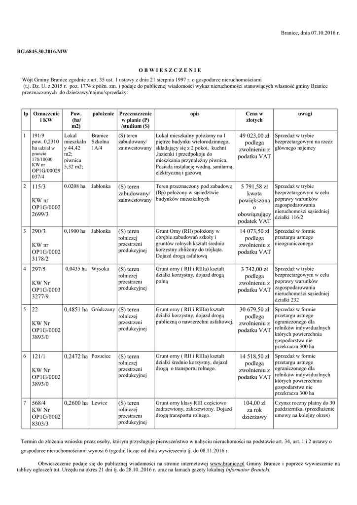 Branice, dnia 07.10.2016 r. BG.6845.30.2016.MW OBWIESZCZENIE Wójt Gminy Branice zgodnie z art. 35 ust. 1 ustawy z dnia 21 sierpnia 1997 r. o gospodarce nieruchomościami (t.j. Dz. U. z 2015 r. poz. 1774 z późn. zm. ) podaje do publicznej wiadomości wykaz nieruchomości stanowiących własność gminy Branice przeznaczonych do dzierżawy/najmu/sprzedaży: lp Oznaczenie i KW Pow. (ha/ m2) 1 191/9 Lokal pow. 0,2310 mieszkaln ha udział w y 44,42 gruncie m2; 178/10000 piwnica KW nr 5,32 m2; OP1G/00029 037/4 2 115/3 0.0208 ha położenie Przeznaczenie w planie (P) /studium (S) 290/3 Jabłonka Teren przeznaczony pod zabudowę (S) teren zabudowany/ (Bp) położony w sąsiedztwie Jabłonka 297/5 0,0435 ha Wysoka 22 0,4851 ha Gródczany (S) teren rolniczej przestrzeni produkcyjnej KW Nr OP1G/0002 3893/0 6 121/1 0,2472 ha Posucice KW Nr OP1G/0002 3893/0 7 (S) teren rolniczej przestrzeni produkcyjnej KW Nr OP1G/0003 3277/9 5 (S) teren rolniczej przestrzeni produkcyjnej KW nr OP1G/0002 3178/2 4 uwagi Lokal mieszkalny położony na I (S) teren 49 023,00 zł Sprzedaż w trybie zabudowany/ piętrze budynku wielorodzinnego, bezprzetargowym na rzecz podlega zainwestowany składający się z 2 pokoi, kuchni zwolnieniu z głównego najemcy ,łazienki i przedpokoju do podatku VAT mieszkania przynależny piwnica. Posiada instalację wodną, sanitarną, elektryczną i gazową zainwestowany budynków mieszkalnych 0,1900 ha Cena w złotych Branice Szkolna 1A/4 KW nr OP1G/0002 2699/3 3 opis 568/4 0,2600 ha Lewice KW Nr OP1G/0002 8303/3 (S) teren rolniczej przestrzeni produkcyjnej (S) teren rolniczej przestrzeni produkcyjnej 5 791,58 zł kwota powiększona o obowiązujący podatek VAT Sprzedaż w trybie bezprzetargowym w celu poprawy warunków zagospodarowania nieruchomości sąsiedniej działki 116/2 Grunt Orny (RII) położony w obrębie zabudowań szkoły i gruntów rolnych kształt średnio korzystny zbliżony do trójkąta. Dojazd drogą asfaltową 14 073,50 zł Sprzedaż w formie przetargu ustnego podlega zwolnieniu z nieograniczonego podatku VAT Grunt orny ( RII i RIIIa) kształt działki korzystny, dojazd drogą polną 3 742,00 zł podlega zwolnieniu z podatku VAT Sprzedaż w trybie bezprzetargowym w celu poprawy warunków zagospodarowania nieruchomości sąsiedniej działki 232 Grunt orny ( RII i RIIIa) kształt działki korzystny, dojazd drogą publiczną o nawierzchni asfaltowej. 30 679,50 zł podlega zwolnieniu z podatku VAT Sprzedaż w formie przetargu ustnego ograniczonego dla rolników indywidualnych których powierzchnia gospodarstwa nie przekracza 300 ha Grunt orny ( RII i RIIIa) kształt działki średnio korzystny, dojazd drogą o transportu rolnego. 14 518,50 zł podlega zwolnieniu z podatku VAT Sprzedaż w formie przetargu ustnego ograniczonego dla rolników indywidualnych których powierzchnia gospodarstwa nie przekracza 300 ha Grunt orny klasy RIII częściowo zadrzewiony, zakrzewiony. Dojazd drogą transportu rolnego. 104,00 zł za rok dzierżawy Czynsz roczny płatny do 30 października. (przedłużenie umowy na kolejny okres) Termin do złożenia wniosku przez osoby, którym przysługuje pierwszeństwo w nabyciu nieruchomości na podstawie art. 34, ust. 1 i 2 ustawy o gospodarce nieruchomościami wynosi 6 tygodni licząc od dnia wywieszenia tj. do 08.11.2016 r. Obwieszczenie podaje się do publicznej wiadomości na stronie internetowej www.branice.pl Gminy Branice i poprzez wywieszenie na tablicy ogłoszeń tut. Urzędu na okres 21 dni tj. do 28.10..2016 r. oraz na łamach gazety lokalnej Informator Branicki.