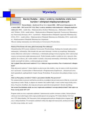 Wywiady Marzec Maciej Dulęba - złoty i srebrny medalista wielu konkursów i olimpiad międzynarodowych Maciej Dulęba - absolwent ZS nr 14 ( w latach 2006 – 2009 uczeń Gimnazjum nr 49, w latach 2009 – 2012 uczeń XIV LO). Złoty i srebrny medalista wielu konkursów i olimpiad międzynarodowych: 2008r. : medal złoty - Międzynarodowy Konkurs Matematyczny „ Mathematics without Limits" (Polska) , 2010r.: medal srebrny - Międzynarodowa Olimpiada Lingwistyki Teoretycznej, Matematycznej i Stosowanej (Szwecja), 2011r.: wyróżnienie - Międzynarodowa Olimpiada Lingwistyki Matematycznej (USA), 2011r. : medal srebrny - Międzynarodowa Olimpiada Matematyczna (Holandia), 2012r.: medal srebrny - Międzynarodowa Olimpiada Matematyczna (Argentyna) Obecnie studiuje matematykę oraz informatykę na Uniwersytecie Wrocławskim. ________________________________________________________________________________________ Skończył Pan liceum rok temu, gdzie kontynuuje Pan edukację? Od października 2012r jestem studentem Uniwersytetu Wrocławskiego. Studiuję dwa kierunki jednocześnie: matematykę i informatykę. Oba kierunki tak samo mnie interesują i świetnie się uzupełniają. Matematykę można efektywnie wykorzystać w informatyce, a informatyka pomaga tworzyć programy, które wykorzystuje się przy rozwiązywaniu zadań matematycznych. Wybór kierunku studiów wynikał nie tyle z sukcesów olimpijskich, ile te sukcesy, jak i wybór studiów wynikały z fascynacji matematyką i informatyką. Pasję do matematyki zaszczepili mi rodzice, a szkoła pomogła ją rozwijać. Jak wygląda Pana aktywność naukowa? Czy w dalszym ciągu uczestniczy Pan w konkursach i olimpiadach? Moja aktywność naukowa? Jestem dopiero na pierwszym roku studiów, więc nie mam za wiele do powiedzenia w tej kwestii. Uczestniczyłem w Mistrzostwach w Programowaniu Zespołowym – drużynowych zawodach regionalnych, ogólnopolskich i krajów Europy Wschodniej. W przyszłym roku podejmę kolejne wyzwania. Jakie są Pana plany zawodowe? Gdzie w przyszłości chciałby Pan pracować? Nie zastanawiałem się jeszcze nad karierą zawodową, na podjęcie decyzji mam jeszcze kilka lat, na razie planuję skończyć studia. Myślę, że dopiero na ostatnim roku studiów będę w stanie wybrać moją ścieżkę zawodową. Na pewno chciałbym, aby moja przyszła praca sprawiała mi przyjemność i dawała satysfakcję. Jak ocenia Pan działania szkoły na rzecz wspierania uzdolnień i rozwoju młodych ludzi? Jaki wpływ na Pana rozwój miało XIV LO? Program szkoły na rzecz wspierania uzdolnień i zainteresowań uczniów uważam za dobry. Dużym plusem szkoły jest niezwykle bogata oferta zajęć pozalekcyjnych oraz programy ITU (Indywidualny Tok Uczenia) i ITN (Indywidualny Tok Nauczania), które pomagają potencjalnym olimpijczykom osiągnąć sukcesy w danej dziedzinie. W rozwijaniu uzdolnień wielką rolę odgrywali nauczyciele, przekazywali nam nie tylko swoją wiedzę, ale i uczyli 43 Wywiady nam nie tylko swoją wiedzę, ale i uczyli swojego sposobu myślenia oraz zarażali swoimi Czerwiec pasjami. Szczególnie pozytywnie wspominam zajęcia z matematyki, prowadzone przez prof. Stanisława Busia. Dzięki wsparciu prof. St. Busia z zapałem poszerzałem i przyswajałem wiedzę matematyczną. Myślę, że właśnie wtedy nauczyłem się najwięcej. Nauczyciele poloniści pokazali mi piękno języka polskiego i udowodnili, że ścisły umysł może sobie również dobrze poradzić z językiem polskim. Bardzo duże znaczenie miały dla mnie „kółka” informatyczne, na które chodziłem przez prawie wszystkie lata nauki w szkole. Chciałbym również podkreślić, że każdy nauczyciel, z którym miałem w „czternastce” zajęcia, wywarł wpływ na mój rozwój i ma swój udział w osiągniętych przeze mnie sukcesach. Jestem im za to wdzięczny. Mam bardzo miłe wspomnienia z „czternastki”. Spędziłem tu w sumie 6 lat ( 3 lata w Gimnazjum nr 49 i 3 w Liceum nr XIV). W szkole najbardziej podobała mi się atmosfera. Nie zgadzam się z często spotykaną opinią, że jest tu wyścig szczurów. Uczą się tu ambitni ludzie, którzy mają pasje i chcą osiągnąć sukces. Taka atmosfera bardzo mnie mobilizowała. Przyjaźnie, które tutaj zawarłem, są dla mnie niezwykle cenne i myślę, że wiele z nich to takie na całe życie. Z niektórymi kolegami jesteśmy w stałym kontakcie, studiujemy razem na tych samych uczelniach i wspólnie startujemy w drużynowych Zawodach Informatycznych. Stratował Pan w wielu olimpiadach i osiągnął Pan liczne sukcesy. Która z nich miała dla Pana największe znaczenie? Sukcesy w Olimpiadach Międzynarodowych są dla mnie bardzo cennym osiągnięciem. Dużym przeżyciem było uczestnictwo w Międzynarodowej Olimpiadzie Matematycznej, która odbyła się w roku 2011 w Holandii. Pamiętam, że zadania były dość trudne (przynajmniej w mojej ocenie), jednak udało mi się zdobyć srebrny medal. Rok później poleciałem na kolejną Międzynarodową Olimpiadę do Argentyny. Lecieliśmy samolotem z Warszawy do Frankfurtu, następnie do Buenos Aires, a potem jeszcze do Mar del Plata. Pod względem organizacyjnym wszystko wyglądało podobnie jak w Holandii, ale Argentyna to zupełnie inny kraj. Dużo zwiedzaliśmy i poznawaliśmy się z uczestnikami różnych narodowości i kultur. Z tej olimpiady chyba najbardziej pamiętam nie sam konkurs, ale panującą tam atmosferę i możliwość zobaczenia tych wszystkich miejsc, których prawdopodobnie - gdyby nie olimpiada – nigdy bym nie zobaczył. Z Argentyny również wróciłem ze srebrnym medalem. Nie potrafię porównać olimpiad, w których brałem udział, bo wszystkie były wyjątkowe. Jakie jest Pana credo życiowe? Trudno powiedzieć… Myślę, że najważniejsze jest to, by człowiek stale się rozwiał i poszerzał swoje horyzonty. Co z perspektywy czasu mógłby Pan doradzić obecnym licealistom, potencjalnym olimpijczykom