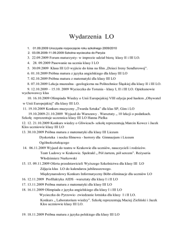 Wydarzenia LO 1. 01.09.2009 Uroczyste rozpoczęcie roku szkolnego 2009/2010 2. 03.09.2009-11.09.2009 Szkolna wycieczka do Paryża 3. 22.09.2009 Forum maturzysty- w imprezie udział biorą klasy II i III LO. 4. 28. 09.2009 Pasowanie na ucznia klasy I LO 5. 30.09.2009 Klasa III LO wyjście do kina na film „Dzieci Ireny Sendlerowej”. 6. 01.10.2009 Próbna matura z języka angielskiego dla klasy III LO 7. 02.10.2009 Próbna matura z matematyki dla klasy III LO 8. 07.10.2009 Lekcja muzealna –geologiczna na Politechnice Śląskiej dla klasy II i III LO. 9. 12.10.2009 – 15.10. 2009 Wycieczka do Torunia - klasy I, II i III LO. Opiekunowie wychowawcy klas 10. 16.10.2009 Olimpiada Wiedzy o Unii Europejskiej VIII edycja pod hasłem „Obywatel w Unii Europejskiej” dla klasy III LO. 11. 19.10.2009 Konkurs muzyczny „Twarda Sztuka” dla klas SP, Gim i LO 19.10.2009-21.10.2009 Wyjazd do Warszawy . Warsztaty „ 10 lekcji o podatkach. Szkołę reprezentuje uczennica klasy III LO Hanna Pielka 12. 12. 21.10.2009 Konkurs wiedzy o Gliwicach- szkołę reprezentują Marcin Kowcz i Jacek Klos uczniowie klasy III LO 13. 30.10.2009 Próbna matura z matematyki dla klasy III Liceum Dyskoteka i nocka filmowa - horrory dla Gimnazjum i Liceum Ogólnokształcącego 14. 06.11.2009 Wyjazd do teatru w Krakowie dla uczniów, nauczycieli i rodziców. Teatr Ludowy w Krakowie. Spektakl „ Pół żartem, pół sercem”. Reżyseria Włodzimierz Nurkowski 15. 15. 09.11.2009 Oferta przedstawicieli Wyższego Szkolnictwa dla klasy III LO Zdjęcia klas LO do kalendarza jubileuszowego. Międzynarodowy Konkurs Informatyczny Bóbr-eliminacje dla uczniów LO 16. 12.11.2009 Profilaktyka AIDS –warsztaty dla klasy I i II LO 17. 13.11.2009 Próbna matura z matematyki dla klasy III LO 18. 16.11.2009 Olimpiada z języka angielskiego dla klasy I i III LO Wycieczka do Pyrzowic- zwiedzanie lotniska dla klasy I i II LO. Konkurs „ Laboratorium wiedzy”. Szkołę reprezentują Maciej Zieliński i Jacek Klos uczniowie klasy III LO. 19. 18.11.2009 Próbna matura z języka polskiego dla klasy III LO 20. 19.11.2009 Szkolny konkurs języka niemieckiego: gramatyczno – leksykalny dla LO 21. 20.11.2009 Obchody Dnia Praw Dziecka – w imprezie uczestniczą klasy i LO 22. 24.11.2009 Próbna matura z języka polskiego dla klasy III LO z wydawnictwa Operon. 23. 25.11.2009 Próbna matura z matematyki dla klasy III LO z wydawnictwa Operon. Konkurs matematyczny „Alfik” dla LO 24. 26.11.2009 Próbna matura z języka obcego dla klasy III LO z wydawnictwa Operon. Język angielski - poziom podstawowy Język niemiecki- poziom podstawowy Język angielski + język niemiecki –poziom rozszerzony 25. 27.11.2009 Próbna matura z biologii, fizyki, geografii, chemii i WOS-u dla klasy III LO Geografia-poziom rozszerzony Fizyka- poziom rozszerzony Biologia-poziom rozszerzony Biologia-poziom podstawowy WOS Chemia – poziom podstawowy Uroczyste wręczenie dyplomów przez Panią Minister Krystynę Szumilas Stypendystom Prezesa Rady Ministrów. Dyplom dla Macieja Zielińskiego ucznia klasy III LO 26. 02.12.2009 Jersz- konkurs języka angielskiego dla klas LO 27. 03.12.2009 Olimpiada z podstaw przedsiębiorczości dla klasy I i II LO 28. 04.12.2009 Mikołajkowe Mistrzostwa Szkoły Społecznej w pływaniu dla LO Próbna matura z matematyki dla klasy III LO. Wyjazd do Teatru Polskiego we Wrocławiu na spektakl „ Mayday”. Reżyseria Wojciech Pokora. Wyjazd organizowany dla uczniów, nauczycieli i rodziców. 29. 07.12.2009 Lekcja fizyki dla klasy I LOna oddziale szpitalnym-poznanie działania akceleratora. 30. 14.12.2009 Wyjście klasy I, II LO i grupy z klasy III LO na wykład Janusza Steinhoffa „20 lat transformacji i rozwoju przedsiębiorczości” II Etap konkursu muzycznego „Twarda sztuka” dla LO 31. 16.12.2009 Próbna matura z języka polskiego dla klasy III LO Szkolny konkurs bożonarodzeniowy języka niemieckiego dla LO 32. 17.12.2009 Międzyszkolny konkurs filmowy dla LO Szkołę reprezentują uczniowie klasy I LO Artur Zwierzycki i Rafał Tomasik Klasa I i II LO- zwiedzanie Gliwickich Zakładów Urządzeń Technicznych. Wyjście do kina klasa II LO. 33. 18.12.2009 Próbna matura z matematyki dla klasy III LO 34. 21.12.2009 Opowieść wigilijna-przedstawienie przygotowane przez klasę III LO i p. Kukurbę dla klas Gim i LO 35. 22.12.2009 Wigilia dla absolwentów 36. 12.01.2010 Mistrzostwa I Szkoły Społecznej w Narciarstwie i Snowboardzie i LO na Stożku 37. Konkurs- Olimpus geograficzny dla klas LO 38. Spotkanie z wykładowcą Politechniki Śląskiej dla klasy III LO 39. Od 20.01.2010 do 24.01.2010 Wycieczka integracyjna do Istebnej dla klasy I, II LO i III Gim. Matura próbna z matematyki dla klasy III LO Studniówka klasy III LO 40. 23.01.2010 Etap Okręgowy Olimpiady Wiedzy o Polsce i Świecie Współczesnym Szkołę reprezentują Marcin Kowcz i Dariusz Sołowiński 41. 25.01.2010 II Etap Olimpady z języka angielskiego dla uczniów szkół ponadgimnazjalnych. Szkołę reprezentuje uczeń klasy III LO Maciej Zieliński 42. 26.01.2010 II Etap Olimpady z języka angielskiego dla uczniów szkół ponadgimnazjalnych. Szkołę reprezentuje uczeń klasy III LO Maciej Zieliński 43. 27.01.2010 Szkolny konkurs literowania w języku angielskim dla SP, Gim i LO ( część pisemna) 44. 03.02.2010 Próbna matura z języka polskiego dla klasy III LO Szkolny Przegląd Teatralny dla klas LO w MDK w Gliwicach na ul. Barlickiego 45. 04.02.2010 Szkolny konkurs literowania w języku angielskim ( część pisemna) dla klas LO 46. 05.02.2010 Dyskoteka karnawałowa dla klas LO 47. 08.02.2010 Zwiedzanie piekarni i wyjście do kina na film dla klasy I i II LO Klasa III LO – próbna matura z biologii, geografii i matematyki 48. 09.02.2010 Msza Święta dla LO 49. 10.02.2010 Zielone główkowanie- konkurs biologiczny dla LO Szkołę reprezentują Paulina Garbas i Michał Orzechowski uczniowie I klasy LO oraz Kimi Łagowska i Jacek Klos uczniowie III klasy L