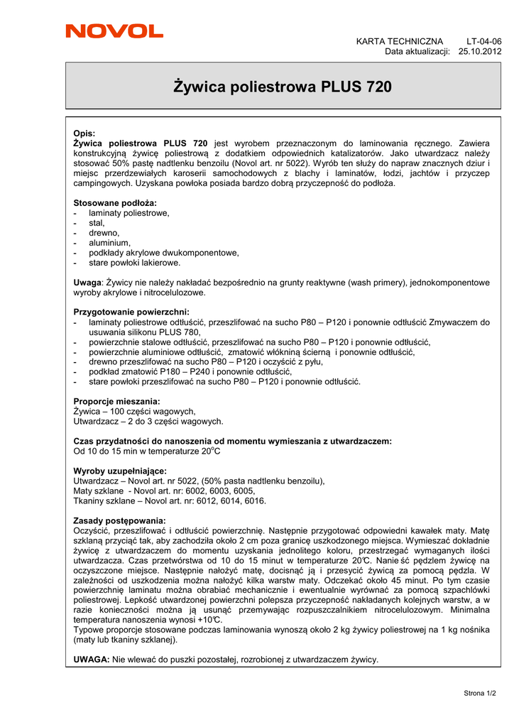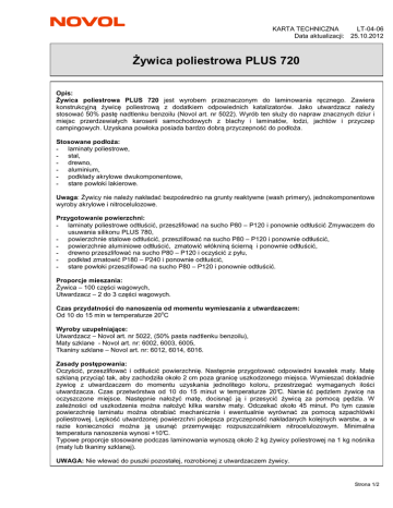KARTA TECHNICZNA LT-04-06 Data aktualizacji: 25.10.2012 Żywica poliestrowa PLUS 720 Opis: Żywica poliestrowa PLUS 720 jest wyrobem przeznaczonym do laminowania ręcznego. Zawiera konstrukcyjną żywicę poliestrową z dodatkiem odpowiednich katalizatorów. Jako utwardzacz należy stosować 50% pastę nadtlenku benzoilu (Novol art. nr 5022). Wyrób ten służy do napraw znacznych dziur i miejsc przerdzewiałych karoserii samochodowych z blachy i laminatów, łodzi, jachtów i przyczep campingowych. Uzyskana powłoka posiada bardzo dobrą przyczepność do podłoża. Stosowane podłoża: - laminaty poliestrowe, - stal, - drewno, - aluminium, - podkłady akrylowe dwukomponentowe, - stare powłoki lakierowe. Uwaga: Żywicy nie należy nakładać bezpośrednio na grunty reaktywne (wash primery), jednokomponentowe wyroby akrylowe i nitrocelulozowe. Przygotowanie powierzchni: - laminaty poliestrowe odtłuścić, przeszlifować na sucho P80 – P120 i ponownie odtłuścić Zmywaczem do usuwania silikonu PLUS 780, - powierzchnie stalowe odtłuścić, przeszlifować na sucho P80 – P120 i ponownie odtłuścić, - powierzchnie aluminiowe odtłuścić, zmatowić włókniną ścierną i ponownie odtłuścić, - drewno przeszlifować na sucho P80 – P120 i oczyścić z pyłu, - podkład zmatowić P180 – P240 i ponownie odtłuścić, - stare powłoki przeszlifować na sucho P80 – P120 i ponownie odtłuścić. Proporcje mieszania: Żywica – 100 części wagowych, Utwardzacz – 2 do 3 części wagowych. Czas przydatności do nanoszenia od momentu wymieszania z utwardzaczem: o Od 10 do 15 min w temperaturze 20 C Wyroby uzupełniające: Utwardzacz – Novol art. nr 5022, (50% pasta nadtlenku benzoilu), Maty szklane - Novol art. nr: 6002, 6003, 6005, Tkaniny szklane – Novol art. nr: 6012, 6014, 6016. Zasady postępowania: Oczyścić, przeszlifować i odtłuścić powierzchnię. Następnie przygotować odpowiedni kawałek maty. Matę szklaną przyciąć tak, aby zachodziła około 2 cm poza granicę uszkodzonego miejsca. Wymieszać dokładnie żywicę z utwardzaczem do momentu uzyskania jednolitego koloru, przestrzegać wymaganych ilości utwardzacza. Czas przetwórstwa od 10 do 15 minut w temperaturze 20°C. Nanie ść pędzlem żywicę na oczyszczone miejsce. Następnie nałożyć matę, docisnąć ją i przesycić żywicą za pomocą pędzla. W zależności od uszkodzenia można nałożyć kilka warstw maty. Odczekać około 45 minut. Po tym czasie powierzchnię laminatu można obrabiać mechanicznie i ewentualnie wyrównać za pomocą szpachlówki poliestrowej. Lepkość utwardzonej powierzchni polepsza przyczepność nakładanych kolejnych warstw, a w razie konieczności można ją usunąć przemywając rozpuszczalnikiem nitrocelulozowym. Minimalna temperatura nanoszenia wynosi +10°C. Typowe proporcje stosowane podczas laminowania wynoszą około 2 kg żywicy poliestrowej na 1 kg nośnika (maty lub tkaniny szklanej). UWAGA: Nie wlewać do puszki pozostałej, rozrobionej z utwardzaczem żywicy. Strona 1/2 Oczyścić i przeszlifować powierzchnię Odtłuścić Przygotować matę 100 2-3 KARTA TECHNICZNA LT-04-06 Data aktualizacji: 25.10.2012 Proporcje wagowo: Nanieść 100+2-3 żywicę Potlife 10-15 min/20°C Nałożyć matę Nanieść żywicę Odczekać P80-P120 45 min/20°C Czas schnięcia: o Około 45 min. w temperaturze 20 C o Czas ten można skrócić przez wygrzewanie przez 15 minut w temperaturze nie przekraczającej 60 C. Szlifowanie: P80-P120, Pokrywalny przez: Szpachlówki poliestrowe, szpachlówkę poliestrową natryskową, większość podkładów, farb i lakierów dostępnych na rynku. Kolor: Żółty. Czyszczenie sprzętu: Rozpuszczalnik do wyrobów nitrocelulozowych. Warunki i czas przechowywania: Przechowywać w suchych i chłodnych pomieszczeniach z dala od źródeł ognia i ciepła. Unikać naświetlania promieniami słonecznymi . Żywica: 12 miesięcy w temperaturze 20°C. Przepisy BHP: Podane w Karcie Charakterystyki dla danego wyrobu. Inne informacje: Efektywność naszych systemów jest wynikiem badań laboratoryjnych oraz wieloletniego doświadczenia. Dane zawarte w niniejszym materiale są zgodne z aktualnym stanem wiedzy o naszych produktach i możliwościach ich stosowania. Gwarantujemy wysoką jakość pod warunkiem, że są spełnione nasze instrukcje i że praca jest wykonana zgodnie z zasadami dobrego rzemiosła. Konieczne jest wykonanie próbnego zastosowania produktu ze względu na potencjalnie różne zachowanie się wyrobu z różnymi materiałami. Nie ponosimy odpowiedzialności jeżeli na końcowy rezultat pracy miały wpływ czynniki znajdujące się poza naszą kontrolą. Strona 2/2