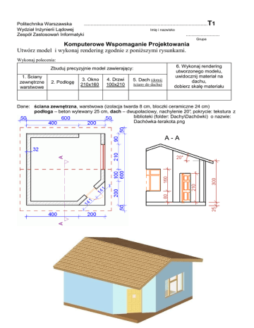 Politechnika Warszawska ............................................................................................T1 Wydział Inżynierii Lądowej Imię i nazwisko Zespół Zastosowań Informatyki ......................... Grupa Komputerowe Wspomaganie Projektowania Utwórz model i wykonaj rendering zgodnie z poniższymi rysunkami. Wykonaj polecenia: Zbuduj precyzyjnie model zawierający: 1. Ściany zewnętrzne warstwowe 2. Podłogę 3. Okno 210x160 4. Drzwi 100x210 5. Dach (dotnij ściany do dachu) 6. Wykonaj rendering utworzonego modelu, uwidocznij materiał na dachu, dobierz skalę materiału Dane: ściana zewnętrzna, warstwowa (izolacja twarda 8 cm, bloczki ceramiczne 24 cm) podłoga – beton wylewany 25 cm, dach – dwupołaciowy, nachylenie 20°, pokrycie: tekstura z biblioteki (folder: Dachy\Dachówki) o nazwie: Dachówka-terakota.png A-A