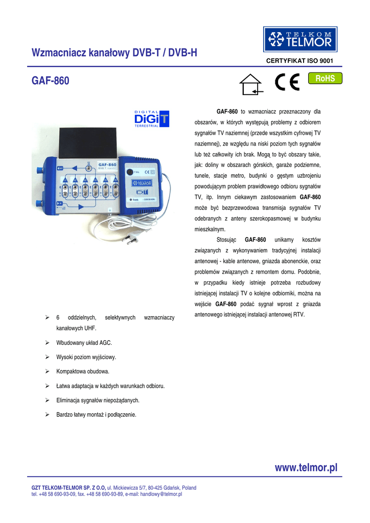 Wzmacniacz kanałowy DVB-T / DVB-H CERTYFIKAT ISO 9001 RoHS GAF-860 GAF-860 to wzmacniacz przeznaczony dla obszarów, w których wyst puj problemy z odbiorem sygnałów TV naziemnej (przede wszystkim cyfrowej TV naziemnej), ze wzgl du na niski poziom tych sygnałów lub te całkowity ich brak. Mog to by obszary takie, jak: doliny w obszarach górskich, gara e podziemne, tunele, stacje metro, budynki o g stym uzbrojeniu powoduj cym problem prawidłowego odbioru sygnałów TV, itp. Innym ciekawym zastosowaniem GAF-860 mo e by bezprzewodowa transmisja sygnałów TV odebranych z anteny szerokopasmowej w budynku mieszkalnym. Stosuj c GAF-860 unikamy kosztów zwi zanych z wykonywaniem tradycyjnej instalacji antenowej - kable antenowe, gniazda abonenckie, oraz problemów zwi zanych z remontem domu. Podobnie, w przypadku kiedy istnieje potrzeba rozbudowy istniej cej instalacji TV o kolejne odbiorniki, mo na na wej cie GAF-860 poda 6 oddzielnych, selektywnych wzmacniaczy sygnał wprost z gniazda antenowego istniej cej instalacji antenowej RTV. kanałowych UHF. Wbudowany układ AGC. Wysoki poziom wyj ciowy. Kompaktowa obudowa. Łatwa adaptacja w ka dych warunkach odbioru. Eliminacja sygnałów niepo danych. Bardzo łatwy monta i podł czenie. www.telmor.pl GZT TELKOM-TELMOR SP. Z O.O, ul. Mickiewicza 5/7, 80-425 Gda sk, Poland tel. +48 58 690-93-09, fax. +48 58 690-93-89, e-mail: [email protected] PARAMETRY TECHNICZNE TYP Zakres cz stotliwo ci pracy Liczba torów kanałowych Poziom wyj ciowy Wzmocnienie Zakres regulacji wzmocnienia (niezale ny dla ka dego kanału) Zakres regulacji AGC Szeroko pasma toru kanałowego (-3dB) Tłumienie kanałów s siednich: N+2 N+3 Poziom zniekształce na wyj ciu: 470-862MHz > 1GHz < 1GHz Minimalny poziom wej ciowy Maksymalny poziom wej ciowy Impedancja wej cie / wyj cie Napi cie zasilania INNE Pobór mocy Wymiary Waga Kompatybilno EMC MHz / mW dB GAF-860 470 - 862 6 20 - 200 70 dB 15 dB MHz 35 14 dB dB 20 30 dBc dBm dBm dBuV dBuV V AC / Hz -36 -36 -30 60 85 75 230 / 50 - 60 W mm kg / 15 230 x 160 x 50 1,0 zgodna z norm EN 301 489-14 PRZYKŁAD ZASTOSOWANIA Parametry techniczne mog ulec zmianie bez wcze niejszego powiadomienia. GZT TELKOM-TELMOR SP. Z O.O, ul. Mickiewicza 5/7, 80-425 Gda sk, Poland tel. +48 58 690-93-09, fax. +48 58 690-93-89, e-mail: [email protected] www.telmor.pl