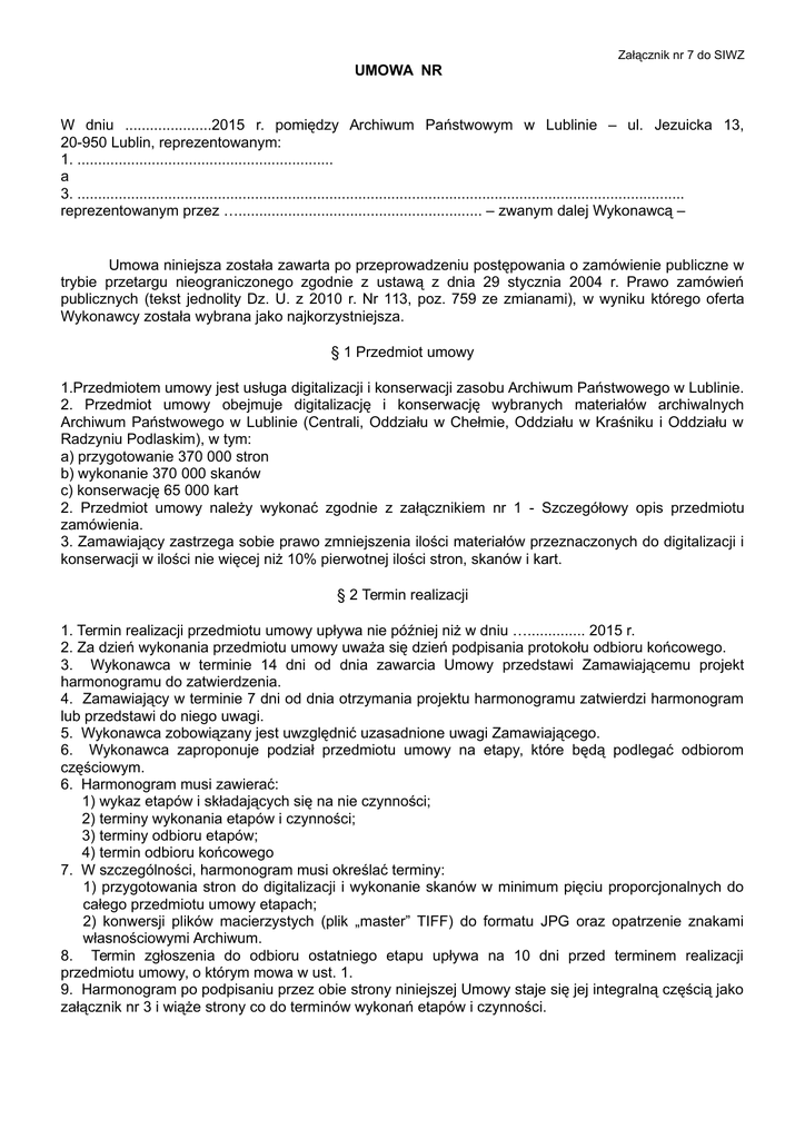Załącznik nr 7 do SIWZ UMOWA NR W dniu .....................2015 r. pomiędzy Archiwum Państwowym w Lublinie – ul. Jezuicka 13, 20-950 Lublin, reprezentowanym: 1. .............................................................. a 3. ................................................................................................................................................... reprezentowanym przez …........................................................... – zwanym dalej Wykonawcą – Umowa niniejsza została zawarta po przeprowadzeniu postępowania o zamówienie publiczne w trybie przetargu nieograniczonego zgodnie z ustawą z dnia 29 stycznia 2004 r. Prawo zamówień publicznych (tekst jednolity Dz. U. z 2010 r. Nr 113, poz. 759 ze zmianami), w wyniku którego oferta Wykonawcy została wybrana jako najkorzystniejsza. § 1 Przedmiot umowy 1.Przedmiotem umowy jest usługa digitalizacji i konserwacji zasobu Archiwum Państwowego w Lublinie. 2. Przedmiot umowy obejmuje digitalizację i konserwację wybranych materiałów archiwalnych Archiwum Państwowego w Lublinie (Centrali, Oddziału w Chełmie, Oddziału w Kraśniku i Oddziału w Radzyniu Podlaskim), w tym: a) przygotowanie 370 000 stron b) wykonanie 370 000 skanów c) konserwację 65 000 kart 2. Przedmiot umowy należy wykonać zgodnie z załącznikiem nr 1 - Szczegółowy opis przedmiotu zamówienia. 3. Zamawiający zastrzega sobie prawo zmniejszenia ilości materiałów przeznaczonych do digitalizacji i konserwacji w ilości nie więcej niż 10% pierwotnej ilości stron, skanów i kart. § 2 Termin realizacji 1. Termin realizacji przedmiotu umowy upływa nie później niż w dniu ….............. 2015 r. 2. Za dzień wykonania przedmiotu umowy uważa się dzień podpisania protokołu odbioru końcowego. 3. Wykonawca w terminie 14 dni od dnia zawarcia Umowy przedstawi Zamawiającemu projekt harmonogramu do zatwierdzenia. 4. Zamawiający w terminie 7 dni od dnia otrzymania projektu harmonogramu zatwierdzi harmonogram lub przedstawi do niego uwagi. 5. Wykonawca zobowiązany jest uwzględnić uzasadnione uwagi Zamawiającego. 6. Wykonawca zaproponuje podział przedmiotu umowy na etapy, które będą podlegać odbiorom częściowym. 6. Harmonogram musi zawierać: 1) wykaz etapów i składających się na nie czynności; 2) terminy wykonania etapów i czynności; 3) terminy odbioru etapów; 4) termin odbioru końcowego 7. W szczególności, harmonogram musi określać terminy: 1) przygotowania stron do digitalizacji i wykonanie skanów w minimum pięciu proporcjonalnych do całego przedmiotu umowy etapach; 2) konwersji plików macierzystych (plik „master” TIFF) do formatu JPG oraz opatrzenie znakami własnościowymi Archiwum. 8. Termin zgłoszenia do odbioru ostatniego etapu upływa na 10 dni przed terminem realizacji przedmiotu umowy, o którym mowa w ust. 1. 9. Harmonogram po podpisaniu przez obie strony niniejszej Umowy staje się jej integralną częścią jako załącznik nr 3 i wiąże strony co do terminów wykonań etapów i czynności. § 3 Podwykonawcy 1. Zlecenie wykonania Przedmiotu umowy Podwykonawcom, nie wyłącza odpowiedzialności Wykonawcy wobec Zamawiającego za wykonanie zleconego zakresu Przedmiotu umowy. Wykonawca jest odpowiedzialny za działania, uchybienia i zaniedbania Podwykonawców i ich pracowników w takim samym stopniu, jakby to były uchybienia lub zaniedbania jego własnych pracowników. 2. Za zapłatę wynagrodzenia Podwykonawcom wyłączną odpowiedzialność ponosi Wykonawca. § 4 Obowiązki wykonawcy 1. Wykonawca przy wykonywaniu usługi posłuży się osobami posiadającymi odpowiednią wiedzę fachową, doświadczenie oraz kwalifikacje do należytego i zgodnego z obowiązującymi standardami wykonania przedmiotu umowy określonego w wytycznych do realizacji usługi digitalizacji i konserwacji materiałów archiwalnych, w tym osobami wymienionymi w załączniku nr 2 do umowy. 2. Wykonawca zobowiązany jest na każde żądanie Zamawiającego okazać dokumenty potwierdzające ukończenie odpowiednich szkoleń przez osoby wymienione w załączniku nr 2 do umowy. 3. Wykonawca zatrudniający pracowników Archiwum Państwowego w Lublinie zobowiązany jest do naliczenia i odprowadzenia składek na ubezpieczenie społeczne, zdrowotne oraz fundusze pozaubezpieczeniowe pracodawcy. 4. Wykonawca usługę objętą przedmiotem umowy wykona wyłącznie na sprzęcie zapewnionym we własnym zakresie. Ze względu na bezpieczeństwo zbiorów do digitalizacji zastosowane muszą zostać skanery spełniające następujące wymogi: szalki: ruchome szalki stołu dopasowujące się do grubości grzbietu skanowanej księgi; skaner musi mieć możliwość pracy z użyciem szyby dociskowej; rozdzielczość fizyczna skanera: minimum 300ppi; oświetlenie: zimne bez promieniowania UV i IR, górne do skanowanego obiektu; skaner z możliwością zapisywania w formacie TIFF z głębią kolorów 24 bit. 5.Materiały archiwalne przekazane Wykonawcy przez Zamawiającego w związku z wykonywaniem umowy, a także pliki powstałe w wyniku wykonania usługi – zapisane w formie elektronicznej – stanowią własność Archiwum Państwowe w Lublinie i nie mogą być udostępnione jakiejkolwiek osobie trzeciej, ani ujawnione w inny sposób. 6. Digitalizacja i konserwacja odbywa się w godzinach uzgodnionych z Zamawiającym, z zastrzeżeniem, że realizacja zamówienia nie będzie kolidowała z realizowanymi zadaniami z zakresu digitalizacji i konserwacji przez Zamawiającego. 7. Wykonawca zobowiązuje się do zwrócenia w stanie nie pogorszonym udostępnionych pomieszczeń. § 5 Prawa i obowiązki Zamawiającego 1. Zamawiający zapewni dostęp do aplikacji „Digitalizacja” służącej do rejestracji procesu digitalizacji. 2. Zamawiający udostępni Wykonawcy pomieszczenia oraz zapewni Wykonawcy dostęp do sieci elektrycznej 230V, dostęp do sieci LAN, dostęp do sieci Internet. W przypadku gdy udostępnione pomieszczenie ni