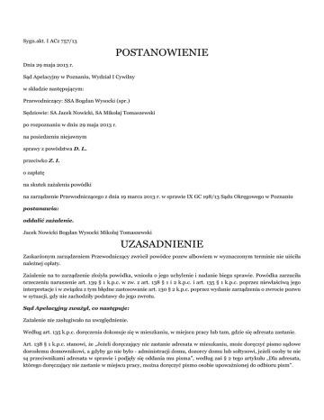 Sygn.akt. I ACz 757/13 POSTANOWIENIE Dnia 29 maja 2013 r. Sąd Apelacyjny w Poznaniu, Wydział I Cywilny w składzie następującym: Przewodniczący: SSA Bogdan Wysocki (spr.) Sędziowie: SA Jacek Nowicki, SA Mikołaj Tomaszewski po rozpoznaniu w dniu 29 maja 2013 r. na posiedzeniu niejawnym sprawy z powództwa D. L. przeciwko Z. I. o zapłatę na skutek zażalenia powódki na zarządzenie Przewodniczącego z dnia 19 marca 2013 r. w sprawie IX GC 198/13 Sądu Okręgowego w Poznaniu postanawia: oddalić zażalenie. Jacek Nowicki Bogdan Wysocki Mikołaj Tomaszewski UZASADNIENIE Zaskarżonym zarządzeniem Przewodniczący zwrócił powódce pozew albowiem w wyznaczonym terminie nie uiściła należnej opłaty. Zażalenie na to zarządzenie złożyła powódka, wniosła o jego uchylenie i nadanie biegu sprawie. Powódka zarzuciła orzeczeniu naruszenie art. 139 § 1 k.p.c. w zw. z art. 138 § 1 i 2 k.p.c. i art. 135 § 1 k.p.c. poprzez niewłaściwą jego interpretacje i w związku z tym błędne zastosowanie art. 130 § 2 k.p.c. poprzez wydanie zarządzenia o zwrocie pozwu w sytuacji, gdy nie zachodziły podstawy do jego zwrotu. Sąd Apelacyjny zważył, co następuje: Zażalenie nie zasługiwało na uwzględnienie. Według art. 135 k.p.c. doręczenia dokonuje się w mieszkaniu, w miejscu pracy lub tam, gdzie się adresata zastanie. Art. 138 § 1 k.p.c. stanowi, że „Jeżeli doręczający nie zastanie adresata w mieszkaniu, może doręczyć pismo sądowe dorosłemu domownikowi, a gdyby go nie było - administracji domu, dozorcy domu lub sołtysowi, jeżeli osoby te nie są przeciwnikami adresata w sprawie i podjęły się oddania mu pisma", według zaś § 2 tego artykułu „Dla adresata, którego doręczający nie zastanie w miejscu pracy, można doręczyć pismo osobie upoważnionej do odbioru pism". Żaląca zarzuciła, że doręczyciel nie wyczerpał wszystkich możliwości doręczenia przewidzianych w art. 138 § 1 k.p.c. i nie starał się doręczyć pisma w miejscu pracy powódki, która jest lekarzem rodzinnym i jest osobą powszechnie znaną w społeczności lokalnej (art. 138 § 2 k.p.c.). W związku z tym pozostawienie pisma w urzędzie pocztowym było niedopuszczalne (art. 139 § 1 k.p.c.). Zarzuty te nie są zasadne. Art. 135 k.p.c. wskazuje miejsca doręczenia tzw. właściwego (do rąk adresata), przy czym o dwóch pierwszych z nich („w mieszkaniu", „w miejscu pracy") decyduje sąd, umieszczając na piśmie odpowiedni adres, przy czym pierwszeństwo ma doręczenie w mieszkaniu (w miejscu zamieszkania - art. 126 § 2 k.p.c.), a dopiero w razie trudności z tym związanych - w miejscu pracy. Doręczyciel nie ma obowiązku poszukiwać miejsca pracy adresata, jeśli nie jest ono wskazane w adresie podanym przez sąd. Doręczenie „tam, gdzie się adresata zastanie" może nastąpić wtedy, gdy nie można go dokonać ani w "mieszkaniu", ani w "miejscu pracy". Może to nastąpić np. w razie spotkania adresata przez doręczyciela na ulicy, przy czym - doręczyciel nie ma obowiązku poszukiwania adresata, gdy nie wie, gdzie on przebywa (zob. postanowienie Sądu Najwyższego z dnia 27 stycznia 1998 r., III CKN 620/97, OSNC 1998/9/146). Wobec tego nie zasługuje na uwzględnienie zarzut naruszenia art. 138 § 2 k.p.c., skoro pismo było adresowane na miejsce zamieszkania powódki, a nie jej miejsca pracy. Trafnie wskazała żaląca, że warunkiem złożenia pisma w urzędzie pocztowym i pozostawienie adresatowi tzw. awiza jest brak możliwości doręczenia właściwego i niemożność doręczenia zastępczego przewidzianego w art. 138 § 1 k.p.c. (lub w art. 138 § 2 k.p.c. - co niniejszej sprawy nie dotyczy). Wynika to ze sformułowania art. 139 § 1 k.p.c. Jednakże nie zasługują na uwzględnienia jej twierdzenia, że doręczyciel powinien wyczerpać wszystkie możliwości doręczenia wymienione w art. 138 § 1 k.p.c. i dopiero wówczas, gdy to się stanie może mieć zastosowanie art. 139 § 1 k.p.c. Dla zastosowania art. 139 § 1 k.p.c. wystarczy niemożność doręczenia w jeden ze sposobów wymienionych w art. 138 § 1 lub § 2 k.p.c. (w zależności od adresu podanego przez sąd). Wobec tego przewodniczący prawidłowo uznał, że powódce doręczono wezwanie do uiszczenia opłaty od wniesionego powództwa w dniu 12 marca 2013 r. w trybie doręczenia zastępczego ( art. 139 § 1 k.p.c.) i termin do uiszczenia tej opłaty minął jej bezskutecznie z dniem 19 marca 2013 r. Zatem pozew na podstawie art. 130 § 2 k.p.c. podlegał zwrotowi. Mając to na uwadze, Sąd Apelacyjny na podstawie art. 385 k.p.c. w zw. z art. 397 § 2 k.p.c. i art. 398 k.p.c. oddalił zażalenie powódki jako bezzasadne. Jacek Nowicki Bogdan Wysocki Mikołaj Tomaszewski