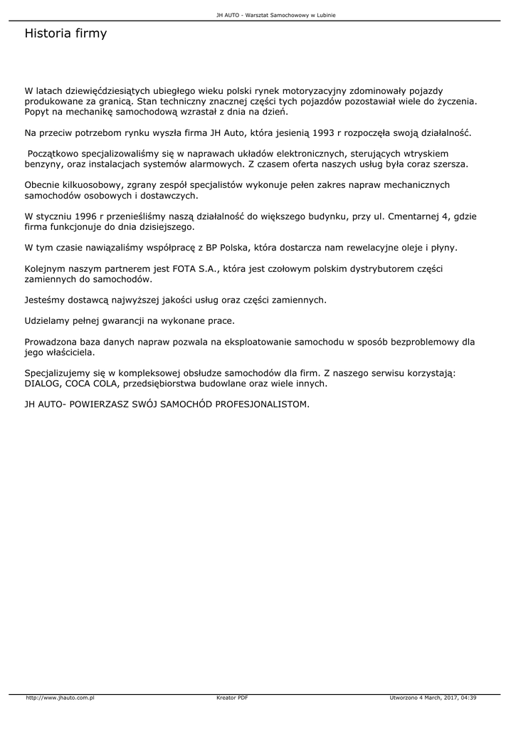 JH AUTO - Warsztat Samochowowy w Lubinie Historia firmy W latach dziewięćdziesiątych ubiegłego wieku polski rynek motoryzacyjny zdominowały pojazdy produkowane za granicą. Stan techniczny znacznej części tych pojazdów pozostawiał wiele do życzenia. Popyt na mechanikę samochodową wzrastał z dnia na dzień. Na przeciw potrzebom rynku wyszła firma JH Auto, która jesienią 1993 r rozpoczęła swoją działalność. Początkowo specjalizowaliśmy się w naprawach układów elektronicznych, sterujących wtryskiem benzyny, oraz instalacjach systemów alarmowych. Z czasem oferta naszych usług była coraz szersza. Obecnie kilkuosobowy, zgrany zespół specjalistów wykonuje pełen zakres napraw mechanicznych samochodów osobowych i dostawczych. W styczniu 1996 r przenieśliśmy naszą działalność do większego budynku, przy ul. Cmentarnej 4, gdzie firma funkcjonuje do dnia dzisiejszego. W tym czasie nawiązaliśmy współpracę z BP Polska, która dostarcza nam rewelacyjne oleje i płyny. Kolejnym naszym partnerem jest FOTA S.A., która jest czołowym polskim dystrybutorem części zamiennych do samochodów. Jesteśmy dostawcą najwyższej jakości usług oraz części zamiennych. Udzielamy pełnej gwarancji na wykonane prace. Prowadzona baza danych napraw pozwala na eksploatowanie samochodu w sposób bezproblemowy dla jego właściciela. Specjalizujemy się w kompleksowej obsłudze samochodów dla firm. Z naszego serwisu korzystają: DIALOG, COCA COLA, przedsiębiorstwa budowlane oraz wiele innych. JH AUTO- POWIERZASZ SWÓJ SAMOCHÓD PROFESJONALISTOM. http://www.jhauto.com.pl Kreator PDF Utworzono 4 March, 2017, 04:39