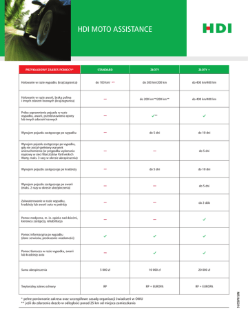HDI MOTO ASSISTANCE 35=<.ě$'2:<=$.5(63202&< Holowanie w razie wypadku (kraj/zagranica) 67$1'$5' do 100 km/ Holowanie w razie awarii, braku paliwa LLQQ\FK]GDU]HĞORVRZ\FKNUDM]DJUDQLFD =ě27< =ě27< do 200 km/200 km do 400 km/400 km do 200 km**/200 km** do 400 km/400 km 3UyEDXVSUDZQLHQLDSRMD]GXZUD]LH wypadku, awarii, przedziurawienia opony OXELQQ\FK]GDU]HĞORVRZ\FK ** :\QDMHPSRMD]GX]DVWĆSF]HJRSRZ\SDGNX do 5 dni :\QDMHPSRMD]GX]DVWĆSF]HJRSRZ\SDGNX JG\QLH]RVWDĜVSHĜQLRQ\ZDUXQHN unieruchomienia (w przypadku wykonania QDSUDZ\ZVLHFL:DUV]WDWyZ3DUWQHUVNLFK :DUW\PDNVUD]\ZRNUHVLHXEH]SLHF]HQLD do 10 dni do 5 dni :\QDMHPSRMD]GX]DVWĆSF]HJRSRNUDG]LHł\ do 5 dni do 10 dni :\QDMHPSRMD]GX]DVWĆSF]HJRSRDZDULL PDNVUD]\ZRNUHVLHXEH]SLHF]HQLD do 5 dni =DNZDWHURZDQLHZUD]LHZ\SDGNX NUDG]LHł\OXEDZDULLDXWDZSRGUył\ do 2 dób 3RPRFPHG\F]QDPLQRSLHNDQDGG]LHúPL NLHURZFD]DVWĆSF]\UHKDELOLWDFMD Pomoc informacyjna po wypadku GDQHVHUZLVyZSU]HND]DQLHZLDGRPRĮFL 3RPRFWĜXPDF]DZUD]LHZ\SDGNXDZDULL OXENUDG]LHł\DXWD Suma ubezpieczenia 7HU\WRULDOQ\]DNUHVRFKURQ\ ]Ĝ ]Ĝ ]Ĝ RP RP + EUROPA RP + EUROPA 06+$66 SHĜQHSRUyZQDQLH]DNUHVXRUD]V]F]HJyĜRZH]DVDG\RUJDQL]DFMLĮZLDGF]HĞZ2:8 MHĮOLGR]GDU]HQLDGRV]ĜRZRGOHJĜRĮFLSRQDGNPRGPLHMVFD]DPLHV]NDQLD
