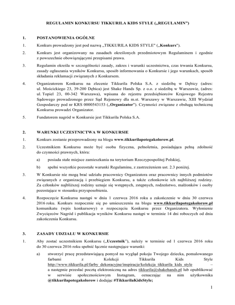 REGULAMIN KONKURSU TIKKURILA KIDS STYLE („REGULAMIN”) 1. POSTANOWIENIA OGÓLNE 1. Konkurs prowadzony jest pod nazwą „TIKKURILA KIDS STYLE" („Konkurs"). 2. Konkurs jest organizowany na zasadach określonych przedmiotowym Regulaminem i zgodnie z powszechnie obowiązującymi przepisami prawa. 3. Regulamin określa w szczególności zasady, zakres i warunki uczestnictwa, czas trwania Konkursu, zasady ogłaszania wyników Konkursu, sposób informowania o Konkursie i jego warunkach, sposób składania reklamacji związanych z Konkursem. 4. Organizatorem Konkursu na zlecenie Tikkurila Polska S.A. z siedzibą w Dębicy (adres: ul. Mościckiego 23, 39-200 Dębica) jest Shake Hands Sp. z o.o. z siedzibą w Warszawie, (adres: ul. Topiel 23, 00-342 Warszawa), wpisana do rejestru przedsiębiorców Krajowego Rejestru Sądowego prowadzonego przez Sąd Rejonowy dla m.st. Warszawy w Warszawie, XIII Wydział Gospodarczy pod nr KRS 0000543153 („Organizator"). Czynności związane z obsługą techniczną Konkursu prowadzi Organizator. 5. Fundatorem nagród w Konkursie jest Tikkurila Polska S.A. 2. WARUNKI UCZESTNICTWA W KONKURSIE 1. Konkurs zostanie przeprowadzony na blogu www.tikkurilapotegakolorow.pl. 2. Uczestnikiem Konkursu może być osoba fizyczna, pełnoletnia, posiadająca pełną zdolność do czynności prawnych, która: a) posiada stałe miejsce zamieszkania na terytorium Rzeczypospolitej Polskiej, b) spełni wszystkie pozostałe warunki Regulaminu, z zastrzeżeniem ust. 2.3 poniżej. 3. W Konkursie nie mogą brać udziału pracownicy Organizatora oraz pracownicy innych podmiotów związanych z organizacją i przebiegiem Konkursu, a także członkowie ich najbliższej rodziny. Za członków najbliższej rodziny uznaje się wstępnych, zstępnych, rodzeństwo, małżonków i osoby pozostające w stosunku przysposobienia. 4. Rozpoczęcie Konkursu nastąpi w dniu 1 czerwca 2016 roku a zakończenie w dniu 30 czerwca 2016 roku. Konkurs rozpocznie się po umieszczeniu na blogu www.tikkurilapotegakolorow.pl komunikatu (wpis konkursowy) o rozpoczęciu Konkursu przez Organizatora. Wyłonienie Zwycięzców Nagród i publikacja wyników Konkursu nastąpi w terminie 14 dni roboczych od dnia zakończenia Konkursu. 3. ZASADY UDZIAŁU W KONKURSIE 1. Aby zostać uczestnikiem Konkursu („Uczestnik”), należy w terminie od 1 czerwca 2016 roku do 30 czerwca 2016 roku spełnić łącznie następujące warunki: a) stworzyć pracę przedstawiającą pomysł na wygląd pokoju Twojego dziecka, pomalowanego farbami z Kolekcji Tikkurila Kids Style http://www.tikkurila.pl/farby_dekoracyjne/inspiracje/kolekcja_tikkurila_kids_style – a następnie przesłać pocztą elektroniczną na adres [email protected] lub opublikować w serwisie społecznościowym Instagram, oznaczając na nim użytkownika @tikkurilapotegakolorow i dodając #TikkurilaKidsStyle; 1 b) do zgłoszenia załączyć opis, w tym w szczególności następujące informacje: (i) (ii) na jaki kolor chciałbyś przemalować pokój dziecka (pamiętaj, że wskazany kolor musi pochodzić z palety kolorów Tikkurila Kids Style), którą z farb z Kolekcji Tikkurila Kids Style tj. tablicową, magnetyczną, perłową czy świecącą w ciemności, uważasz za najciekawsze rozwiązanie do pokoju dziecięcego, c) (iii) które z farb z Kolekcji Tikkurila Kids Style tj. tablicowa, magnetyczna, perłowa czy świecąca w ciemności najbardziej przypadną do gustu Twojemu dziecku, (iv) uzasadnij krótko dlaczego to Ty powinieneś wygrać; przesłane zgłoszenia i komentarze muszą być efektem autorskiej pracy zgłaszającego. 2. Jeden Uczestnik może dokonać nie więcej niż trzech zgłoszeń konkursowych. W wypadku, gdy Uczestnik dokona więcej niż 3 (trzy) zgłoszenia, Organizator nie dopuści do Konkursu takiego dodatkowego zgłoszenia jako niezgodnego z Regulaminem. 3. Uczestnik przyjmuje do wiadomości, że praca konkursowa powinna spełniać poniższe warunki: a) praca konkursowa oraz opis jest wynikiem osobistej twórczości Uczestnika (Uczestnik jest autorem zdjęcia zgłoszonego przez niego do Konkursu oraz opisu dołączonego do pracy); b) zgłoszenie nie zawiera wulgaryzmów, treści obraźliwych, z obowiązującymi przepisami prawa lub dobrymi obyczajami; c) zgłoszenie nie zawiera treści reklamowych jakichkolwiek podmiotów, z wyłączeniem treści reklamowych dotyczących marki Tikkurila (nazwa lub logo innej marki lub produktu innej marki nie mogą być widoczne na zdjęciu ani użyte w opisie); oraz d) nie może naruszać praw osób trzecich, w tym autorskich praw osobistych i majątkowych osób trzecich, lub dóbr osobistych osób trzecich, a w przypadku, gdy zdjęcie lub opis zgłoszone przez uczestnika do Konkursu stanowią utwór, w rozumieniu ustawy z dnia 4 lutego 1994 r. o prawie autorskim i prawach pokrewnych, Uczestnikowi przysługują autorskie prawa majątkowe do takiego zdjęcia lub opisu. treści sprzecznych 4. Uczestnik zgłaszający swój udział w konkursie, w przypadku wygranej udziela Organizatorowi zgody na prezentowanie pracy konkursowej na profilach marki Tikkurila w mediach społecznościowych i blogu Tikkurila www.tikkurilapotegakolorow.pl oraz w materiałach reklamowych publikowanych w serwisach Facebook i Instagram. 5. Uczestnik jest zobowiązany do zapoznania się z Regulaminem, jak i jego ewentualnymi zmianami, które mogą być wprowadzone w trakcie trwania Konkursu. Przystąpienie do Konkursu poprzez wykonanie czynności, o których mowa w ust. 3.1 powyżej oznacza wyrażenie zgody na udział w Konkursie na zasadach określonych w Regulaminie i jest możliwe tylko i wyłącznie po wyrażeniu przez Uczestnika zgody na przetwarzanie danych osobowych przez Organizatora w zakresie określonym w Regulaminie oraz wiąże się z przekazaniem przez Uczestnika będącego autorem pracy konkursowej następujących danych osobowych Uczestnika: a) imię i nazwisko; b) nick w serwisie społecznościowym Instagram; c) adres e-mail;