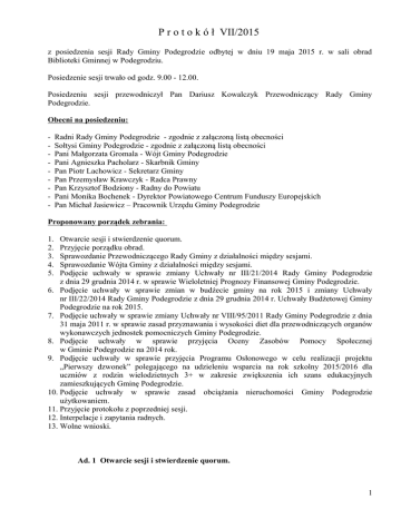 P r o t o k ó ł VII/2015 z posiedzenia sesji Rady Gminy Podegrodzie odbytej w dniu 19 maja 2015 r. w sali obrad Biblioteki Gminnej w Podegrodziu. Posiedzenie sesji trwało od godz. 9.00 - 12.00. Posiedzeniu sesji przewodniczył Pan Dariusz Kowalczyk Przewodniczący Rady Gminy Podegrodzie. Obecni na posiedzeniu: - Radni Rady Gminy Podegrodzie - zgodnie z załączoną listą obecności Sołtysi Gminy Podegrodzie - zgodnie z załączoną listą obecności Pani Małgorzata Gromala - Wójt Gminy Podegrodzie Pani Agnieszka Pacholarz - Skarbnik Gminy Pan Piotr Lachowicz - Sekretarz Gminy Pan Przemysław Krawczyk - Radca Prawny Pan Krzysztof Bodziony - Radny do Powiatu Pani Monika Bochenek - Dyrektor Powiatowego Centrum Funduszy Europejskich Pan Michał Jasiewicz – Pracownik Urzędu Gminy Podegrodzie Proponowany porządek zebrania: 1. 2. 3. 4. 5. Otwarcie sesji i stwierdzenie quorum. Przyjęcie porządku obrad. Sprawozdanie Przewodniczącego Rady Gminy z działalności między sesjami. Sprawozdanie Wójta Gminy z działalności między sesjami. Podjęcie uchwały w sprawie zmiany Uchwały nr III/21/2014 Rady Gminy Podegrodzie z dnia 29 grudnia 2014 r. w sprawie Wieloletniej Prognozy Finansowej Gminy Podegrodzie. 6. Podjęcie uchwały w sprawie zmian w budżecie gminy na rok 2015 i zmiany Uchwały nr III/22/2014 Rady Gminy Podegrodzie z dnia 29 grudnia 2014 r. Uchwały Budżetowej Gminy Podegrodzie na rok 2015. 7. Podjęcie uchwały w sprawie zmiany Uchwały nr VIII/95/2011 Rady Gminy Podegrodzie z dnia 31 maja 2011 r. w sprawie zasad przyznawania i wysokości diet dla przewodniczących organów wykonawczych jednostek pomocniczych Gminy Podegrodzie. 8. Podjęcie uchwały w sprawie przyjęcia Oceny Zasobów Pomocy Społecznej w Gminie Podegrodzie na 2014 rok. 9. Podjęcie uchwały w sprawie przyjęcia Programu Osłonowego w celu realizacji projektu „Pierwszy dzwonek” polegającego na udzieleniu wsparcia na rok szkolny 2015/2016 dla uczniów z rodzin wielodzietnych 3+ w zakresie zwiększenia ich szans edukacyjnych zamieszkujących Gminę Podegrodzie. 10. Podjęcie uchwały w sprawie zasad obciążania nieruchomości Gminy Podegrodzie użytkowaniem. 11. Przyjęcie protokołu z poprzedniej sesji. 12. Interpelacje i zapytania radnych. 13. Wolne wnioski. Ad. 1 Otwarcie sesji i stwierdzenie quorum. 1 Pan Dariusz Kowalczyk - Przew. RG - witam Państwa bardzo serdecznie, otwieram sesję Rady Gminy Podgrodzie. Na podstawie listy obecności stwierdzam, że Rada Gminy ma wymagane prawem quorum do podejmowania prawomocnych decyzji. Witam również naszego gościa Panią Monikę Bochenek - Dyrektora Powiatowego Centrum Funduszy Europejskich, która przestawi nam koncepcję zagospodarowania terenu po byłym Zespole Szkół Zawodowych w Podegrodziu. Ad. 2 Przyjęcie porządku obrad. Pan Dariusz Kowalczyk - Przew. RG - Państwo Radni otrzymaliście zaproponowany porządek obrad, czy zatem są jakieś uwagi bądź pytania do porządku obrad. Jeśli nie ma, to chciałem poinformować, że wpłynął jeszcze jeden projekt uchwały od Pani Wójt w sprawie przystąpienia do zmiany miejscowego planu zagospodarowania przestrzennego Gminy Podegrodzie. W związku z powyższym, kto z Państwa radnych jest za rozszerzeniem porządku obrad o dodatkowy projekt uchwały: 15 głosów „Za”, 0 głosów „Przeciw”, 0 głosów „Wstrzymujących się”. Proponuję, żeby projekt uchwały w sprawie przystępujemy do zmiany miejscowego planu zagospodarowania przestrzennego Gminy Podegrodzie był punktem 10-tym czyli przed podjęciem uchwały w zasad obciążania nieruchomości Gminy Podegrodzie użytkowaniem. Kto z Państwa Radnych jest za przyjęciem rozszerzonego porządku obrad o dodatkowy projekt uchwały: 15 głosów „Za”, 0 głosów „Przeciw”, 0 głosów „Wstrzymujących się”. Ad. 3 Sprawozdanie Przewodniczącego Rady Gminy z działalności między sesjami. W okresie sprawozdawczym uczestniczyłem w takich spotkaniach jak: - zagospodarowanie terenu szkoły w Podegrodziu w Starostwie Powiatowym wspólnie z Panią Wójt, z Państwem Radnymi i Panem Sołtysem z Podegrodzia - Gminny Dzień Strażaka w Długołęce-Świerkli - szkolenie w Brzeznej W okresie sprawozdawczym do biura Rady Gminy wpłynęły następujące pisma: - Rada Rodziców Szkoły Podstawowej im. Św. Kingi w Olszance - wniosek o utworzenie świetlicy szkolnej w Szkole Podstawowej w Olszance. Przedmiotowe pismo zostanie przekazane do komisji merytorycznej celem zajęcia stanowiska. - Prezes Sądu Okręgowego w Nowym Sączu - podaje do wiadomości liczbę ławników do Sądu Rejonowego oraz Sądu Okręgowego w Nowym Sączu podlegających wyborowi przez Radę Gminy Podegrodzie. Do Sądu Rejonowego 2 ławników, w tym 2 ławników do Sądu Pracy i do Sądu Okręgowego 2 ławników. Pan Dariusz Kowalczyk - Przew. RG - z mojej strony to wszystko, jeśli są jakieś pytania to służę odpowiedzią. Ad. 4 Sprawozdanie Wójta Gminy z działalności między sesjami. Sprawozdanie z działalności międzysesyjnej od dnia 29.04.2015 do dnia 19.05.2015 przedstawia się następująco: 29 kwietnia 2015: 2 • Podpisanie umowy notarialnej darowizny nieruchomości w celu poszerzenia drogi gminnej położonej w miejscowości Brzezna. 30 kwietnia 2015: • Małopolski Urząd Wojewódzki w Krakowie - złożenie uzupełnień do wniosku „Remont drogi gminnej nr 293924K Strzyganiec- Litacz w km 0+000,00-1+635,00 i nr 293937K Strzyganiec – Chochorowice w km 0+915,00-2+310,00 w miejscowości Brzezna” • Urząd Marszałkowski – złożenie uzupełnień do wniosku pn. „Budowa kanalizacji sanitarnej wraz z przyłączami w Stadłach- Etap II. 5 maja 2015: • Gminne Dni Godności w Podegrodziu. Osób Niepełnosprawnych – Gminny Ośrodek Kultury 6 maja 2015: • Przegląd dorobku artystycznego placówek oświatowych Gminy Podegrodzie – Gminny Ośrodek Kultury w Podegrodziu. • Urząd Skarbowy w Nowym Sączu – spotkanie z p. Naczelnik Beatą Orzeł 