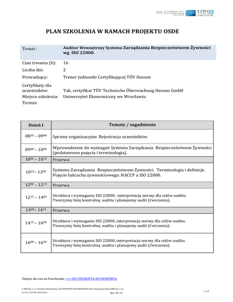 PLAN SZKOLENIA W RAMACH PROJEKTU OSDE Temat : Auditor Wewnętrzny Systemu Zarządzania Bezpieczeństwem Żywności Czas trwania (h): 16 Liczba dni: 2 Prowadzący: Trener Jednostki Certyfikującej TÜV Hessen Certyfikaty dla uczestników: Miejsce szkolenia: Termin Tak, certyfikat TÜV Technische Überwachung Hessen GmbH Uniwersytet Ekonomiczny we Wrocławiu wg ISO 22000. Tematy / zagadnienia Dzień I 0830 – 0900 Sprawy organizacyjne. Rejestracja uczestników. 0900 – 1000 Wprowadzenie do wymagań Systemu Zarządzania Bezpieczeństwem Żywności (podstawowe pojęcia i terminologia). 1000 – 1015 Przerwa 1015– 1200 Systemu Zarządzania Bezpieczeństwem Żywności. Terminologia i definicje. Pojęcie łańcucha żywnościowego. HACCP a ISO 22000. 1200 – 1215 Przerwa 1215 – 1400 Struktura i wymagania ISO 22000, interpretacja normy dla celów auditu. Tworzymy listę kontrolną auditu i planujemy audit (ćwiczenia). 1400– 1415 Przerwa 1415 – 1600 Struktura i wymagania ISO 22000, interpretacja normy dla celów auditu. Tworzymy listę kontrolną auditu i planujemy audit (ćwiczenia). 1600 – 1630 Struktura i wymagania ISO 22000, interpretacja normy dla celów auditu. Tworzymy listę kontrolną auditu i planujemy audit (ćwiczenia). Dołącz do nas na Facebooku >>> OD STUDENTA DO EKSPERTA HRS Sp. z o.o. Projekt szkoleniowy OD STUDENTA DO EKSPERTA jest własnością firmy HRS Sp. z o.o. C5_F11a_IA22000_OSDE.DOCX Rev. 01.15 1z2 Tematy / zagadnienia Dzień II 0830 – 0900 Sprawy organizacyjne. Krótkie przypomnienie tematyki dnia poprzedniego. Poranny Quiz dla uczestników. 0900 – 1000 Procedura auditu wewnętrznego systemu zarządzania bezpieczeństwem żywności – studium przypadku. 1000 – 1015 Przerwa 1015– 1200 Zasady auditowania systemu zarządzania bezpieczeństwem żywności. Kompetencje audytorów - zalecenia PN-EN ISO 19011:2012. Ocena auditorów. Relacje interpersonalne. Test na spostrzegawczość. 1200 – 1215 Przerwa 1215 – 1400 Zapisywanie wniosków z auditu. Formułowanie niezgodności i spostrzeżeń. Ćwiczenia. 1400– 1415 Przerwa 14¹⁵ - 15⁴⁵ Nowe wydanie ISO 9001:2015 i jego wpływ na wymagania ISO 22000. 1545 - 16⁰⁰ Test wiedzy i zakończenie szkolenia. Uczestnicy otrzymują materiały szkoleniowe (skrypt), oraz certyfikat kompetencji. Informacje dodatkowe: • • • • • Cena szkolenia/warsztatów obejmuje: udział w szkoleniu, materiały szkoleniowe w formie skryptu, dostęp do normy na potrzeby warsztatów/szkolenia, certyfikat imienny dwujęzyczny (język polski i jeden język obcy do wyboru: angielski lub niemiecki ). Certyfikaty wystawione przez HRS/TÜV Hessen są nadzorowane. W projekcie szkoleniowym OD STUDENTA DO EKSPERTA nie ma wskazania na konieczność posiadania przez kandydatów wiedzy, która będzie klasyfikowana, jako wiedza specjalistyczna. Wymagana jest jednak znajomość podstawowych zagadnień z typowego zakresu dla szkolenia na poziomie umożliwiającym rozpoznanie powiązań, ich zrozumieniu i uporządkowaniu. Kryterium doświadczenia zawodowego nie jest wymagane na każdym z etapów szkolenia. Potwierdzeniem zdobytych umiejętności przez uczestnika szkolenia lub warsztatu jest certyfikat lub zaświadczenie. Certyfikat i zaświadczenie jest wystawiane bez ograniczenia ważności i zawiera logo Jednostki Certyfikującej TÜV Hessen lub HRS. Certyfikaty i zaświadczenia są rejestrowane. Nadzór nad dokumentami i archiwizowanie w wersji elektronicznej w formacie pdf .lub jpg. prowadzi HRS. Program szkoleniowy realizowany w ramach przedstawionego projektu, wykorzystuje zbiór dobrych praktyk i rozwiązań opracowanych i stosowanych w organizacjach charakteryzujących się zróżnicowaną strukturą. Dołącz do nas na Facebooku >>> OD STUDENTA DO EKSPERTA HRS Sp. z o.o. Projekt szkoleniowy OD STUDENTA DO EKSPERTA jest własnością firmy HRS Sp. z o.o. C5_F11a_IA22000_OSDE.DOCX Rev. 01.15 2z2