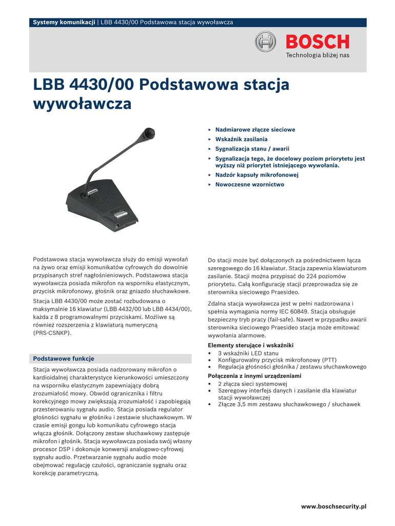 Systemy komunikacji | LBB 4430/00 Podstawowa stacja wywoławcza LBB 4430/00 Podstawowa stacja wywoławcza ▶ Nadmiarowe złącze sieciowe ▶ Wskaźnik zasilania ▶ Sygnalizacja stanu / awarii ▶ Sygnalizacja tego, że docelowy poziom priorytetu jest wyższy niż priorytet istniejącego wywołania. ▶ Nadzór kapsuły mikrofonowej ▶ Nowoczesne wzornictwo Podstawowa stacja wywoławcza służy do emisji wywołań na żywo oraz emisji komunikatów cyfrowych do dowolnie przypisanych stref nagłośnieniowych. Podstawowa stacja wywoławcza posiada mikrofon na wsporniku elastycznym, przycisk mikrofonowy, głośnik oraz gniazdo słuchawkowe. Do stacji może być dołączonych za pośrednictwem łącza szeregowego do 16 klawiatur. Stacja zapewnia klawiaturom zasilanie. Stacji można przypisać do 224 poziomów priorytetu. Całą konfigurację stacji przeprowadza się ze sterownika sieciowego Praesideo. Stacja LBB 4430/00 może zostać rozbudowana o maksymalnie 16 klawiatur (LBB 4432/00 lub LBB 4434/00), każda z 8 programowalnymi przyciskami. Możliwe są również rozszerzenia z klawiaturą numeryczną (PRS‑CSNKP). Zdalna stacja wywoławcza jest w pełni nadzorowana i spełnia wymagania normy IEC 60849. Stacja obsługuje bezpieczny tryb pracy (fail-safe). Nawet w przypadku awarii sterownika sieciowego Praesideo stacja może emitować wywołania alarmowe. Podstawowe funkcje Elementy sterujące i wskaźniki • 3 wskaźniki LED stanu • Konfigurowalny przycisk mikrofonowy (PTT) • Regulacja głośności głośnika / zestawu słuchawkowego Stacja wywoławcza posiada nadzorowany mikrofon o kardioidalnej charakterystyce kierunkowości umieszczony na wsporniku elastycznym zapewniający dobrą zrozumiałość mowy. Obwód ogranicznika i filtru korekcyjnego mowy zwiększają zrozumiałość i zapobiegają przesterowaniu sygnału audio. Stacja posiada regulator głośności sygnału w głośniku i zestawie słuchawkowym. W czasie emisji gongu lub komunikatu cyfrowego stacja włącza głośnik. Dołączony zestaw słuchawkowy zastępuje mikrofon i głośnik. Stacja wywoławcza posiada swój własny procesor DSP i dokonuje konwersji analogowo-cyfrowej sygnału audio. Przetwarzanie sygnału audio może obejmować regulację czułości, ograniczanie sygnału oraz korekcję parametryczną. Połączenia z innymi urządzeniami • 2 złącza sieci systemowej • Szeregowy interfejs danych i zasilanie dla klawiatur stacji wywoławczej • Złącze 3,5 mm zestawu słuchawkowego / słuchawek www.boschsecurity.pl 2 | LBB 4430/00 Podstawowa stacja wywoławcza Dane techniczne Certyfikaty i świadectwa Region Certyfikacja Europa CE Parametry elektryczne TUEVSUED TUV GL GL Zewnętrzny zasilacz sieciowy 18 - 56 VDC Pobór mocy 4,4 W (DC) (bez klawiatur) Mikrofon Standardy bezpieczeństwa IEC 60065-98 Odporność EN 55103-2 Emisja EN 55103-1 / FCC-47 część 15B Znamionowy wejściowy poziom sygnału akustycznego 75 - 90 dB SPL Stosunek sygnał / szum >60 dB przy 85 dB SPL Pasmo przenoszenia 340 Hz - 14 kHz (-3 dB) Głośnik Stosunek sygnał / szum Zgodność z normami EVAC IEC 60849 / BS 5839-8 (certyfikat TÜV) 80 dB przy maks. sygnale wyjściowym Poziom ciśnienia akustycznego 85 dB (SPL) przy 0,5 m i 1 kHz Zestaw słuchawkowy Planowanie Złącze 3,5 mm, jack Zalecany typ Hosiden HBH 0058 Parametry mechaniczne 1 3 3 (< 16) 2 A/D D/A 4 O 90 x 160 x 200 mm Masa 0,95 kg Montaż stołowy Kolor grafitowy 6 Długość wspornika elastyczne- 380 mm go 7 Parametry środowiskowe 8 Temperatura pracy PTT I Wymiary (wys. x szer. x gł.) -5 ÷ +45°C Temperatura przechowywania -20 ÷ +70°C 9 5 9 1 Zestaw słuchawkowy 2 Mikrofon 3 Klawiatura(y) 4 Sterownik sieciowy i DSP 5 Przełączanie nadmiarowości sieci 6 Zasilanie / błąd 7 Stan stacji wywoławczej 8 Stan sieci 9 Połączenia sieciowe Dołączone części Ilość Element 1 Podstawowa stacja wywoławcza LBB 4430/00 1 Kabel płaski Wilgotność 15 - 90% Ciśnienie atmosferyczne 600 - 1100 hPa LBB 4430/00 Podstawowa stacja wywoławcza | 3 Zamówienia - informacje LBB 4430/00 Podstawowa stacja wywoławcza posiada mikrofon na wsporniku elastycznym, przycisk mikrofonowy, głośnik oraz gniazdo słuchawkowe. LBB4430/00 Sprzęt LBB 4434/00 Zestaw klawiatury stacji wywoławczej jest stosowany w połączeniu z zestawem stacji wywoławczej lub podstawową stacją wywoławczą do emisji bieżących wywołań lub komunikatów cyfrowych do dowolnie wybranych stref lub do uruchamiania określonych funkcji systemowych. LBB4434/00 LBB 4432/00 Klawiatura stacji wywoławczej posiada osiem programowanych przycisków, każdy z dwukolorową diodą LED stanu. LBB4432/00 PRS‑CSNKP Klawiatura numeryczna może zostać wykorzystana na potrzeby uzyskiwania dostępu przez użytkownika, wyboru strefy lub grupy stref. Wyświetlacz LCD z informacjami zwrotnymi dla użytkownika. PRS-CSNKP www.boschsecurity.pl 4 | LBB 4430/00 Podstawowa stacja wywoławcza Poland Robert Bosch Sp. z o.o. Jutrzenki 105 str. 02-231 Warszawa Phone: +48 22 715 4101 Fax: +48 22 715 4105 [email protected] www.boschsecurity.pl © Robert Bosch Sp. z o.o./ Security Systems 2009 | Zastrzega się możliwość wprowadzania zmian T2318830603 | Cur: pl-PL, V5, 28 Sep 2009 | Src: en-US, V0, 23 May 2008 Represented by