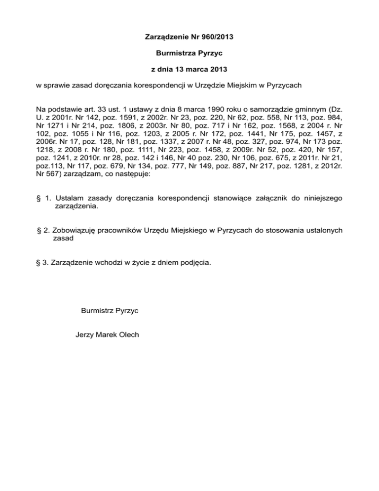 Zarządzenie Nr 960/2013 Burmistrza Pyrzyc z dnia 13 marca 2013 w sprawie zasad doręczania korespondencji w Urzędzie Miejskim w Pyrzycach Na podstawie art. 33 ust. 1 ustawy z dnia 8 marca 1990 roku o samorządzie gminnym (Dz. U. z 2001r. Nr 142, poz. 1591, z 2002r. Nr 23, poz. 220, Nr 62, poz. 558, Nr 113, poz. 984, Nr 1271 i Nr 214, poz. 1806, z 2003r. Nr 80, poz. 717 i Nr 162, poz. 1568, z 2004 r. Nr 102, poz. 1055 i Nr 116, poz. 1203, z 2005 r. Nr 172, poz. 1441, Nr 175, poz. 1457, z 2006r. Nr 17, poz. 128, Nr 181, poz. 1337, z 2007 r. Nr 48, poz. 327, poz. 974, Nr 173 poz. 1218, z 2008 r. Nr 180, poz. 1111, Nr 223, poz. 1458, z 2009r. Nr 52, poz. 420, Nr 157, poz. 1241, z 2010r. nr 28, poz. 142 i 146, Nr 40 poz. 230, Nr 106, poz. 675, z 2011r. Nr 21, poz.113, Nr 117, poz. 679, Nr 134, poz. 777, Nr 149, poz. 887, Nr 217, poz. 1281, z 2012r. Nr 567) zarządzam, co następuje: § 1. Ustalam zasady doręczania korespondencji stanowiące załącznik do niniejszego zarządzenia. § 2. Zobowiązuję pracowników Urzędu Miejskiego w Pyrzycach do stosowania ustalonych zasad § 3. Zarządzenie wchodzi w życie z dniem podjęcia. Burmistrz Pyrzyc Jerzy Marek Olech Załącznik do zarządzenia Nr …../2013 Burmistrza Pyrzyc z dnia ….......... ZASADY DORĘCZANIA KORESPONDENCJI Rozdział 1 CEL § 1 Celem niniejszego opracowania jest: 1. obniżenie kosztów wysyłki korespondencji, 2. zwiększenie skuteczności doręczania korespondencji, 3. skrócenie okresu: od wysyłki korespondencji do otrzymania informacji zwrotnej. Rozdział 2 GONIEC (DORĘCZYCIEL) § 2. Korespondencja miejscowa wychodząca z Urzędu do adresatów zamieszkujących na terenie Miasta jest doręczana przy udziale własnych pracowników tj. gońców zatrudnionych w Urzędzie Miejskim w Pyrzycach lub osób, którym zlecono doręczanie na podstawie umów cywilnoprawnych, z zastrzeżeniem § 11 oraz rozdziału 5. § 3. Goniec pracuje w godzinach popołudniowych, co zwiększa skuteczność doręczenia przesyłki. § 4. Czas pracy gońca określa Regulamin pracy lub umowa. § 5. Kierownik Wydziału nadzorujący pracę gońca jest zobowiązany przeszkolić gońca w zakresie przepisów Kodeksu postępowania administracyjnego oraz ustawy Ordynacja podatkowa dotyczących doręczeń oraz zasad wewnętrznych przyjętych w Urzędzie. § 6. Gońcy doręczają również materiały informacyjne Urzędu np. broszury, ulotki, ankiety. § 7. Goniec podejmuje próbę doręczenia korespondencji co najmniej dwukrotnie w następujących po sobie kolejnych dniach roboczych o różnych godzinach. W przypadkach przesyłek gabarytowych (niemieszczących się w kopercie) goniec może pozostawić zawiadomienie już po pierwszej próbie doręczenia. § 8. Listy miejscowe adresowane na skrytkę pocztową, przesyłki wartościowe, przesyłki za pobraniem oraz listy zawierające informacje niejawne doręczane są za pośrednictwem Poczty Polskiej. § 9. W przypadku pism złożonych w Punkcie Informacyjnym w poniedziałek po godzinie 12.00, w pozostałe dni po godzinie 11.00 pierwsza próba doręczenia pisma do adresata nastąpi w następnym dniu roboczym. § 10. Wszelkie problemy organizacyjne związane z trudnościami w terminowym doręczaniu korespondencji goniec ma obowiązek zgłaszać na bieżąco kierownikowi wydziału nadzorującemu jego pracę. § 11. W uzasadnionych przypadkach przesyłki miejscowe mogą być pomocniczo wysyłane za pośrednictwem usługodawcy zewnętrznego (np. Poczty Polskiej). Rozdział 3 PUNKT INFORMACYJNY § 12. Każda przesyłka przed wysłaniem rejestrowana jest w Punkcie Informacyjnym. § 13. Celem rejestracji przesyłek w Punkcie Informacyjnym w danym dniu niezbędne jest ich dostarczenie do godziny 14 tego dnia. § 14. Pracownicy Punktu Informacyjnego nie przyjmują nieprawidłowo. pism zaadresowanych § 15. Pracownicy Punktu Informacyjnego wydają adresatom pisma pozostawione w Urzędzie. § 16. Pracownik Punktu Informacyjnego wzywa pracownika właściwego dla danej korespondencji w celu ustalenia możliwości wydania pisma adresatowi w przypadku różnicy adresu na piśmie i w dowodzie tożsamości. § 17 Pracownik Punktu Informacyjnego w pierwszej kolejności informuje gońca o przedłożonej przez pracowników komórek organizacyjnych korespondencji „wrażliwej” tzn. takiej, od której terminowości doręczenia zależy dalszy tok danej sprawy. Rozdział 4 OBOWIĄZKI PRACOWNIKÓW § 18. Pisma, za wyjątkiem zaproszeń, życzeń i innej korespondencji o charakterze okazjonalnym, grzecznościowym są doręczane do adresatów za zwrotnym potwierdzeniem odbioru. § 19. Pracownicy komórki organizacyjnej, z której pochodzi pismo, są zobowiązani do prawidłowego i czytelnego adresowania pisma oraz opisania zwrotnego potwierdzenia odbioru ze wskazaniem znaku sprawy lub komórki organizacyjnej w przypadku pism nie zawierających znaku, która dokonuje wysyłki. § 20. Pracownicy w przypadku nie otrzymania w terminie do 14 dni od daty nadania pisma zwrotnego potwierdzenia odbioru z doręczonej korespondencji komórki organizacyjnej są zobowiązani poinformować kierownika nadzorującego pracę gońca o braku zwrotnego potwierdzenia odbioru. Brak zgłoszeń ze strony komórek organizacyjnych w wymienionym terminie oznaczać będzie, iż komórka otrzymała potwierdzenie doręczenia pisma. § 21. Pracownik komórki organizacyjnej zobowiązany jest zgłosić w Punkcie Informacyjnym wymagany termin doręczenia korespondencji „wrażliwej” tzn. takiej, od której terminowości doręczenia zależy dalszy tok danej sprawy. Graniczny termin doręczenia korespondencji powinien być odnotowany w sposób dowolny lecz pozwalający potwierdzić jego zgłoszenie (np. w rejestrze korespondencji wychodzącej lub na zwrotnym potwierdzeniu odbioru). § 22. Przesyłki wielkogabarytowe należy dostarczać do Punktu Informacyjnego po uprzednim uzgodnieniu terminu wysyłki. § 23. W przypadkach okresowo zwiększonych obowiązków związa