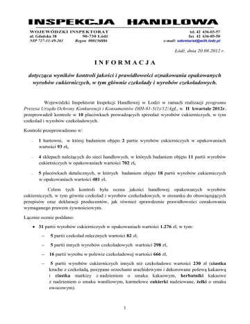-------------------------------------------------------------------------------------------------------------------WOJEWÓDZKI INSPEKTORAT ul. Gdańska 38 90-730 Łódź NIP 727-11-49-261 Regon 000136886 tel. 42 636-03-57 fax 42 636-85-50 e-mail: [email protected] Łódź, dnia 20.08.2012 r. INFORMACJA dotycząca wyników kontroli jakości i prawidłowości oznakowania opakowanych wyrobów cukierniczych, w tym głównie czekolady i wyrobów czekoladowych. Wojewódzki Inspektorat Inspekcji Handlowej w Łodzi w ramach realizacji programu Prezesa Urzędu Ochrony Konkurencji i Konsumentów DIH-81-5(1)/12/AgŁ, w II kwartale 2012r. przeprowadził kontrole w 10 placówkach prowadzących sprzedaż wyrobów cukierniczych, w tym czekolad i wyrobów czekoladowych. Kontrole przeprowadzono w: 1 hurtowni, w której badaniem objęto 2 partie wyrobów cukierniczych w opakowaniach wartości 93 zł, 4 sklepach należących do sieci handlowych, w których badaniem objęto 11 partii wyrobów cukierniczych w opakowaniach wartości 702 zł, 5 placówkach detalicznych, w których badaniem objęto 18 partii wyrobów cukierniczych w opakowaniach wartości 481 zł. Celem tych kontroli była ocena jakości handlowej opakowanych wyrobów cukierniczych, w tym gównie czekolad i wyrobów czekoladowych, w stosunku do obowiązujących przepisów oraz deklaracji producentów, jak również sprawdzenie prawidłowości oznakowania wymaganego prawem żywnościowym. Łącznie ocenie poddano: 31 partii wyrobów cukierniczych w opakowaniach wartości 1.276 zł, w tym: 5 partii czekolad mlecznych wartości 82 zł, 5 partii innych wyrobów czekoladowych wartości 298 zł, 16 partii wyrobu w polewie czekoladowej wartości 666 zł, 5 partii wyrobów cukierniczych innych niż czekoladowe wartości 230 zł (ciastka kruche z czekoladą, posypane orzechami arachidowymi i dekorowane polewą kakaową i ciastka markizy z nadzieniem o smaku kakaowym, herbatniki kakaowe z nadzieniem o smaku waniliowym, karmelowe cukierki nadziewane, żelki o smaku owocowym). 1 Ponadto badaniem (w tym laboratoryjnym) objęto 1 partię wyrobu cukierniczego (inny wyrób czekoladowy) oferowanego do sprzedaży luzem wartości 54 zł. Nieprawidłowości stwierdzono w 4 placówkach detalicznych tj. w 40% objętych kontrolą. W toku prowadzonych czynności kontrolnych zakwestionowano ogółem 3 partie czekolad mlecznych łącznej wartości 36 zł. 1. J A K O Ś Ć W zakresie zgodności parametrów jakościowych z wymaganiami obowiązujących przepisów lub deklaracjami producentów, zbadano laboratoryjnie 9 partii wyrobów cukierniczych w opakowaniach wartości 563 zł, w tym: 1 partię wartości 42 zł w hurtowni, 5 partii wartości 378 zł w sklepach należących do sieci handlowych, 3 partie wartości 143 zł w placówkach detalicznych, Ocenie poddano: 2 partie innych wyrobów czekoladowych w opakowaniach wartości 195 zł (czekoladki nadziewane), 5 partii wyrobów w polewie czekoladowej wartość 180 zł, 2 partie wyrobów cukierniczych innych niż czekoladowe wartości 188 zł (ciastka kruche z czekoladą, posypane orzechami arachidowymi i dekorowane polewą kakaową i ciastka markizy z nadzieniem o smaku kakaowym). Wszystkie objęte badaniem wyroby cukiernicze spełniały wymagania jakościowe określone w obowiązujących przepisach oraz zadeklarowane na opakowaniach jednostkowych. Ponadto badaniem objęto 1 partię wyrobu cukierniczego (inny wyrób czekoladowy) oferowanego do sprzedaży luzem wartości 54 zł, który również spełniał wymagania jakościowe określone w obowiązujących przepisach oraz zadeklarowane na opakowaniu zbiorczym. 2. O Z N A C Z E N I A Prawidłowość oznakowania wyrobów cukierniczych badano we wszystkich kontrolowanych placówkach, w których ocenie poddano 28 partii wyrobów cukierniczych w opakowaniach (badaniem nie objęto 3 partii czekolad mlecznych wartości 36 zł, z uwagi na przekroczone daty minimalnej trwałości) o łącznej wartości 1.240 zł, w tym: - 2 partie wartości 93 zł w hurtowni, 11 partii wartości 702 zł w 4 sklepach sieci handlowych, 15 partii wartości 445 zł w 5 placówkach detalicznych, nie stwierdzając nieprawidłowości. Kontrolą objęto: 2 partie czekolad mlecznych wartości 46 zł, 5 partii innych wyrobów czekoladowych wartości 298 zł, 2 16 partii wyrobu w polewie czekoladowej wartości 666 zł, 5 partii wyrobów cukierniczych innych niż czekoladowe wartości 230 zł. Stwierdzono, że objęte kontrolą wyroby cukiernicze, w tym czekolady i wyroby w polewie czekoladowej nie zawierały (zgodnie z deklaracją producentów podaną na etykietach) w swoim składzie substancji dodatkowych niedozwolonych. DOWODY DOSTAW W trakcie kontroli stwierdzono, ze przedsiębiorcy przestrzegali art. 18 ust. 2 rozporządzenia (WE) nr 178/2002 Parlamentu Europejskiego i Rady z dnia 28 stycznia 2002 r. ustanawiającego ogólne zasady i wymagania prawa żywnościowego, powołującego Europejski Urząd ds. Bezpieczeństwa Żywności oraz ustanawiającego procedury w zakresie bezpieczeństwa żywności(Dz. U. L31 z 01.02.2002). Na objęte kontrolą wyroby przedsiębiorcy okazali dowody dostaw, które umożliwiały identyfikację każdej osoby dostarczającej środek spożywczy do placówki. 3. PRZESTRZEGANIE DAT MINIMALNEJ TRWAŁOŚCI Przestrzeganie dat minimalnej trwałości towarów sprawdzono we wszystkich kontrolowanych placówkach. Badaniem objęto 31 partii wyrobów cukierniczych w opakowaniach, w tym czekolad i wyrobów w polewie czekoladowej wartości łącznej 1.276 zł. Nieprawidłowości stwierdzono w 1 placówce (10 %). W sprzedaży znajdowały się 3 partie czekolad mlecznych wartości 36 zł po upływie dat minimalnej trwałości. Przeterminowane czekolady zostały wycofane z obrotu handlowego, a wobec osoby odpowiedzialnej zastosowano przepisy prawa o wykroczeniach. 4. RZECZYWISTA ZAWARTOŚĆ PRODUKTU Niedoborów masy netto w stosunku do deklarowanej przez producentów na opakowaniach jednostko