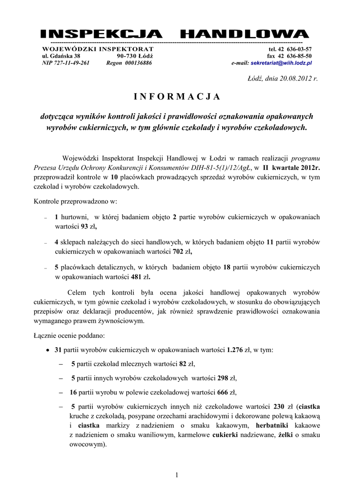 informacja - Wojewódzki Inspektorat Inspekcji Handlowej w Łodzi