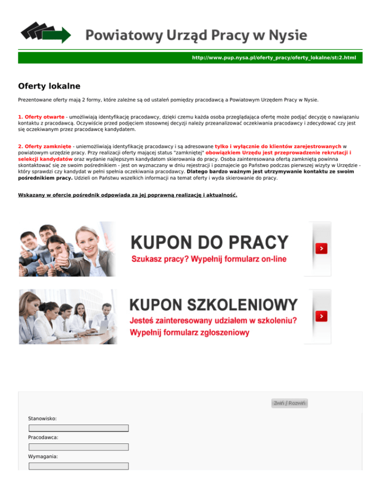 http://www.pup.nysa.pl/oferty_pracy/oferty_lokalne/st:2.html Oferty lokalne Prezentowane oferty mają 2 formy, które zależne są od ustaleń pomiędzy pracodawcą a Powiatowym Urzędem Pracy w Nysie. 1. Oferty otwarte - umożliwiają identyfikację pracodawcy, dzięki czemu każda osoba przeglądająca ofertę może podjąć decyzję o nawiązaniu kontaktu z pracodawcą. Oczywiście przed podjęciem stosownej decyzji należy przeanalizować oczekiwania pracodawcy i zdecydować czy jest się oczekiwanym przez pracodawcę kandydatem. 2. Oferty zamknięte - uniemożliwiają identyfikację pracodawcy i są adresowane tylko i wyłącznie do klientów zarejestrowanych w powiatowym urzędzie pracy. Przy realizacji oferty mającej status "zamkniętej" obowiązkiem Urzędu jest przeprowadzenie rekrutacji i selekcji kandydatów oraz wydanie najlepszym kandydatom skierowania do pracy. Osoba zainteresowana ofertą zamkniętą powinna skontaktować się ze swoim pośrednikiem - jest on wyznaczany w dniu rejestracji i poznajecie go Państwo podczas pierwszej wizyty w Urzędzie który sprawdzi czy kandydat w pełni spełnia oczekiwania pracodawcy. Dlatego bardzo ważnym jest utrzymywanie kontaktu ze swoim pośrednikiem pracy. Udzieli on Państwu wszelkich informacji na temat oferty i wyda skierowanie do pracy. Wskazany w ofercie pośrednik odpowiada za jej poprawną realizację i aktualność. Oferty zamieszczone na tej stronie są aktualizowane raz dziennie. Wszystkie zmiany i nowe oferty zgłoszone do PUP w danym dniu, ukażą się na stronie następnego dnia roboczego. ostatnia aktualizacja: 03.03.2017 Wyszukiwarka ofert: Stanowisko: Pracodawca: Wymagania: ( kliknij aby pokazać / ukryć ) Ważne od (rrrr-mm-dd): Kategoria: wszystkie ▼ Wyszukaj oferty: - Wszystkie - Oferty lokalne - Dla niepełnosprawnych - Staże - Prace interwencyjne - Roboty publiczne - Oferta konkursowa - Doposażenie stanowiska pracy X znaleziono ofert: 106 (strona 2/6) ● ● ● ● ● ● 1 2 3 4 5 6 Stanowisko Referent ds. transportu Asystent Zarządu Sprzedawca Nr oferty Lokalizacja Ważna od HLT sp. z o.o. StPr/17/0619 48-340 Głuchołazy, ul. Grunwaldzka 2a 2017-03-03 HLT sp. z o.o. StPr/17/0618 48-340 Głuchołazy, ul. Grunwaldzka 2a 2017-03-03 Oferta zamknięta. Dane pracodawcy dostępne w urzędzie StPr/17/0611 Nysa 2017-03-02 Pracownik działu handlowego Sprzątaczka Pracodawca Majewski Fensterfabrik Sp. z o.o StPr/17/0614 48-300 Nysa, ul. SAPERSKA 9 2017-03-02 Finance & Property Management StPr/17/0612 48-300 Skorochów, ul. 21k 2017-03-02 Nauczyciel Kucharz Kamieniarz Zespół Placówek Specjalnych StPr/17/0615 48-300 Nysa, ul. GRODKOWSKA 54 2017-03-02 Finance & Property Management StPr/17/0613 48-300 Skorochów, ul. 21k 2017-03-02 Oferta zamknięta. Dane pracodawcy dostępne w urzędzie StPr/17/0610 Otmuchów 2017-03-02 Kierowca autobusu Kierowca ciągnika siodłowego Monter zabudowy do pojazdów samochodowych EDBUS Edward Stencel StPr/17/0624 56-300 Sułów, ul. Żmigrodzka 28 2017-03-01 PTHU Lider Henryk Gąsiorek StPr/17/0601 48-330 Nowy świętów, ul. 97 2017-03-01 Auto-Profi-Studio Sp.C. Halina Szubert, Jan Szubert StPr/17/0597 48-300 Hanuszów, ul. Hanuszów 25 Pracownik wykończenia wnętrz Sprzedawca/kelner FHU Bestbud Andrzej Bronka StPr/17/0587 48-330 Wilamowice Nyskie, ul. Wilamowice Nyskie 18 2017-02-28 Oferta zamknięta. Dane pracodawcy dostępne w urzędzie StPr/17/0584 Gryżów 2017-02-28 Specjalista ds jakości Specjalista ds technicznych Szwaczka Mechanik pojazdów samochodowych 2017-03-01 Fabryka Armatur Głuchołazy s.a. StPr/17/0589 48-340 Głuchołazy, ul. Wrocławska 1A 2017-02-28 Fabryka Armatur Głuchołazy s.a. StPr/17/0588 48-340 Głuchołazy, ul. Wrocławska 1A 2017-02-28 FHU Apis Joanna Adamczyk StPr/17/0550 48-340 Głuchołazy, ul. Kolejowa 8 2017-02-27 Oferta zamknięta. Dane pracodawcy dostępne w urzędzie StPr/17/0561 Nysa 2017-02-27 Sprzedawca Oferta zamknięta. Dane pracodawcy dostępne w urzędzie StPr/17/0557 Goświnowice 2017-02-27 Oczyszczacz konstrukcji stalowych Monter konstrukcji stalowych Montażysta Oferta zamknięta. Dane pracodawcy dostępne w urzędzie StPr/17/0555 Konradowa 2017-02-27 Oferta zamknięta. Dane pracodawcy dostępne w urzędzie StPr/17/0537 Nysa 2017-02-23 Oferta zamknięta. Dane pracodawcy dostępne w urzędzie StPr/17/0385 Jelcz-Laskowice 2017-02-23 Szwacz Tetris Elżbieta Frankiewicz StPr/17/0531 48-321 Wyszków Śląski, ul. Wyszków Śląski 34 A 2017-02-23 Koordynator do spraw rozwoju sieci POLSKA SIEĆ HANDLOWA "PIONIER" SP. Z O.O. StPr/17/0544 48-300 Nysa, ul. Otmuchowska 46 Pomoc kuchenna PHU Agnieszka Żurakowska Dębowe Wzgórze StPr/17/0536 48-267 Pokrzywna, ul. Pokrzywna 48 2017-02-23 Pracownik Gospodarczy Doradca - kasjer Konstruktor PHU Agnieszka Żurakowska Dębowe Wzgórze StPr/17/0539 48-267 Pokrzywna, ul. Pokrzywna 48 2017-02-23 PKO BANK POLSKI SA StPr/17/0533 48-370 Paczków, ul. SIENKIEWICZA 2b 2017-02-23 Oferta zamknięta. Dane pracodawcy dostępne w urzędzie StPr/17/0532 Paczków 2017-02-23 Kierowca samochodu ciężarowego Pracownik magazynowy 2017-02-23 Transport Towarowy Import-Export Mario StPr/17/0516 48-303 Nysa, ul. Pomorska 8 2017-02-22 Oferta zamknięta. Dane pracodawcy dostępne w urzędzie StPr/17/0515 Bielany Wrocławskie 2017-02-22 Szlifierz kamienia Oferta zamknięta. Dane pracodawcy dostępne w urzędzie StPr/17/0528 Kałków 2017-02-22 Pracownik składu opału Kontroler jakości Doradca Klienta Oferta zamknięta. Dane pracodawcy dostępne w urzędzie StPr/17/0529 Kałków 2017-02-22 Oferta zamknięta. Dane pracodawcy dostępne w urzędzie StPr/17/0512 Nysa 2017-02-22 Oferta zamknięta. Dane pracodawcy dostępne w urzędzie StPr/17/0484 Nysa 2017-02-21 Kierowca ciągnika siodłowego Mechanik pojazdów samochodowych Tłumacz języka niemieckiego Opiekunka w żłobku Doradca - kasjer mechanik Sprzedawca Kosmetyczka Recepcjonista Transport Towarowy Franciszek Raczyński StPr/17/0504 48-385 Otmuchów, ul. Rynek 41