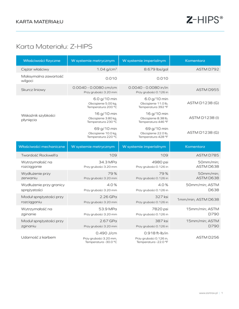 KARTA MATERIAŁU Karta Materiału: Z-HIPS Właściwości fizyczne Ciężar właściwy Maksymalna zawartość wilgoci Skurcz liniowy Wskaźnik szybkości płynięcia Właściwości mechaniczne Twardość Rockwell’a W systemie metrycznym W systemie imperialnym 1.04 g/cm3 8.679 lbs/gal 0.010 0.010 0.0040 - 0.0080 cm/cm 0.0040 - 0.0080 in/in Przy grubości 3.20 mm Przy grubości 0.126 in 6.0 g/10 min 6.0 g/10 min Obciążenie 5.00 kg, Temperatura 200 °C Obciążenie 11.0 lb, Temperatura 392 °F 16 g/10 min 16 g/10 min Obciążenie 3.80 kg, Temperatura 230 °C Obciążenie 8.38 lb, Temperatura 446 °F 69 g/10 min 69 g/10 min Obciążenie 10.0 kg, Temperatura 220 °C Obciążenie 22.0 lb, Temperatura 428 °F W systemie metrycznym 109 W systemie imperialnym ASTM D955 ASTM D1238 (G) ASTM D1238 (I) ASTM D1238 (G) Komentarz ASTM D785 50mm/min; ASTM D638 34.3 MPa 4980 psi Przy grubości 3.20 mm Przy grubości 0.126 in Wydłużenie przy zerwaniu 79 % 79 % Przy grubości 3.20 mm Przy grubości 0.126 in 4.0 % 4.0 % Przy grubości 3.20 mm Przy grubości 0.126 in Moduł sprężystości przy rozciąganiu 2.26 GPa 327 ksi Przy grubości 3.20 mm Przy grubości 0.126 in Wytrzymałość na zginanie 53.9 MPa 7820 psi Przy grubości 3.20 mm Przy grubości 0.126 in Moduł sprężystości przy zginaniu 2.67 GPa 387 ksi Przy grubości 3.20 mm Przy grubości 0.126 in 0.490 J/cm 0.918 ft-lb/in Przy grubości 3.20 mm, Temperatura -30.0 °C Przy grubości 0.126 in, Temperatura -22.0 °F Udarność z karbem ASTM D792 109 Wytrzymałość na rozciąganie Wydłużenie przy granicy sprężystości Komentarz 50mm/min; ASTM D638 50mm/min; ASTM D638 1mm/min; ASTM D638 15mm/min; ASTM D790 15mm/min; ASTM D790 ASTM D256 www.zortrax.pl | 1 KARTA MATERIAŁU Właściwości elektryczne Oporność objętościowa Wytrzymałość elektryczna Odporność na łuk elektryczny Właściwości termiczne W systemie metrycznym W systemie imperialnym 1.00e+14 ohm-cm 1.00e+14 ohm-cm 40.0 kV/mm 1020 kV/in 120 - 180 sec 120 - 180 sec W systemie metrycznym W systemie imperialnym Temperatura ugięcia dla 0.46 MPa (66 psi) 92.0 °C 198 °F Przy grubości 6.40 mm Przy grubości 0.252 in Temperatura ugięcia dla 1.8 MPa (264 psi) 83.0 °C 181 °F Przy grubości 6.40 mm Przy grubości 0.252 in Punkt mięknienia Wskaźnik temperatury względnej, dla właściwości elektrycznych Wskaźnik temperatury względnej, dla właściwości mechanicznych z udarem Wskaźnik temperatury względnej, dla właściwości mechanicznych bez udaru Palność UL94 95.0 °C 203 °F Obciążenie 5.00 kg Obciążenie 11.0 lb 50.0 °C 122 °F Przy grubości ≥1.50 mm Przy grubości ≥0.0591 in 50.0 °C 122 °F Przy grubości ≥3.00 mm Przy grubości ≥0.118 in 50.0 °C 122 °F Przy grubości ≥1.50 mm Przy grubości ≥0.0591 in 50.0 °C 122 °F Przy grubości ≥3.00 mm Przy grubości ≥0.118 in 50.0 °C 122 °F Przy grubości ≥1.50 mm Przy grubości ≥0.0591 in 50.0 °C 122 °F Przy grubości ≥3.00 mm Przy grubości ≥0.118 in HB HB Przy grubości ≥1.60 mm Przy grubości ≥0.0630 in HB HB Przy grubości ≥3.20 mm Przy grubości ≥0.126 in Komentarz ASTM D495 Komentarz Próbka niewygrzewana; ASTM D648 Próbka niewygrzewana; ASTM D648 50°C/h; ASTM D1525 Wiadomości zawarte w dokumencie są przeznaczone do celów informacyjnych i porównawczych. Nie należy ich wykorzystywać do specyfikacji projektu lub oceny jakości. Wpływ na końcowe właściwości materiału mogą mieć (+/-): konstrukcja elementu, jego przeznaczenie, warunki badawcze itd. Rzeczywiste wartości będą różniły się w zależności od warunków druku. Specyfikacja produktu może się zmienić bez uprzedzenia. www.zortrax.pl | 2 KARTA MATERIAŁU Przedstawiona charakterystyka materiału może różnić się w zależności od zastosowania, warunków otoczenia i przeznaczenia. Każdy użytkownik jest odpowiedzialny za używanie materiałów Zortrax zgodnie z zasadami bezpieczeństwa, ich przeznaczeniem oraz prawem, jak również za zgodne z prawem i regulacją środowiskową utylizowanie materiałów. Zortrax nie udziela żadnych gwarancji wyraźnych czy domniemanych, co jednak nie wyłącza gwarancji handlowej, ani przydatności do określonego zastosowania. Zortrax sp. z o.o. Kontakt Wyszyńskiego 1/219 10-457 Olsztyn, Polska NIP: 7393864289 REGON: 281551179 Biuro: [email protected] Sklep: [email protected] Support: [email protected] Zortrax sp. z o.o. Spółka wpisana do rejestru przedsiębiorców Krajowego Rejestru Sądowego prowadzonego przez Sąd Rejonowy w Olsztynie, VIII Wydział Gospodarczy Krajowego Rejestru Sądowego pod numerem KRS 0000490216; o kapitale zakładowym w wysokości 6 800 000 PLN, opłaconym w całości. ©2015, Zortrax sp. z o.o. Wszelkie prawa zastrzeżone. Zortrax, Zortrax M200, Z-ABS, Z-ULTRAT, Z-PCABS, Z-HIPS, Z-GLASS, Z-WOOD, Z-Suite, .zcode są znakami towarowymi Zortrax. www.zortrax.pl | 3
