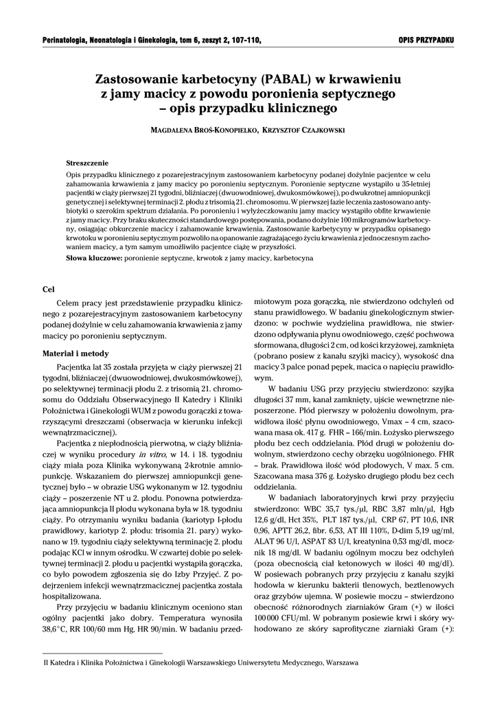 Perinatologia, Neonatologia i Ginekologia, tom 6, zeszyt 2, 107-110, OPIS PRZYPADKU Zastosowanie karbetocyny (PABAL) w krwawieniu z jamy macicy z powodu poronienia septycznego – opis przypadku klinicznego MAGDALENA BROŚ-KONOPIELKO, KRZYSZTOF CZAJKOWSKI Streszczenie Opis przypadku klinicznego z pozarejestracyjnym zastosowaniem karbetocyny podanej dożylnie pacjentce w celu zahamowania krwawienia z jamy macicy po poronieniu septycznym. Poronienie septyczne wystąpiło u 35-letniej pacjentki w ciąży pierwszej 21 tygodni, bliźniaczej (dwuowodniowej, dwukosmówkowej), po dwukrotnej amniopunkcji genetycznej i selektywnej terminacji 2. płodu z trisomią 21. chromosomu. W pierwszej fazie leczenia zastosowano antybiotyki o szerokim spektrum działania. Po poronieniu i wyłyżeczkowaniu jamy macicy wystąpiło obfite krwawienie z jamy macicy. Przy braku skuteczności standardowego postępowania, podano dożylnie 100 mikrogramów karbetocyny, osiągając obkurczenie macicy i zahamowanie krwawienia. Zastosowanie karbetycyny w przypadku opisanego krwotoku w poronieniu septycznym pozwoliło na opanowanie zagrażającego życiu krwawienia z jednoczesnym zachowaniem macicy, a tym samym umożliwiło pacjentce ciążę w przyszłości. Słowa kluczowe: poronienie septyczne, krwotok z jamy macicy, karbetocyna Cel Celem pracy jest przedstawienie przypadku klinicznego z pozarejestracyjnym zastosowaniem karbetocyny podanej dożylnie w celu zahamowania krwawienia z jamy macicy po poronieniu septycznym. Materiał i metody Pacjentka lat 35 została przyjęta w ciąży pierwszej 21 tygodni, bliźniaczej (dwuowodniowej, dwukosmówkowej), po selektywnej terminacji płodu 2. z trisomią 21. chromosomu do Oddziału Obserwacyjnego II Katedry i Kliniki Położnictwa i Ginekologii WUM z powodu gorączki z towarzyszącymi dreszczami (obserwacja w kierunku infekcji wewnątrzmacicznej). Pacjentka z niepłodnością pierwotną, w ciąży bliźniaczej w wyniku procedury in vitro, w 14. i 18. tygodniu ciąży miała poza Klinika wykonywaną 2-krotnie amniopunkcję. Wskazaniem do pierwszej amniopunkcji genetycznej było – w obrazie USG wykonanym w 12. tygodniu ciąży – poszerzenie NT u 2. płodu. Ponowna potwierdzająca amniopunkcja II płodu wykonana była w 18. tygodniu ciąży. Po otrzymaniu wyniku badania (kariotyp I-płodu prawidłowy, kariotyp 2. płodu: trisomia 21. pary) wykonano w 19. tygodniu ciąży selektywną terminację 2. płodu podając KCl w innym ośrodku. W czwartej dobie po selektywnej terminacji 2. płodu u pacjentki wystąpiła gorączka, co było powodem zgłoszenia się do Izby Przyjęć. Z podejrzeniem infekcji wewnątrzmacicznej pacjentka została hospitalizowana. Przy przyjęciu w badaniu klinicznym oceniono stan ogólny pacjentki jako dobry. Temperatura wynosiła 38,6EC, RR 100/60 mm Hg, HR 90/min. W badaniu przed- miotowym poza gorączką, nie stwierdzono odchyleń od stanu prawidłowego. W badaniu ginekologicznym stwierdzono: w pochwie wydzielina prawidłowa, nie stwierdzono odpływania płynu owodniowego, część pochwowa sformowana, długości 2 cm, od kości krzyżowej, zamknięta (pobrano posiew z kanału szyjki macicy), wysokość dna macicy 3 palce ponad pępek, macica o napięciu prawidłowym. W badaniu USG przy przyjęciu stwierdzono: szyjka długości 37 mm, kanał zamknięty, ujście wewnętrzne nieposzerzone. Płód pierwszy w położeniu dowolnym, prawidłowa ilość płynu owodniowego, Vmax – 4 cm, szacowana masa ok. 417 g. FHR – 166/min. Łożysko pierwszego płodu bez cech oddzielania. Płód drugi w położeniu dowolnym, stwierdzono cechy obrzęku uogólnionego. FHR – brak. Prawidłowa ilość wód płodowych, V max. 5 cm. Szacowana masa 376 g. Łożysko drugiego płodu bez cech oddzielania. W badaniach laboratoryjnych krwi przy przyjęciu stwierdzono: WBC 35,7 tys./μl, RBC 3,87 mln/μl, Hgb 12,6 g/dl, Hct 35%, PLT 187 tys./μl, CRP 67, PT 10,6, INR 0,96, APTT 26,2, fibr. 6,53, AT III 110%, D-dim 5,19 ug/ml, ALAT 96 U/l, ASPAT 83 U/l, kreatynina 0,53 mg/dl, mocznik 18 mg/dl. W badaniu ogólnym moczu bez odchyleń (poza obecnością ciał ketonowych w ilości 40 mg/dl). W posiewach pobranych przy przyjęciu z kanału szyjki hodowla w kierunku bakterii tlenowych, beztlenowych oraz grzybów ujemna. W posiewie moczu – stwierdzono obecność różnorodnych ziarniaków Gram (+) w ilości 100 000 CFU/ml. W pobranym posiewie krwi i skóry wyhodowano ze skóry saprofityczne ziarniaki Gram (+): II Katedra i Klinika Położnictwa i Ginekologii Warszawskiego Uniwersytetu Medycznego, Warszawa 108 M. Broś-Konopielko, K. Czajkowski Staphyloccocus epidermidis (ocenione jako prawdopodobne zanieczyszczenie przy pobraniu). Ze względu na cechy infekcji włączono w pierwszej dobie 2-lekową antybiotykoterapię dożylną (Biofuroksym 3 × 750 mg i.v. oraz Metronidazol 3 × 500 mg i.v.). Pacjentka nie wyrażała zgody na indukcję poronienia pomimo utrzymującej się gorączki. W trzeciej dobie hospitalizacji wystąpiło samoistne przedwczesne odpłynięcie płynu owodniowego oraz wystąpienie czynności skurczowej. Po poronieniu obu płodów płci męskiej, bez oznak życia (pierwszy o masie 440 g, drugi o masie 340 g) w sposób instrumentalny ewakuowano łożysko drugiego płodu oraz wyłyżeczkowano jamę macicy oraz podłączono dożylny wlew z 5 jednostek Oksytocyny/500 ml PWE. W około godzinę po zabiegu wystąpiło obfite krwawienie z rozkurczonej macicy. Podano wówczas domięśniowo dodatkowo 1 amp. a 0,2 mg/ml Methylergometrini, uzyskując krótkotrwałe obkurczenie mięśnia macicy. Po około godzinie wystąpiło ponowne rozkurczenie mięśnia macicy oraz krwotok z jamy macicy. Ze względu na utrzymującą się atonię macicy podano dożylnie Karbetocynę w dawce 100 mikrogramów, uzyskując obkurczenie się mięśnia macicy i zahamowanie krwawienia z dróg rodnych. Z powodu dużej utraty krwi podano w dalszej kolejności także Novoseven (2 mg) oraz przetoczono 8j KK
