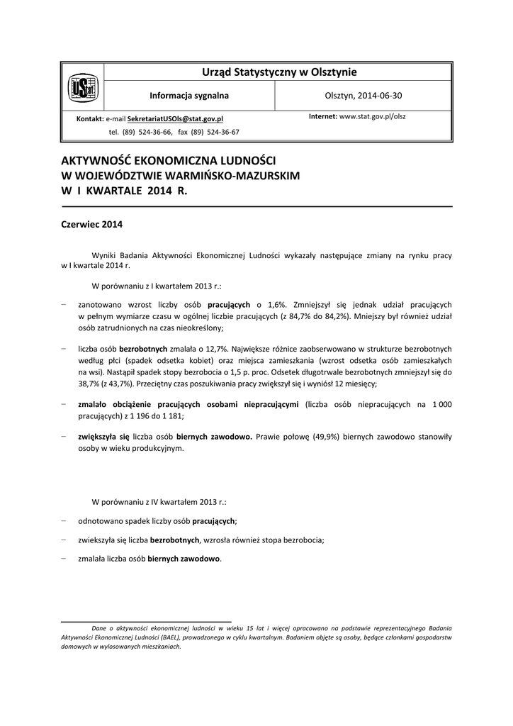 Urząd Statystycczny w Olssztynie Informacjja sygnalna Kontaakt: e‐mail SekretariatUSOls@ @stat.gov.pl Olsztyn, 201 14‐06‐30 Interrnet: www.stat..gov.pl/olsz tel. (89) 524‐36‐66, faxx (89) 524‐36‐67 AKTYW WNOŚĆ EKONOM E ICZNA LU UDNOŚCI W WO OJEWÓDZTTWIE WAR RMIŃSKO O‐MAZURSSKIM W I KWARTALEE 2014 R.. Czerwie ec 2014 W Wyniki Badan nia Aktywnośści Ekonomiczznej Ludności wykazały następujące zmiany na ryn nku pracy w I kwarttale 2014 r. W porównaniu z I kwartałeem 2013 r.: − zano otowano wzrrost liczby osób o pracująących o 1,6 6%. Zmniejszył się jednaak udział prracujących w peełnym wymiarze czasu w ogólnej o liczbiee pracujących (z 84,7% do 84,2%). Mnieejszy był równ nież udział osób b zatrudnionyych na czas nieeokreślony; − liczb ba osób bezrobotnych zmallała o 12,7%. Największe ró óżnice zaobserrwowano w sttrukturze bezrobotnych według płci (spaadek odsetka kobiet) orazz miejsca zam mieszkania (w wzrost odsetkka osób zamieszkałych na wsi). w Nastąpił spadek s stopy bezrobocia b o 1,5 1 p. proc. Od dsetek długotrwale bezrobo otnych zmniejszył się do 38,7 7% (z 43,7%). Przeciętny P czass poszukiwania pracy zwiększył się i wynió ósł 12 miesięccy; − zmalało obciąże enie pracująccych osobam mi niepracująącymi (liczbaa osób niep pracujących na 1 000 praccujących) z 1 196 1 do 1 181; − zwię ększyła się licczba osób bie ernych zawod dowo. Prawie e połowę (49,9%) biernych h zawodowo stanowiły osob by w wieku prrodukcyjnym. W porównaniu z IV kwartałłem 2013 r.: − odno otowano spad dek liczby osó ób pracujących h; − zwieekszyła się liczzba bezrobotn nych, wzrosła również stopaa bezrobocia; − zmalała liczba osó ób biernych zaawodowo. D Dane o aktywno ości ekonomiczneej ludności w wieku 15 lat i wiięcej opracowano na podstawie reprezentacyjneego Badania Aktywnościi Ekonomicznej Lu udności (BAEL), prowadzonego p w cyklu kwartalnym m. Badaniem objjęte są osoby, będące członkami gospodarstw g domowych w wylosowanych h mieszkaniach. TABL. 1. LUDNOŚĆ AKTYWNA I BIERNA ZAWODOWO W WIEKU 15 LAT I WIĘCEJ Aktywni zawodowo Ogółem KWARTAŁY razem pracujący w tys. bezrobotni Bierni zawodowo 2013 .................................... I II III IV 1 122 1 127 1 165 1 178 582 587 611 608 511 513 538 552 71 73 73 56 540 540 554 570 2014 .................................... I 1 132 581 519 62 551 STRUKTURA LUDNOŚCI W WIEKU 15 LAT I WIĘCEJ WEDŁUG AKTYWNOŚCI EKONOMICZNEJ W I KWARTALE 2014 R. WOJEWÓDZTWO 48,7% POLSKA 45,8% 43,9% pracujący bezrobotni 50,2% aktywni zawodowo bierni zawodowo 5,5% 5,9% TABL. 2. AKTYWNOŚĆ EKONOMICZNA LUDNOŚCI W WIEKU 15 LAT I WIĘCEJ WEDŁUG GRUP WIEKU I POZIOMU WYKSZTAŁCENIA W I KWARTALE 2014 R. Współ‐ Aktywni zawodowo czynnik Bierni Wskaźnik Stopa aktywno‐ Ludność zatrud‐ bezrobo‐ pracu‐ bezro‐ zawodo‐ ści WYSZCZEGÓLNIENIE razem wo cia jący botni zawodo‐ nienia wej w tys. w% Ogółem ........................................ 1 132 581 519 62 551 51,3 45,8 10,7 mężczyźni ................................ kobiety .................................... 544 588 321 260 290 229 31 31 223 328 59,0 44,2 53,3 38,9 9,7 11,9 miasta ........................................ wieś ........................................... 713 419 377 204 339 180 38 24 336 215 52,9 48,7 47,5 43,0 10,1 11,8 845 157 211 186 185 392 571 37 171 155 141 78 509 26 151 140 129 73 62 11 20 15 11 5 275 120 40 32 45 314 67,6 23,6 81,0 83,3 76,2 19,9 60,2 16,6 71,6 75,3 69,7 18,6 10,9 29,7 11,7 9,7 7,8 6,4 211 236 115 251 319 165 150 53 155 58 156 137 46 135 45 10 13 7 19 13 46 86 62 97 261 78,2 63,6 46,1 61,8 18,2 73,9 58,1 40,0 53,8 14,1 6,1 8,7 13,2 12,3 22,4 Według grup wieku: w tym w wieku produkcyjnym a 15–24 lata ................................... 25–34 .......................................... 35–44 .......................................... 45–54 .......................................... 55 lat i więcej .............................. Według poziomu wykształcenia: wyższe ........................................ policealne i średnie zawodowe ... średnie ogólnokształcące ............ zasadnicze zawodowe ................ gimnazjalne i niższe .................... a Mężczyźni 18–64 lata, kobiety 18–59 lat. 2 TABL. 3. AKTYWNI ZAWODOWO WEDŁUG PŁCI I MIEJSCA ZAMIESZKANIA 2013 I kwartał IV kwartał WYSZCZEGÓLNIENIE 2014 I kwartał I kw. 2013 = 100 w tys. IV kw. 2013 = 100 Ogółem ........................... 582 608 581 99,8 95,6 mężczyźni .................... kobiety ........................ 323 259 340 268 321 260 99,4 100,4 94,4 97,0 miasta ........................... wieś .............................. 373 209 382 227 377 204 101,1 97,6 98,7 89,9 WSKAŹNIKI AKTYWNOŚCI ZAWODOWEJ LUDNOŚCI W WIEKU 15 LAT I WIĘCEJ 75 % 60 45 30 współczynnik aktywności zawodowej 15 wskaźnik zatrudnienia 0 I kw. 2012 II kw. III kw. IV kw. I kw. 2013 II kw. III kw. TABL. 4. PRACUJĄCY WEDŁUG PŁCI I MIEJSCA ZAMIESZKANIA 2013 I kwartał IV kwartał WYSZCZEGÓLNIENIE IV kw. I kw. 2014 2014 I kwartał I kw. 2013 = 100 w tys. IV kw. 2013 = 100 Ogółem ........................... 511 552 519 101,6 94,0 mężczyźni .................... kobiety ........................ 286 225 309 243 290 229 101,4 101,8 93,9 94,2 miasta ........................... wieś .............................. 329 182 347 205 339 180 103,0 98,9 97,7 87,8 STRUKTURA PRACUJĄCYCH WEDŁUG WIEKU I WYKSZTAŁCENIA W I KWARTALE 2014 R. WIEK WYKSZTAŁCENIE gimnazjalne i niższe 15–24 lata 55 lat i więcej 14,1% 5,0% 25–34 lata 45–54 lata 24,9% wyższe 8,7% 29,0% 30,0% zasadnicze zawodowe 26,0% 26,4% 27,0% 8,9% średnie ogólnokształcące 35–44 lata 3 średnie zawodowe TABL. 5. BEZROBOTNI WEDŁUG PŁCI I MIEJSCA ZAMIESZKANIA 2013 I kwartał IV kwartał WYSZCZEGÓLNIENIE 2014 I kwartał I kw. 2013 = 100 w tys. IV kw. 2013 = 100 Ogółem .......................... 71 56 62 87,3 110