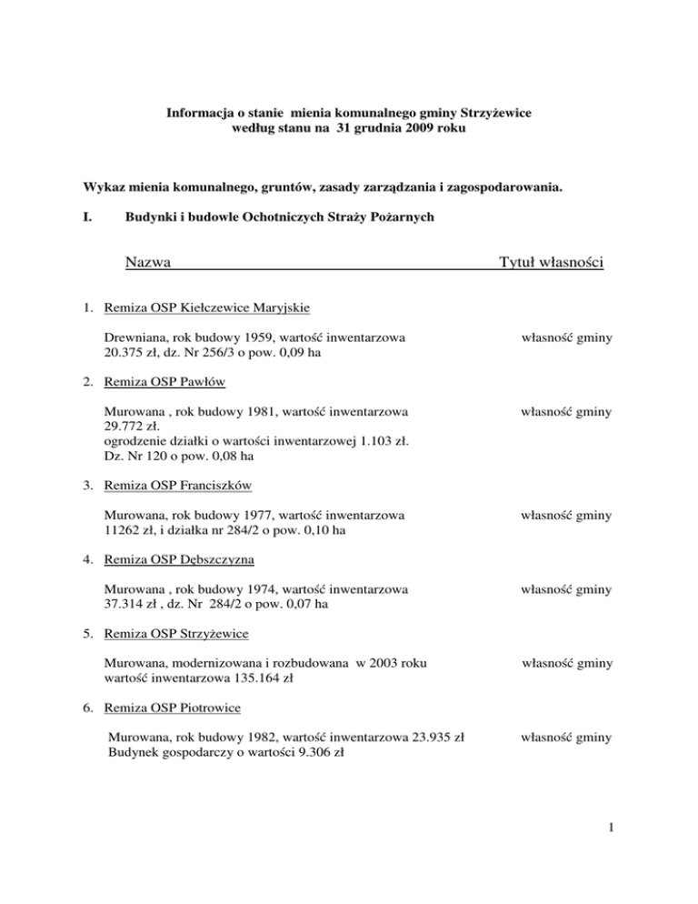 Informacja o stanie mienia komunalnego gminy Strzyżewice według stanu na 31 grudnia 2009 roku Wykaz mienia komunalnego, gruntów, zasady zarządzania i zagospodarowania. I. Budynki i budowle Ochotniczych Straży Pożarnych Nazwa Tytuł własności 1. Remiza OSP Kiełczewice Maryjskie Drewniana, rok budowy 1959, wartość inwentarzowa 20.375 zł, dz. Nr 256/3 o pow. 0,09 ha własność gminy 2. Remiza OSP Pawłów Murowana , rok budowy 1981, wartość inwentarzowa 29.772 zł. ogrodzenie działki o wartości inwentarzowej 1.103 zł. Dz. Nr 120 o pow. 0,08 ha własność gminy 3. Remiza OSP Franciszków Murowana, rok budowy 1977, wartość inwentarzowa 11262 zł, i działka nr 284/2 o pow. 0,10 ha własność gminy 4. Remiza OSP Dębszczyzna Murowana , rok budowy 1974, wartość inwentarzowa 37.314 zł , dz. Nr 284/2 o pow. 0,07 ha własność gminy 5. Remiza OSP Strzyżewice Murowana, modernizowana i rozbudowana w 2003 roku wartość inwentarzowa 135.164 zł własność gminy 6. Remiza OSP Piotrowice Murowana, rok budowy 1982, wartość inwentarzowa 23.935 zł Budynek gospodarczy o wartości 9.306 zł własność gminy 1 7. Remiza OSP Osmolice Murowana , rok budowy 1962, wartość inwentarzowa 53.894 zł Ogrodzenie działki o wartości 2.960 zł Stacja DSP o wartości 3.619,64 zł Dz. Nr 786 o pow. 0,19 ha. własność gminy 8. Remiza OSP Bystrzyca Stara Murowana , rok budowy 1967, wartość inwentarzowa 30.974 zł Ogrodzenie działki o wartości 3.512 zł Dz. Nr 458/2 o pow. 0,16 ha własność gminy 9. Remiza OSP Kiełczewice Górne Murowana, rok budowy 1991, wartość inwentarzowa 53.218 zł własność gminy II. Budynki administracyjne, mieszkalne, gospodarcze i inne 1. Budynek biurowy Strzyżewice Murowany, rok budowy 1974. Modernizowany i rozbudowany w 1984 roku. W 2003 roku wyremontowano kotłownię węglową na gazową. Wartość inwentarzowa 664.602 zł W 2004 roku zmieniona konstrukcje i pokrycie dachu na budynku . W roku 2005 ocieplono budynek oraz wykonano elewację zewnętrzną. gmina 2051/2300 Poczta Polska 249/2300 2. Budynek gospodarczy w Strzyżewicach Zasiek na opał przy hydroforni w Strzyżewicach, rok budowy 1992. Wartość inwentarzowa 1.204 zł Działka 966/2 o pow. 0,25 ha własność gminy 3. Budynek mieszkalny w Piotrowicach Rok budowy 1930. Jest to budynek po dawnym Urzędzie Gminy. W budynku zamieszkują 2 rodziny. Wartość inwentarzowa 48.955 zł własność gminy 4. Budynek świetlicy CKiP w Piotrowicach Rok budowy 1934. Budynek jednokondygnacyjny. W 2003 roku wykonano instalację c.o gazową. W roku 2006 wykonano wymianę pokrycia dachowego oraz remont instalacji c.o w części budynku W roku 2007 rozbudowano instalację c.o oraz wymieniono okna. Aktualna wartość inwentarzowa wynosi 248.023 zł własność gminy 2 5. Budynek biurowy – Pałac w Piotrowicach Murowany dwór z II połowy XIX wieku. Wzniesiony w kształcie litery L, dwukondygnacyjny z poddaszem. Podpiwniczony w 60%. Powierzchnia ogólna 900 m². W roku 2006 wymieniono stolarkę okienną. Wartość inwentarzowa wynosi 88.977 zł własność gminy 6. Budynek Przedszkola w Piotrowicach Budynek murowany jednokondygnacyjny ze stropodachem. Rok budowy 1976. Remontowany w 2003 roku. W grudniu dokonano kolejnego remontu o wartości 9945,39zł Wartość inwentarzowa 116.714,50 zł własność gminy 7. Budynek mieszkalny położony w parku w Piotrowicach Budynek jednokondygnacyjny, murowany z kamienia częściowo podpiwniczony. Wartość inwentarzowa po aktualizacji w 1997 roku wynosi 0 własność gminy 8. Sklep w Piotrowicach Budynek przejęty od POM Piotrowice w styczniu 2003 roku. wartość inwentarzowa 1.809 zł własność gminy 9. Budynek mieszkalny murowany, rok budowy 1968 Wartość inwentarzowa 8.610 zł. Adoptowany na budynek mieszkalny w roku 1999 po dawnej poczcie – położony w Piotrowicach Dz. Nr 230/1 o pow. 0,21 ha własność gminy 10. Budynek gospodarczy wybudowany w 1968 roku w Piotrowicach Budynek po dawnym punkcie szewskim. Wartość inwentarzowa 455 zł, dz. Nr 230/1 o pow. 0,21 ha własność gminy 11. Budynek gospodarczy wybudowany w 1968 roku w Piotrowicach Garaże za budynkiem dawnego UG. Wartość inwentarzowa 7.181 zł Dz. Nr 230/1 o pow. 0,21 ha własność gminy 12. Sklep w Pawłowie Przekazany gminie w 2000 roku, wartość inwentarzowa 4.932 zł własność gminy 3 13. Budynek sklepu w Osmolicach Pierwszych Budynek przejęty od GS „Samopomoc Chłopska” za wygaśniecie zobowiązań podatkowych Dz. Nr 729/1 o pow. 0,08 ha Wartość inwentarzowa 46.960,00 własność gminna 14. Budynek zaplecza klubu sportowego w Piotrowicach Pomieszczenia klubu zostały częściowo wydzielone z Przedszkola w Piotrowicach , wyremontowane oraz powiększone Wartość inwentarzowa 179.373 zł własność gminna 15. Budynek po zlewni mleka w Pawłowie Budynek przejęty nieodpłatnie od Okręgowej Spółdzielni Mleczarskiej w Bychawie w maju 2009 r. Wartość inwentarzowa 12.281,00 zł własność gminna Stacje i sieć wodociągowa 1. Budynek hydroforni w Pawłowie Przyjęty z komunalizacji w 1992 roku. Wartość inwentarzowa 25.988 zł własność gminna 2. Budynek hydroforni w Strzyżewicach Wybudowany w 1992 roku, wartość inwentarzowa 40.227 zł Ogrodzenie stacji o wartości 10.188 zł własność gminy 3. Budynek hydroforni w Osmolicach Murowany, przejęty w drodze komunalizacji w 1992 roku Wartość inwentarzowa 17.400 zł własność gminy 4. Budynek hydroforni w Kiełczewicach Maryjskich Murowany, rok budowy 1996 na dz. Nr 217/2 Wartość inwentarzowa 6.095 zł własność gminy 5. Budynek hydroforni we Franciszkowie Murowany, rok budowy 1996 rok Wartość inwentarzowa 13.846 zł własność gminy 4 6. Budynek pompowni w Kolonii Kiełczewice Dolne Budynek oddany w październiku 2009r. Wartość inwentarzowa 76.183,33 zł własność gminy 7. Wodociąg Strzyżewice Długość sieci wodociągowej z przyłączami 18,5 km dla 188 odbiorców Wartość inwentarzowa 488.290 zł własno
