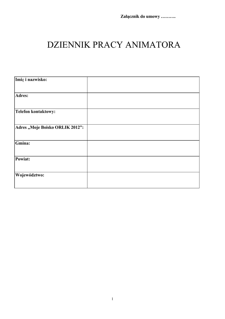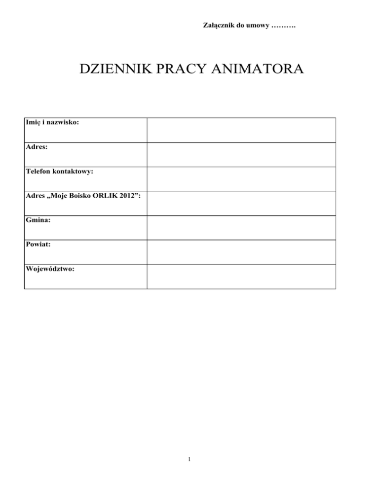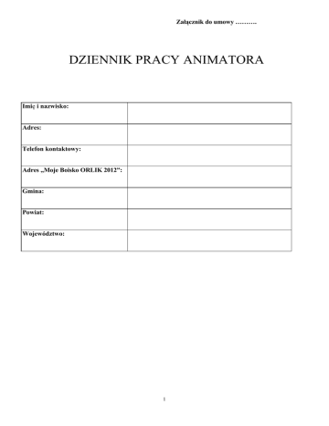 Załącznik do umowy ………. DZIENNIK PRACY ANIMATORA Imię i nazwisko: Adres: Telefon kontaktowy: Adres „Moje Boisko ORLIK 2012”: Gmina: Powiat: Województwo: 1 Wykonanie pracy „Animatora” w miesiącu ………………………..rok…………………. 1 tydzień TERMINARZ PRACY Data Godziny zajęć Grupa (liczebność) TEMAT – TREŚĆ ZAJĘĆ Godziny zajęć Grupa (liczebność) TEMAT – TREŚĆ ZAJĘĆ Godziny zajęć Grupa (liczebność) TEMAT – TREŚĆ ZAJĘĆ Godziny zajęć Grupa (liczebność) TEMAT – TREŚĆ ZAJĘĆ Poniedziałek Data Wtorek Data Środa Data Czwartek 2 Data Godziny zajęć Grupa (liczebność) TEMAT – TREŚĆ ZAJĘĆ Godziny zajęć Grupa (liczebność) TEMAT – TREŚĆ ZAJĘĆ Godziny zajęć Grupa (liczebność) TEMAT – TREŚĆ ZAJĘĆ Piątek Data Sobota Data Niedziela *Podsumowanie liczby przepracowanych godzin przez „animatora” w tygodniu od ___________________ do _______________ suma godzin : __________ *Podsumowanie liczebności uczestników w tygodniu: ______________ ************************************************************************************************ * sporządza animator Wykonanie pracy „animatora” w miesiącu ………………………..rok…………………. 3 2 tydzień TERMINARZ PRACY Data Godziny zajęć Grupa (liczebność) TEMAT – TREŚĆ ZAJĘĆ Godziny zajęć Grupa (liczebność) TEMAT – TREŚĆ ZAJĘĆ Godziny zajęć Grupa (liczebność) TEMAT – TREŚĆ ZAJĘĆ Godziny zajęć Grupa (liczebność) TEMAT – TREŚĆ ZAJĘĆ Poniedziałek Data Wtorek Data Środa Data Czwartek 4 Data Godziny zajęć Grupa (liczebność) TEMAT – TREŚĆ ZAJĘĆ Godziny zajęć Grupa (liczebność) TEMAT – TREŚĆ ZAJĘĆ Godziny zajęć Grupa (liczebność) TEMAT – TREŚĆ ZAJĘĆ Piątek Data Sobota Data Niedziela *Podsumowanie liczby przepracowanych godzin przez „animatora” w tygodniu od ___________________ do _______________ suma godzin : __________ *Podsumowanie liczebności uczestników w tygodniu: ______________ ************************************************************************************************ * sporządza animator Wykonanie pracy „animatora” w miesiącu ………………………..rok…………………. 5 3 tydzień TERMINARZ PRACY Data Godziny zajęć Grupa (liczebność) TEMAT – TREŚĆ ZAJĘĆ Godziny zajęć Grupa (liczebność) TEMAT – TREŚĆ ZAJĘĆ Godziny zajęć Grupa (liczebność) TEMAT – TREŚĆ ZAJĘĆ Godziny zajęć Grupa (liczebność) TEMAT – TREŚĆ ZAJĘĆ Poniedziałek Data Wtorek Data Środa Data Czwartek 6 Data Godziny zajęć Grupa (liczebność) TEMAT – TREŚĆ ZAJĘĆ Godziny zajęć Grupa (liczebność) TEMAT – TREŚĆ ZAJĘĆ Godziny zajęć Grupa (liczebność) TEMAT – TREŚĆ ZAJĘĆ Piątek Data Sobota Data Niedziela *Podsumowanie liczby przepracowanych godzin przez „animatora” w tygodniu od ___________________ do _______________ suma godzin : __________ *Podsumowanie liczebności uczestników w tygodniu: ______________ ************************************************************************************************ * sporządza animator 7 Wykonanie pracy „animatora” w miesiącu ………………………..rok…………………. 4 tydzień TERMINARZ PRACY Data Godziny zajęć Grupa (liczebność) TEMAT – TREŚĆ ZAJĘĆ Godziny zajęć Grupa (liczebność) TEMAT – TREŚĆ ZAJĘĆ Poniedziałek Data Wtorek Data Godziny zajęć TEMAT – TREŚĆ ZAJĘĆ Grupa (liczebność) Środa Data Godziny zajęć TEMAT – TREŚĆ ZAJĘĆ Grupa (liczebność) Czwartek 8 Data Godziny zajęć Grupa (liczebność) TEMAT – TREŚĆ ZAJĘĆ Godziny zajęć Grupa (liczebność) TEMAT – TREŚĆ ZAJĘĆ Godziny zajęć Grupa (liczebność) TEMAT – TREŚĆ ZAJĘĆ Piątek Data Sobota Data Niedziela *Podsumowanie liczby przepracowanych godzin przez „animatora” w tygodniu od ___________________ do _______________ suma godzin : __________ *Podsumowanie liczebności uczestników w tygodniu: ______________ ************************************************************************************************ * sporządza animator 9 Wykonanie pracy „animatora” w miesiącu ………………………..rok……… ……. tydzień TERMINARZ PRACY Data Godziny zajęć Grupa (liczebność) TEMAT – TREŚĆ ZAJĘĆ Godziny zajęć Grupa (liczebność) TEMAT – TREŚĆ ZAJĘĆ Godziny zajęć Grupa (liczebność) TEMAT – TREŚĆ ZAJĘĆ Poniedziałek Data Wtorek Data Środa Data Godziny zajęć TEMAT – TREŚĆ ZAJĘĆ Grupa (liczebność) Czwartek 10 Data Godziny zajęć TEMAT – TREŚĆ ZAJĘĆ Grupa (liczebność) Piątek Data Godzin y zajęć Grupa (liczebność ) TEMAT – TREŚĆ ZAJĘĆ Godzin y zajęć Grupa (liczebność ) TEMAT – TREŚĆ ZAJĘĆ Sobota Data Niedziela *Podsumowanie liczby przepracowanych godzin przez „animatora” w tygodniu od ___________________ do _______________ suma godzin : __________ *Podsumowanie liczebności uczestników w tygodniu: ______________ ************************************************************************************************ * sporządza animator 11 SPRAWOZDANIE OPISOWE z całego miesiąca zajęć, imprez, zawodów zorganizowanych na obiekcie „Moje Boisko ORLIK 2012” (miesiąc)…………………………….. …… …………(rok) 1. Liczba imprez ( zawody, festyny, turnieje itp.)zorganizowanych w podziale na dyscypliny: (wymienić dyscypliny, liczbę imprez i liczbę uczestników): ______________________________________________________________________________________________ ______________________________________________________________________________________________ ______________________________________________________________________________________________ ______________________________________________________________________________________________ ______________________________________________________________________________________________ 2. Liczba zajęć