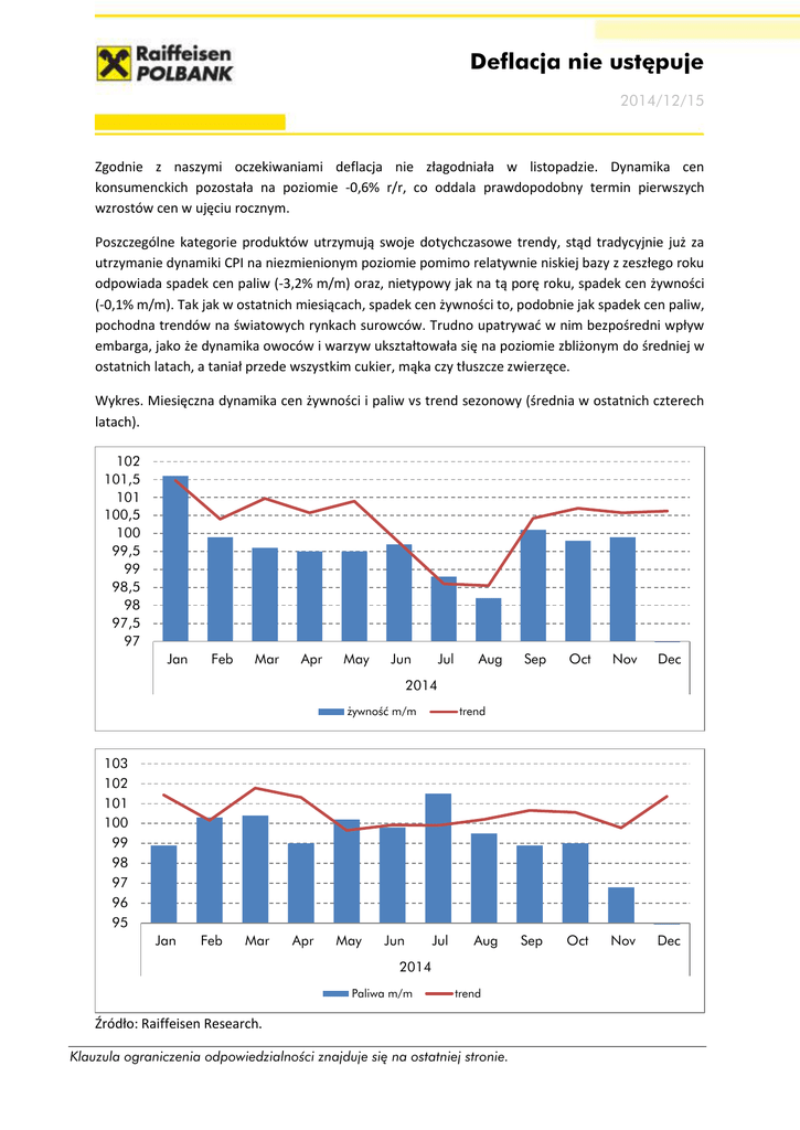 Deflacja nie ustępuje 2014/12/15 Zgodnie z naszymi oczekiwaniami deflacja nie złagodniała w listopadzie. Dynamika cen konsumenckich pozostała na poziomie -0,6% r/r, co oddala prawdopodobny termin pierwszych wzrostów cen w ujęciu rocznym. Poszczególne kategorie produktów utrzymują swoje dotychczasowe trendy, stąd tradycyjnie już za utrzymanie dynamiki CPI na niezmienionym poziomie pomimo relatywnie niskiej bazy z zeszłego roku odpowiada spadek cen paliw (-3,2% m/m) oraz, nietypowy jak na tą porę roku, spadek cen żywności (-0,1% m/m). Tak jak w ostatnich miesiącach, spadek cen żywności to, podobnie jak spadek cen paliw, pochodna trendów na światowych rynkach surowców. Trudno upatrywać w nim bezpośredni wpływ embarga, jako że dynamika owoców i warzyw ukształtowała się na poziomie zbliżonym do średniej w ostatnich latach, a taniał przede wszystkim cukier, mąka czy tłuszcze zwierzęce. Wykres. Miesięczna dynamika cen żywności i paliw vs trend sezonowy (średnia w ostatnich czterech latach). 102 101,5 101 100,5 100 99,5 99 98,5 98 97,5 97 Jan Feb Mar Apr May Jun Jul Aug Sep Oct Nov Dec Sep Oct Nov Dec 2014 żywność m/m trend 103 102 101 100 99 98 97 96 95 Jan Feb Mar Apr May Jun Jul Aug 2014 Paliwa m/m trend Źródło: Raiffeisen Research. Klauzula ograniczenia odpowiedzialności znajduje się na ostatniej stronie. Duża zmienność utrzymuje się w cenach łączności (-0,7%m/m), które tym razem obniżone zostały na skutek spadku opłat za usługi internetowe oraz tańszy sprzęt telekomunikacyjny (ich spadek był jednak znacznie mniejszy niż przed rokiem, stąd gwałtowny wzrost dynamiki w ujęciu rocznym). Po wyeliminowaniu cen żywności i energii inflacja bazowa odnotowała tym samym wzrost z 0,2% w okolice 0,5% r/r. Na podstawie dzisiejszego odczytu CPI uważamy, że deflacja może potrwać nawet do II kw. 2015 r., a rok bieżący zakończy się prawdopodobnie odczytem zbliżonym do tego z listopada. Stąd w całym roku 2014 średnioroczna dynamika cen znajdzie się na poziomie 0%. Mimo, iż dzisiejszy odczyt plasuje się wyraźnie poniżej oczekiwań rynku i potwierdza realizację niższej ścieżki inflacji niż przedstawiona w prognozach NBP, to nie oczekujemy, aby wpłynął on istotnie na układ sił w RPP. Część członków będąca przeciwko obniżkom nadal bowiem będzie prawdopodobnie podejmować argument, że spadek cen ma charakter egzogeniczny (inflacja bazowa wzrosła) i jest poza zasięgiem oddziaływania Rady. Natomiast zwolennicy dalszego luzowania z pewnością zwrócą uwagę, że RPP oddala się od wykonania podstawowego zadania, jakim jest sprowadzenie inflacji blisko celu (2,5%) w średnim terminie. Argumentem w rękach tych pierwszych stać się mogą również jutrzejsze dane z rynku pracy. Oczekujemy, że kolejny solidny wzrost wynagrodzeń potwierdzi, że póki co spirala deflacyjna nam nie grozi. Zarówno w notowaniach złotego, jak i krajowych obligacji skarbowych nie obserwowaliśmy istotnej reakcji na dane. Wydaje się, że niższy od konsensusu odczyt inflacji był już od rana wyceniany na rynku długu, gdzie mieliśmy do czynienia z wyraźnym spadkiem rentowności na całej długości krzywej. Stabilizacja w notowaniach niemieckich obligacji, jak i oczekiwane przez nas dobre dane z rynku pracy mogą jednak sprowadzić rentowności z powrotem na wyższe poziomy. Michał Burek Zespół Analiz Ekonomicznych Raiffeisen Polbank Raiffeisen Polbank ul. Piękna 20. 00-549 Warszawa www.raiffeisenpolbank.com Klauzula Ograniczenia Odpowiedzialności Raiffeisen Bank Polska SA: Niniejsza wiadomość została przesłana zgodnie z Pani/Pana zleceniem. Informujemy, że zgoda na otrzymywanie informacji może zostać w każdej chwili odwołana. Jeżeli nie życzy sobie Pani/ Pan dalszego otrzymywania materiałów przygotowanych przez Zespół Analiz Ekonomicznych Raiffeisen Bank Polska S.A (dalej: RBPL lub Bank) lub niniejszy materiał został wysłany na Pani/Pana adres przez pomyłkę, prosimy o przesłanie e-maila o tytule "REZYGNACJA" na skrzynkę e-mailową: [email protected]. Opracowanie to nie stanowi oferty w rozumieniu art. 66 Kodeksu Cywilnego i zostało przesłane na podstawie ustnej zgody, która w każdej chwili może być odwołana. Ma ono charakter wyłącznie informacyjny. Powielanie bądź publikowanie go lub jego części bez pisemnej zgody Banku jest zabronione. Decyzja inwestycyjna w odniesieniu do papieru wartościowego, produktu finansowego lub inwestycji powinna być podjęta na podstawie opublikowanego prospektu emisyjnego lub kompletnej dokumentacji dla papieru wartościowego, produktu finansowego lub inwestycji. Ostateczna decyzja zawarcia transakcji należy wyłącznie do Klienta. Bank nie występuje w roli pośrednika ani przedstawiciela Klienta. Przed zawarciem każdej transakcji Klient powinien nie opierając się na informacjach przekazanych przez Bank określić jej ryzyko, potencjalne korzyści oraz straty z nią związane, jak również w szczególności charakterystykę, konsekwencje prawne, podatkowe i księgowe transakcji oraz konsekwencje zmieniających się czynników rynkowych, a także w sposób niezależny ocenić czy jest w stanie sam lub po konsultacjach ze swoimi doradcami podjąć takie ryzyko. Niniejszy dokument nie stanowi rekomendacji kupna lub sprzedaży instrumentów finansowych. Dokument, ani żadna z jego części nie stanowi podstawy do zawarcia jakiejkolwiek umowy lub powstania zobowiązania. Opracowanie to nie zastępuje niezbędnych porad odnośnie zakupu lub sprzedaży papieru wartościowego, inwestycji lub innego produktu finansowego. Analiza oparta jest na informacjach publicznie dostępnych – do jej sporządzenia nie wykorzystano żadnych informacji poufnych. Wyrażane opinie są niezależnymi opiniami Banku. W opracowaniu wykorzystano źródła informacji, które Bank uważa za wiarygodne i dokładne, lecz nie istnieje gwarancja, że są one wyczerpujące i w pełni 
