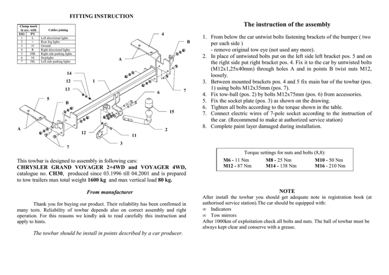 FITTING INSTRUCTION Clamp mark in acc. with ISO PN 1 L 2 + 3 31 4 R 5 58R 6 54 7 58L The instruction of the assembly Cables joining 4 Left directional lights Rear fog lights Ground Right directional lights Right side parking lights Stoplights Left side parking lights B A 14 12 1 13 5 7 6 B 15 A 2 12 7 1. From below the car untwist bolts fastening brackets of the bumper ( two per each side ) - remove original tow eye (not used any more). 2. In place of untwisted bolts put on the left side left bracket pos. 5 and on the right side put right bracket pos. 4. Fix it to the car by untwisted bolts (M12x1,25x40mm) through holes A and in points B twist nuts M12, loosely. 3. Between mounted brackets pos. 4 and 5 fix main bar of the towbar (pos. 1) using bolts M12x35mm (pos. 7). 4. Fix tow-ball (pos. 2) by bolts M12x75mm (pos. 6) from accessories. 5. Fix the socket plate (pos. 3) as shown on the drawing. 6. Tighten all bolts according to the torque shown in the table. 7. Connect electric wires of 7-pole socket according to the instruction of the car. (Recommend to make at authorized service station) 8. Complete paint layer damaged during installation. 11 3 This towbar is designed to assembly in following cars: CHRYSLER GRAND VOYAGER 2+4WD and VOYAGER 4WD, catalogue no. CH30, produced since 03.1996 till 04.2001 and is prepared to tow trailers max total weight 1600 kg and max vertical load 80 kg. From manufacturer Thank you for buying our product. Their reliability has been confirmed in many tests. Reliability of towbar depends also on correct assembly and right operation. For this reasons we kindly ask to read carefully this instruction and apply to hints. The towbar should be install in points described by a car producer. Torque settings for nuts and bolts (8,8): M6 - 11 Nm M8 - 25 Nm M10 - 50 Nm M12 - 87 Nm M14 - 138 Nm M16 - 210 Nm NOTE After install the towbar you should get adequate note in registration book (at authorised service station).The car should be equipped with: • Indicators • Tow mirrors After 1000km of exploitation check all bolts and nuts. The ball of towbar must be always kept clear and conserve with a grease. PPUH AUTO-HAK S.J. Towbar accessories: Produkcja Zaczepów Kulowych Henryk & Zbigniew Nejman 76-200 SŁUPSK ul. Słoneczna 16K tel/fax (059) 8-414-414; 8-414-413 e-mail: [email protected] www. autohak.com.pl Towing hitch (without electrical set) Class: A50-X Cat. no. CH30 Designed for: Manufacturer: CHRYSLER Model: VOYAGER 2WD GRAND VOYAGER 2+4WD produced since 03.1996 till 04.2001 Technical data: D-value: 9,72 kN maximum trailer weight: 1600 kg maximum vertical cup load: 80 kg Approval number according to Directive 94/20/EC: e20*94/20*0220*00 Foreword This towbar is designed according to rules of safety traffic regulations. The towing hitch is a safety component and must be installed only by qualified personnel. Any alteration or conversion to the towing hitch is prohibited and would lead to cancellation of design certification. Remove insulating compound and underseal from vehicle (if present) in the area of the matting surfaces of the towing hitch. The vehicle manufacturer’s specifications regarding trailer load and max. vertical cup load are decisive for driving, and values for the towing hitch cannot be exceeded. D-value formula: Max trailer weight [kg] x Max trailer weight [kg] + Max vehicle weight [kg] Max vehicle weight [kg] X 9,81 = 1000 D [kN] INSTRUCTION De montage et d’exploitation du dispositif d'attelage à boule Désignation de borne selon la norme ISO PN 1 L 2 3 + 31 4 R 5 6 7 58R 54 58L Instructions de montage Connexion des câbles Pour indicateurs de direction gauche Feux de brouillard arrière Au poids du véhicule Pour indicateurs de direction droite Feux de circulation droites Pour feux de freinage Feux de circulation gauches 4 B A 14 12 1 13 5 7 6 B 15 A 2 12 7 1. Du dessous du châssis, dévisser les vis de fixation des appuis du pare-chocs (2 pièces de chaque côté). - Supprimer l’anneau de remorquage original (il ne sera pas remonté). 2. A la place des vis dévissées, du côté gauche, placer l’appui gauche pos.5, du côté droit – l’appui droit pos.4. Serrer à l’aide des vis dévissées (M12x1,25x40mm) à travers des trous A et à l’aide des écrous M12 aux emplacements B, de manière lâche. 3. Serrer la poutre principale de l’attelage (pos.1) aux appuis montés pos. 4 et 5 à l’aide des vis M12x35mm (poz. 7). 4. Fixer la boule d’attelage (pos.2) à l’aide des vis M12x75mm (pos. 6). 5. Serrer la tôle sous la prise (pos.3) conformément au dessin. 6. Serrer toutes les vis aux couples de serrage, comme indiqué dans le tableau. 7. Connecter les câbles de la prise 7 – à l'installation électrique en conformité avec les instructions d'une usine automobile (recommandé la mise en œuvre d’une station-service autorisée). 8. Remplir des pertes de peinture causées durant l'installation. 11 3 Le dispositif d'attelage à boule est conçu pour être monté dans la voiture: CHRYSLER GRAND VOYAGER 2+4WD, CHRYSLER VOYAGER 2WD, produit à partir de 03.1996 au 04.2001, numéro de catalogue CH30 et est utilisé pour tirer des remorques du poids total 1600 kg et de la pression totale sur la boule max 80 kg. DE LA PART DU FABRICANT Merci d'avoir choisi le dispositif d'attelage à boule produit par notre société. Son fiabilité a été confirmée dans de nombreux tests et par les opinions des clients satisfaits. Toutefois, la fiabilité des dispositifs d'attelage à boule dépend aussi d'installation et d’exploitation correcte. Pour cette raison, nous vous demandons de lire attentivement cette instruction de montage et de respecter les conseils. Le dispositif d'attelage à boule doit être monté dans des emplacements prévus a ce but par le fabricant de voiture. Couples de serrage recommandé pour les vis et les écrous 8,8: M6 - 11 Nm M 8 - 25 Nm M 10 - 50 Nm M 12 - 87 Nm M 14 - 138 Nm M16 - 210 Nm Attention Après le m