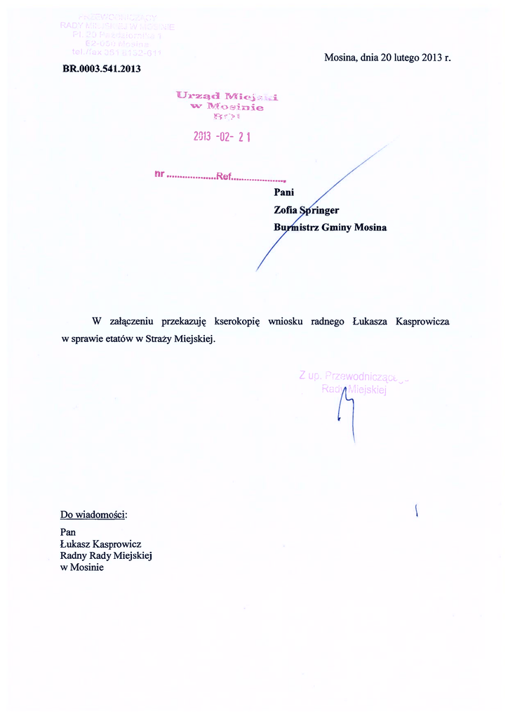 Mosina, dnia 20 lutego 2013 r. BR.0003.541.2013 LTrąd ric i W 2313 -02- 21 nr Pani Zofia Gminy Mosina W załączeniu przekazuję kserokopię wniosku radnego Łukasza Kasprowicza w sprawie etatów w Straży Miejskiej. Do wiadomości: Pan Łukasz Kasprowicz Radny Rady Miejskiej w Mosinie RADA MIEJS W MOSII Rada Miejska Wpł. dnia „ Mosinie 20 NrsprawyłL3 PYTANIE/WNIOSKI RADNEGO „12 % .r. Imię i Nazwisko radnego: Łukasz Kasprowicz W sprawie: etatów w straży miejskiej W związku z planowanym zwiększeniem etatów straży miejskiej w roku 2013 zwracam się z wnioskiem o odstąpienie od tego zamiaru, a zaplanowane na ten cel środki finansowe przeznaczyć na sfinansowanie dodatkowych etatów policji. UZASADNIENIE Rosnąca przestępczość na terenie gminy jak kradzieże napady i rozboje są bardzo uciążliwe i niebezpieczne dla mieszkańców. Dodatkowe etaty powinny być nastawione na patrolowanie miasta i gminy, szczególnie w nocy. Straż Miejska, z całym szacunkiem do niej, w mojej ocenie nie może skutecznie walczyć z przestępczością i dbać o bezpieczeństwo mieszkańców. „ Mosina 20 luty 2013 RADNY RADY MIEJSKIEJ GMINY MOSINA Łukasz Kasprowicz