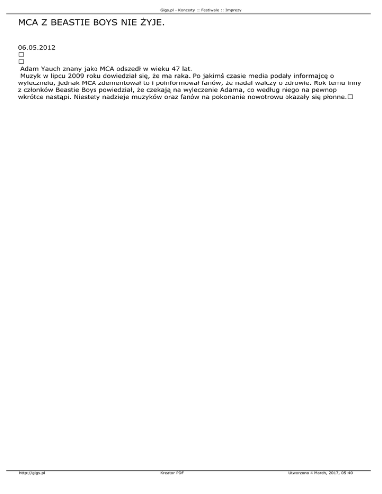 Gigs.pl - Koncerty :: Festiwale :: Imprezy MCA Z BEASTIE BOYS NIE ŻYJE. 06.05.2012 Adam Yauch znany jako MCA odszedł w wieku 47 lat. Muzyk w lipcu 2009 roku dowiedział się, że ma raka. Po jakimś czasie media podały informajcę o wyleczneiu, jednak MCA zdementował to i poinformował fanów, że nadal walczy o zdrowie. Rok temu inny z członków Beastie Boys powiedział, że czekają na wyleczenie Adama, co według niego na pewnop wkrótce nastąpi. Niestety nadzieje muzyków oraz fanów na pokonanie nowotrowu okazały się płonne. http://gigs.pl Kreator PDF Utworzono 4 March, 2017, 05:40