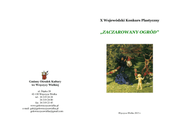 X Wojewódzki Konkurs Plastyczny „ZACZAROWANY OGRÓD” Gminny Ośrodek Kultury we Wręczycy Wielkiej ul. Śląska 20 42-130 Wręczyca Wielka tel. 34 319 24 24 34 319 24 00 fax 34 319 23 45 www.gokwreczycawielka.pl e-mail: [email protected] [email protected] Wręczyca Wielka 2015 r. X Wojewódzki Konkurs Plastyczny „ZACZAROWANY OGRÓD” prace należy nadsyłać do dnia 05 maja 2015r. (wtorek) na adres: Gminny Ośrodek Kultury ul. Śląska 20 42-130 Wręczyca Wielka organizator: Gminny Ośrodek Kultury we Wręczycy Wielkiej 1. Temat konkursu: Wykonanie w dowolnej technice kolorystycznej (płaskiej) fantastycznej kompozycji ukazującej zaczarowany ogród, inspirowany światem flory i fauny, wzbogaconej o własną wyobraźnię twórczą 2. Patronat honorowy: Wójt Gminy Wręczyca Wielka 3. Cele konkursu: prezentacja oraz promocja twórczości dzieci i młodzieży pobudzenie wyobraźni oraz rozwijanie myślenia twórczego uwrażliwienie dzieci i młodzieży na otaczający świat 4. Warunki uczestnictwa: konkurs adresowany jest do dzieci i młodzieży; przedszkoli, szkół podstawowych, gimnazjów, liceów oraz zespołów plastycznych domów i ośrodków kultury. wiek uczestników: 3 – 20 lat technika prac – dowolna, płaska (malarstwo, rysunek, grafika) prac nie należy oprawiać nie będą oceniane prace: wyklejane bibułą (kulkami), zapałkami, plasteliną, sypkimi produktami spożywczymi, żelami brokatowymi, folią i farbą metalową itp. oraz nadesłane w rulonach i nieprawidłowo opisane. do przesyłki należy dołączyć listę zbiorową autorów prac, opatrzoną pieczęcią szkoły/placówki delegującej format prac - malarstwo i rysunek: A4, A3, A2 format prac – grafika: A4, A3 (prace w innym formacie nie będą brane pod uwagę) każdy uczestnik może nadesłać tylko 1 pracę – praca powinna być opisana na odwrocie pismem drukowanym lub komputerowym imię i nazwisko, klasa, dokładny adres (placówki, szkoły), imię i nazwisko nauczyciela – instruktora tytuł pracy lista laureatów zostanie zamieszczona na naszej stronie internetowej (www.gokwreczycawielka.pl) dnia 15 maja 2015 r. (piątek) prace nie będą zwracane, mogą być przez organizatora eksponowane i popularyzowane na innych wystawach, jak i w czasopismach, kalendarzach, katalogach, książkach itp. oraz w Internecie. Uczestnicy zgadzają się także na umieszczenie nazwisk autorów, bez wypłacania honorariów autorskich. Uczestnicy wyrażają zgodę na przechowywanie i przetwarzanie danych osobowych przez organizatora konkursu. (Ustawa z dnia 29.08.1997r. o ochronie danych osobowych Dz.U.Nr 133 poz. 833.) nagrody i wyróżnienia nie odebrane podczas uroczystości podsumowania konkursu zostaną doręczone laureatom w sposób uzgodniony z organizatorem, pozostałe nieodebrane w ciągu 1 miesiąca zostaną przeznaczone do kolejnego konkursu. zgłoszenie prac do konkursu jest jednoznaczne z akceptacją regulaminu! organizator nie bierze odpowiedzialności za zniszczenie lub zgubę prac podczas przesyłki! szczegółowych informacji w sprawach uczestnictwa w konkursie udziela Gminny Ośrodek Kultury we Wręczycy Wielkiej (34 319 24 24, 34 319 24 00). NIEPRZESTRZEGANIE POWYŻSZYCH PUNKTÓW REGULAMINU SPOWODUJE ODRZUCENIE NADESŁANYCH PRAC Komisja konkursowa dokona oceny prac w kategoriach wiekowych: Kategoria I Kategoria II Kategoria III Kategoria IV Kategoria V przedszkole klasy I, II, III klasy IV, V, VI gimnazjum szkoła ponadgimnazjalna i inne uroczyste otwarcie wystawy, ogłoszenie wyników i wręczenie nagród nastąpi we wtorek 19 maja 2015 r. (wtorek) o godzinie 1300 w sali widowiskowej Gminnego Ośrodka Kultury we Wręczycy Wielkiej. SERDECZNIE ZAPRASZAMY DO UDZIAŁU I ŻYCZYMY SUKCESÓW !!!