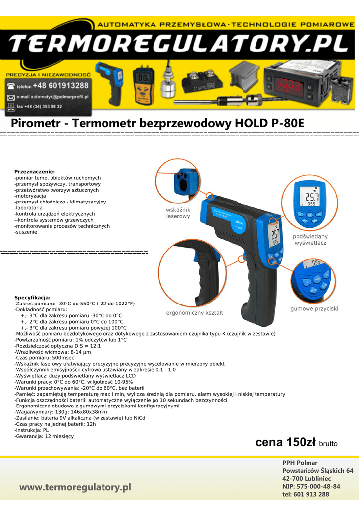 Pirometr-TermometrbezprzewodowyHOLDP-80E Przeznaczenie: %pomiar°tempR°obiektów°ruchomych %przemysł°spożywczyP°transportowy %przetwórstwo°tworzyw°sztucznych %motoryzacja %przemysł°chłodniczo°%°klimatyzacyjny %laboratoria %kontrola°urządzeń°elektrycznych %%kontrola°systemów°grzewczych %monitorowanie°procesów°technicznych %suszenie Specyfikacja: %Zakres°pomiaruE°%4=°C°do°ff=°C°D%88°do°W=88°F+ %Dokładność°pomiaruE °°°°KP%°4°C°dla°zakresu°pomiaru°%4=°C°do°=°C °°°°KP%°8°C°dla°zakresu°pomiaru°=°C°do°W==°C °°°°KP%°4°C°dla°zakresu°pomiaru°powyżej°W==°C %Możliwość°pomiaru°bezdotykowego°oraz°dotykowego°z°zastosowaniem°czujnika°typu°K°Dczujnik°w°zestawie+ %Powtarzalność°pomiaruE°W1°odczytów°lub°W°C %Rozdzielczość°optyczna°DES°V°W8EW %Wrażliwość°widmowaE°9%Wµ°µm %Czas°pomiaruE°f==msec %Wskaźnik°laserowy°ułatwiający°precyzyjne°precyzyjne°wycelowanie°w°mierzony°obiekt %Współczynnik°emisyjnościE°cyfrowo°ustawiany°w°zakresie°=RW°%°WR= %WyświetlaczE°duży°podświetlany°wyświetlacz°LCD %Warunki°pracyE°=°C°do°L=°CP°wilgotność°W=%xf1 %Warunki°przechowywaniaE°%8=°C°do°L=°CP°bez°baterii %PamięćE°zapamiętuję°temperaturę°max°i°minP°wylicza°średnią°dla°pomiaruP°alarm°wysokiej°i°niskiej°temperatury %Funkcja°oszczędności°bateriiE°automatyczne°wyłączenie°po°W=°sekundach°bezczynności %Ergonomiczna°obudowa°z°gumowymi°przyciskami°konfiguracyjnymi %WagaSwymiaryE°W4=g/°WµLx9=x49mm %ZasilanieE°bateria°xV°alkaliczna°Dw°zestawie+°lub°NiCd %Czas°pracy°na°jednej°bateriiE°W8h %InstrukcjaE°PL %GwarancjaE°W8°miesięcy cena 150zł brutto www.termoregulatory.pl PPHPolmar PowstańcówŚląskich64 42-700Lubliniec NIP:575-000-48-84 tel:601913288