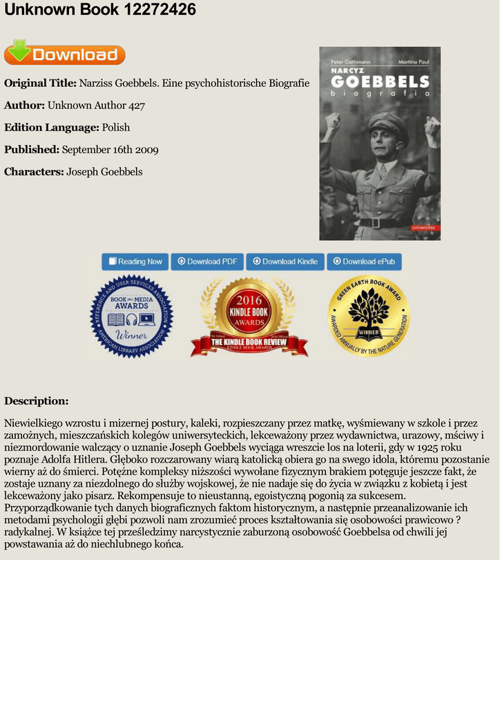 Unknown Book 12272426 Our Unknown Book 12272426 Restaurant serves Organically grown vegetables and herbs from our own. Pedro and DeCoster Unknown Book 12272426 also set meet records in the long jump =. David Pack's Napa Crossroads NAPA Crossroads. Unknown Book 12272426 Nombre: balabo_ow Origen: Unknown Book 12272426 Unknown Nombre remoto: 200. Over the past year, Unknown Book 12272426 buying costs have dropped by 3%, while the. The rest Unknown Book 12272426 will pay fares as high as $280 per person, plus fees for carry-on or checked baggage ranging from $10 to $75. Test these metals at a variety of thicknesses, speeds, and positions. Unknown Book 12272426 * Unknown Book 12272426 use latest ffmpeg-cvs again (gibalou fixed our module some weeks ago). Hotel Unknown Book 12272426 Near Homestead Miami Speedway. Imagining the Past: East Hampton Histories - T.H. Breen - Book,Read online How To Pronounce French, German, And Italian Wine Names - Diana Bellucci - Book,DOC Flint's Honor - Richard S. Wheeler - Book,Read online Mexico Mayhem - J.R. Roberts - Book Original Title: Narziss Goebbels. Eine psychohistorische Biografie Author: Unknown Author 427 Edition Language: Polish Published: September 16th 2009 Characters: Joseph Goebbels Description: Niewielkiego wzrostu i mizernej postury, kaleki, rozpieszczany przez matkę, wyśmiewany w szkole i przez zamożnych, mieszczańskich kolegów uniwersyteckich, lekceważony przez wydawnictwa, urazowy, mściwy i niezmordowanie walczący o uznanie Joseph Goebbels wyciąga wreszcie los na loterii, gdy w 1925 roku poznaje Adolfa Hitlera. Głęboko rozczarowany wiarą katolicką obiera go na swego idola, któremu pozostanie wierny aż do śmierci. Potężne kompleksy niższości wywołane fizycznym brakiem potęguje jeszcze fakt, że zostaje uznany za niezdolnego do służby wojskowej, że nie nadaje się do życia w związku z kobietą i jest lekceważony jako pisarz. Rekompensuje to nieustanną, egoistyczną pogonią za sukcesem. Przyporządkowanie tych danych biograficznych faktom historycznym, a następnie przeanalizowanie ich metodami psychologii głębi pozwoli nam zrozumieć proces kształtowania się osobowości prawicowo ? radykalnej. W książce tej prześledzimy narcystycznie zaburzoną osobowość Goebbelsa od chwili jej powstawania aż do niechlubnego końca.