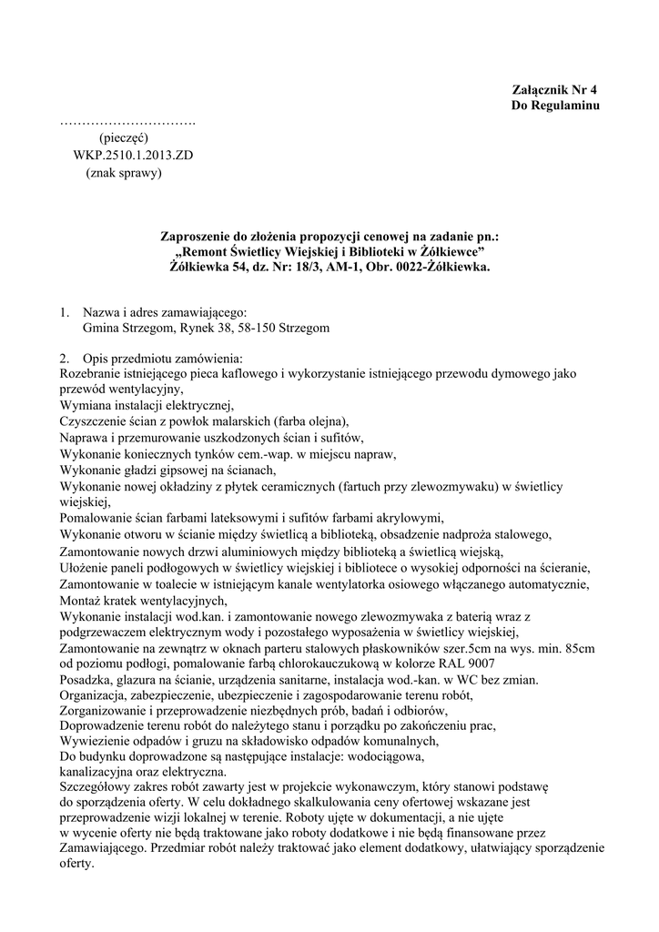 Załącznik Nr 4 Do Regulaminu …………………………. (pieczęć) WKP.2510.1.2013.ZD (znak sprawy) Zaproszenie do złożenia propozycji cenowej na zadanie pn.: „Remont Świetlicy Wiejskiej i Biblioteki w Żółkiewce” Żółkiewka 54, dz. Nr: 18/3, AM-1, Obr. 0022-Żółkiewka. 1. Nazwa i adres zamawiającego: Gmina Strzegom, Rynek 38, 58-150 Strzegom 2. Opis przedmiotu zamówienia: Rozebranie istniejącego pieca kaflowego i wykorzystanie istniejącego przewodu dymowego jako przewód wentylacyjny, Wymiana instalacji elektrycznej, Czyszczenie ścian z powłok malarskich (farba olejna), Naprawa i przemurowanie uszkodzonych ścian i sufitów, Wykonanie koniecznych tynków cem.-wap. w miejscu napraw, Wykonanie gładzi gipsowej na ścianach, Wykonanie nowej okładziny z płytek ceramicznych (fartuch przy zlewozmywaku) w świetlicy wiejskiej, Pomalowanie ścian farbami lateksowymi i sufitów farbami akrylowymi, Wykonanie otworu w ścianie między świetlicą a biblioteką, obsadzenie nadproża stalowego, Zamontowanie nowych drzwi aluminiowych między biblioteką a świetlicą wiejską, Ułożenie paneli podłogowych w świetlicy wiejskiej i bibliotece o wysokiej odporności na ścieranie, Zamontowanie w toalecie w istniejącym kanale wentylatorka osiowego włączanego automatycznie, Montaż kratek wentylacyjnych, Wykonanie instalacji wod.kan. i zamontowanie nowego zlewozmywaka z baterią wraz z podgrzewaczem elektrycznym wody i pozostałego wyposażenia w świetlicy wiejskiej, Zamontowanie na zewnątrz w oknach parteru stalowych płaskowników szer.5cm na wys. min. 85cm od poziomu podłogi, pomalowanie farbą chlorokauczukową w kolorze RAL 9007 Posadzka, glazura na ścianie, urządzenia sanitarne, instalacja wod.-kan. w WC bez zmian. Organizacja, zabezpieczenie, ubezpieczenie i zagospodarowanie terenu robót, Zorganizowanie i przeprowadzenie niezbędnych prób, badań i odbiorów, Doprowadzenie terenu robót do należytego stanu i porządku po zakończeniu prac, Wywiezienie odpadów i gruzu na składowisko odpadów komunalnych, Do budynku doprowadzone są następujące instalacje: wodociągowa, kanalizacyjna oraz elektryczna. Szczegółowy zakres robót zawarty jest w projekcie wykonawczym, który stanowi podstawę do sporządzenia oferty. W celu dokładnego skalkulowania ceny ofertowej wskazane jest przeprowadzenie wizji lokalnej w terenie. Roboty ujęte w dokumentacji, a nie ujęte w wycenie oferty nie będą traktowane jako roboty dodatkowe i nie będą finansowane przez Zamawiającego. Przedmiar robót należy traktować jako element dodatkowy, ułatwiający sporządzenie oferty. Roboty należy prowadzić zgodnie z przepisami Prawa budowlanego i przepisami BHP w sposób jak najmniej uciążliwy dla przedszkola, świetlicy i mieszkańców. 3. Termin realizacji zamówienia – 10 czerwca 2013 r. 4. Okres gwarancji – 36 miesięcy. 5. Warunki płatności – 21 dni od dnia odbioru końcowego i przedłożenia faktury VAT. 6. Kryteria wyboru oferty: Najkorzystniejsza cena. 7. Wykonawca składając propozycję cenową, składa następujące dokumenty: 1) Formularz propozycji cenowej (według zamieszczonego wzoru oraz kosztorys ofertowy), 2) Kserokopię potwierdzoną za zgodność z oryginałem przez wykonawcę aktualnego wpisu do właściwego rejestru, uprawniającego wykonawcę do występowania w obrocie prawnym. 8. Zaproponowana cena powinna zawierać: 1) Wartość usługi/dostawy/robót budowlanych określoną w oparciu o przedmiot zamówienia, 2) Obowiązujący podatek VAT Cena podana przez wykonawcę jest obowiązująca przez okres ważności umowy i nie będzie podlegała waloryzacji w okresie jej trwania. 9. Zamawiający wybierze najkorzystniejszą ofertę odpowiadającą wszystkim postawionym przez niego wymogom, zgodnie z kryteriami określonymi w pkt. 6, które nie podlegają zmianie w toku niniejszego postępowania. 10. Miejsce i termin złożenia propozycji cenowej: Propozycję cenową należy złożyć w terminie do dnia 08.04.2013 r. do godz. 1430. W formie zgodnej ze wskazaniem Zamawiającego (określić jakiej): 1. Ofertę należy złożyć w formie pisemnej w zamkniętej kopercie osobiście w Wydziale Obsługi Interesantów pok. Nr 15 lub pocztą na adres zamawiającego (decyduje data wpłynięcia oferty do Urzędu). 2. Na kopercie należy umieścić nazwę i adres oferenta oraz napis „Remont świetlicy wiejskiej i biblioteki w Żółkiewce”. 11. Osobami uprawnionymi do kontaktów z wykonawcami z ramienia zamawiającego są: Zbigniew Dudziak Tel. 74/8560-511 Wioletta Urban Tel. 74/8560-523 Fax 74/8560-516 e- mail [email protected] 12. Ceny podanej w niniejszym zaproszeniu mają być wyrażone cyfrowo i słownie, zaproszenie ma być napisane w języku polskim, czytelnie i trwałą techniką oraz ma obejmować całość zamówienia i zawierać opis spełnienia innych kryteriów wynikających z opisu przedmiotu zamówienia. 13. Zamawiający zastrzega sobie prawo do unieważnienia postępowania bez podania przyczyny. Sporządził: …………………………………………… (podpis naczelnika/kierownika komórki organizacyjnej) Załącznik Nr 5 do Regulaminu …………………………….. (pieczęć wykonawcy) Propozycja cenowa ………………………………………………………………………………………………………… (nazwa zadania) 1. Oferuję wykonanie usługi/dostawy/robót budowlanych* będącej przedmiotem zamówienia, zgodnie z wymogami opisu przedmiotu zamówienia za: Cenę netto: ……………………………………………zł (słownie:…………………………………………………………………) Podatek VAT: …………………………………………zł Cenę brutto: ………………………………………….zł (słownie:…………………………………………………………………) 2. Gwarantuję: Termin wykonania zamówienia: ……………………………..