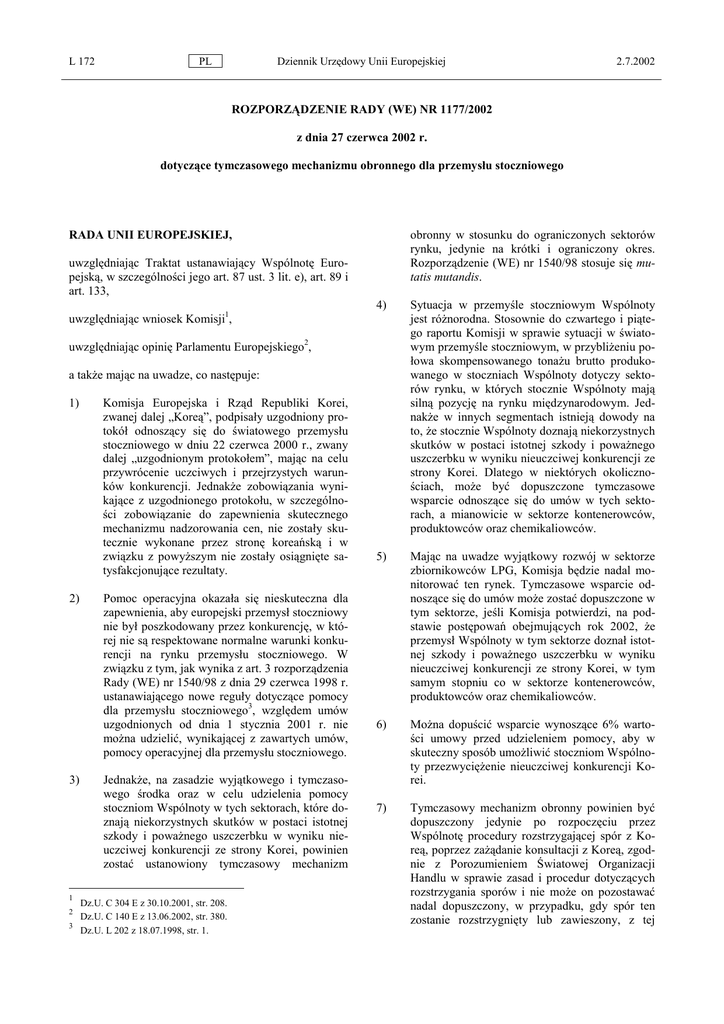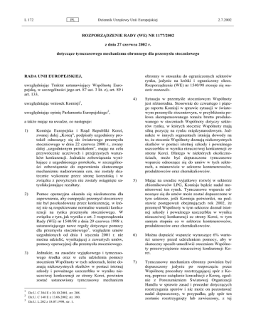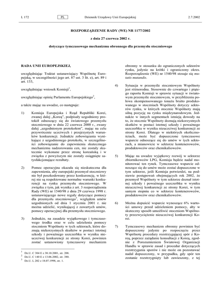 L 172 PL Dziennik Urzędowy Unii Europejskiej 2.7.2002 ROZPORZĄDZENIE RADY (WE) NR 1177/2002 z dnia 27 czerwca 2002 r. dotyczące tymczasowego mechanizmu obronnego dla przemysłu stoczniowego obronny w stosunku do ograniczonych sektorów rynku, jedynie na krótki i ograniczony okres. Rozporządzenie (WE) nr 1540/98 stosuje się mutatis mutandis. RADA UNII EUROPEJSKIEJ, uwzględniając Traktat ustanawiający Wspólnotę Europejską, w szczególności jego art. 87 ust. 3 lit. e), art. 89 i art. 133, uwzględniając wniosek Komisji1, 4) Sytuacja w przemyśle stoczniowym Wspólnoty jest różnorodna. Stosownie do czwartego i piątego raportu Komisji w sprawie sytuacji w światowym przemyśle stoczniowym, w przybliżeniu połowa skompensowanego tonażu brutto produkowanego w stoczniach Wspólnoty dotyczy sektorów rynku, w których stocznie Wspólnoty mają silną pozycję na rynku międzynarodowym. Jednakże w innych segmentach istnieją dowody na to, że stocznie Wspólnoty doznają niekorzystnych skutków w postaci istotnej szkody i poważnego uszczerbku w wyniku nieuczciwej konkurencji ze strony Korei. Dlatego w niektórych okolicznościach, może być dopuszczone tymczasowe wsparcie odnoszące się do umów w tych sektorach, a mianowicie w sektorze kontenerowców, produktowców oraz chemikaliowców. 5) Mając na uwadze wyjątkowy rozwój w sektorze zbiornikowców LPG, Komisja będzie nadal monitorować ten rynek. Tymczasowe wsparcie odnoszące się do umów może zostać dopuszczone w tym sektorze, jeśli Komisja potwierdzi, na podstawie postępowań obejmujących rok 2002, że przemysł Wspólnoty w tym sektorze doznał istotnej szkody i poważnego uszczerbku w wyniku nieuczciwej konkurencji ze strony Korei, w tym samym stopniu co w sektorze kontenerowców, produktowców oraz chemikaliowców. 6) Można dopuścić wsparcie wynoszące 6% wartości umowy przed udzieleniem pomocy, aby w skuteczny sposób umożliwić stoczniom Wspólnoty przezwyciężenie nieuczciwej konkurencji Korei. 7) Tymczasowy mechanizm obronny powinien być dopuszczony jedynie po rozpoczęciu przez Wspólnotę procedury rozstrzygającej spór z Koreą, poprzez zażądanie konsultacji z Koreą, zgodnie z Porozumieniem Światowej Organizacji Handlu w sprawie zasad i procedur dotyczących rozstrzygania sporów i nie może on pozostawać nadal dopuszczony, w przypadku, gdy spór ten zostanie rozstrzygnięty lub zawieszony, z tej uwzględniając opinię Parlamentu Europejskiego2, a także mając na uwadze, co następuje: 1) 2) 3) 1 Komisja Europejska i Rząd Republiki Korei, zwanej dalej „Koreą”, podpisały uzgodniony protokół odnoszący się do światowego przemysłu stoczniowego w dniu 22 czerwca 2000 r., zwany dalej „uzgodnionym protokołem”, mając na celu przywrócenie uczciwych i przejrzystych warunków konkurencji. Jednakże zobowiązania wynikające z uzgodnionego protokołu, w szczególności zobowiązanie do zapewnienia skutecznego mechanizmu nadzorowania cen, nie zostały skutecznie wykonane przez stronę koreańską i w związku z powyższym nie zostały osiągnięte satysfakcjonujące rezultaty. Pomoc operacyjna okazała się nieskuteczna dla zapewnienia, aby europejski przemysł stoczniowy nie był poszkodowany przez konkurencję, w której nie są respektowane normalne warunki konkurencji na rynku przemysłu stoczniowego. W związku z tym, jak wynika z art. 3 rozporządzenia Rady (WE) nr 1540/98 z dnia 29 czerwca 1998 r. ustanawiającego nowe reguły dotyczące pomocy dla przemysłu stoczniowego3, względem umów uzgodnionych od dnia 1 stycznia 2001 r. nie można udzielić, wynikającej z zawartych umów, pomocy operacyjnej dla przemysłu stoczniowego. Jednakże, na zasadzie wyjątkowego i tymczasowego środka oraz w celu udzielenia pomocy stoczniom Wspólnoty w tych sektorach, które doznają niekorzystnych skutków w postaci istotnej szkody i poważnego uszczerbku w wyniku nieuczciwej konkurencji ze strony Korei, powinien zostać ustanowiony tymczasowy mechanizm Dz.U. C 304 E z 30.10.2001, str. 208. Dz.U. C 140 E z 13.06.2002, str. 380. 3 Dz.U. L 202 z 18.07.1998, str. 1. 2 2.7.2002 PL Dziennik Urzędowy Unii Europejskiej przyczyny, że Wspólnota uzna, że uzgodniony protokół został skutecznie wprowadzony w życie, PRZYJMUJE NINIEJSZE ROZPORZĄDZENIE: Artykuł 1 Do celów niniejszego rozporządzenia, stosuje się odpowiednie definicje wymienione w art. 1 rozporządzenia (WE) nr 1540/98. Ponadto stosuje się następujące definicje: a) b) „kontenerowce” oznaczają statki o kadłubie jednopokładowym z układem uchwytów do przewożenia pojemników (standardowych i niestandardowych, chłodzących i niechłodzących), których uchwyty są wyposażone w prowadnice ułatwiające ustawianie pojemników, w które to prowadnice mogą być również wyposażone niektóre pokładowe przestrzenie składowe. Inne statki, których nośność ładunkowa przeznaczona jest zarówno na pojemniki jak i innego rodzaju ładunek uznawane są za kontenerowce, jeśli nośność ładunkowa jest w większej części przeznaczona na pojemniki; „chemikaliowce” oznaczają statki o kadłubie jednopokładowym z układem zespolonych lub niezależnych zbiorników, przystosowanych do przewożenia produktów chemicznych w postaci ciekłej. Chemikaliowce charakteryzują się zdolnością do przewożenia i obsługi kilku substancji w tym samym czasie oraz specyficznym wyposażeniem zbiorników w postaci powłok, stosownie do charakteru ładunku i ryzyka związanego z jego przewozem; L 172 umów na budowę zbiornikowców LPG może być dopuszczona na podstawie niniejszego artykułu, w odniesieniu do ostatecznych umów podpisanych po ogłoszeniu przez Komisję w Dzienniku Urzędowym Wspólnot Europejskich, iż potwierdza na podstawie przeprowadzonych postępowań obejmujących rok 2002, że przemysł Wspólnot doznał istotnej szkody i poważnego uszczerbku w tym sektorze rynku spowodowanych nieuczciwymi praktykami Kore