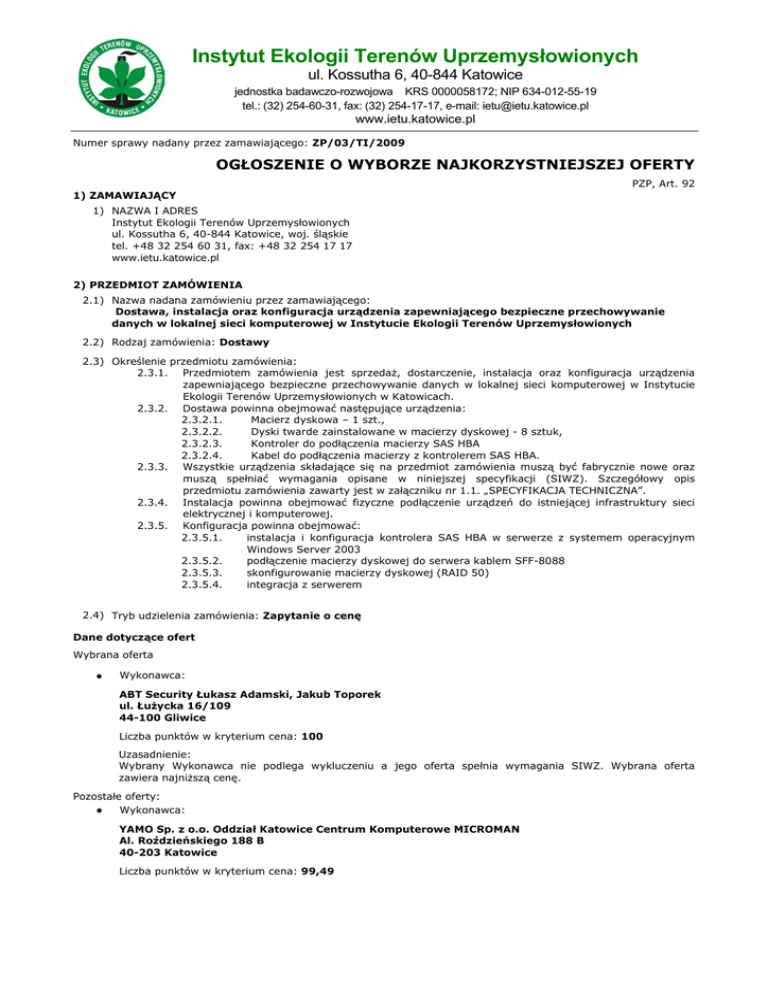 Instytut Ekologii Terenów Uprzemysłowionych ul. Kossutha 6, 40-844 Katowice jednostka badawczo-rozwojowa KRS 0000058172; NIP 634-012-55-19 tel.: (32) 254-60-31, fax: (32) 254-17-17, e-mail: [email protected] www.ietu.katowice.pl Numer sprawy nadany przez zamawiającego: ZP/03/TI/2009 OGŁOSZENIE O WYBORZE NAJKORZYSTNIEJSZEJ OFERTY PZP, Art. 92 1) ZAMAWIAJĄCY 1) NAZWA I ADRES Instytut Ekologii Terenów Uprzemysłowionych ul. Kossutha 6, 40-844 Katowice, woj. śląskie tel. +48 32 254 60 31, fax: +48 32 254 17 17 www.ietu.katowice.pl 2) PRZEDMIOT ZAMÓWIENIA 2.1) Nazwa nadana zamówieniu przez zamawiającego: Dostawa, instalacja oraz konfiguracja urządzenia zapewniającego bezpieczne przechowywanie danych w lokalnej sieci komputerowej w Instytucie Ekologii Terenów Uprzemysłowionych 2.2) Rodzaj zamówienia: Dostawy 2.3) Określenie przedmiotu zamówienia: 2.3.1. Przedmiotem zamówienia jest sprzedaż, dostarczenie, instalacja oraz konfiguracja urządzenia zapewniającego bezpieczne przechowywanie danych w lokalnej sieci komputerowej w Instytucie Ekologii Terenów Uprzemysłowionych w Katowicach. 2.3.2. Dostawa powinna obejmować następujące urządzenia: 2.3.2.1. Macierz dyskowa – 1 szt., 2.3.2.2. Dyski twarde zainstalowane w macierzy dyskowej - 8 sztuk, 2.3.2.3. Kontroler do podłączenia macierzy SAS HBA 2.3.2.4. Kabel do podłączenia macierzy z kontrolerem SAS HBA. 2.3.3. Wszystkie urządzenia składające się na przedmiot zamówienia muszą być fabrycznie nowe oraz muszą spełniać wymagania opisane w niniejszej specyfikacji (SIWZ). Szczegółowy opis przedmiotu zamówienia zawarty jest w załączniku nr 1.1. „SPECYFIKACJA TECHNICZNA”. 2.3.4. Instalacja powinna obejmować fizyczne podłączenie urządzeń do istniejącej infrastruktury sieci elektrycznej i komputerowej. 2.3.5. Konfiguracja powinna obejmować: 2.3.5.1. instalacja i konfiguracja kontrolera SAS HBA w serwerze z systemem operacyjnym Windows Server 2003 2.3.5.2. podłączenie macierzy dyskowej do serwera kablem SFF-8088 2.3.5.3. skonfigurowanie macierzy dyskowej (RAID 50) 2.3.5.4. integracja z serwerem 2.4) Tryb udzielenia zamówienia: Zapytanie o cenę Dane dotyczące ofert Wybrana oferta • Wykonawca: ABT Security Łukasz Adamski, Jakub Toporek ul. Łużycka 16/109 44-100 Gliwice Liczba punktów w kryterium cena: 100 Uzasadnienie: Wybrany Wykonawca nie podlega wykluczeniu a jego oferta spełnia wymagania SIWZ. Wybrana oferta zawiera najniższą cenę. Pozostałe oferty: • Wykonawca: YAMO Sp. z o.o. Oddział Katowice Centrum Komputerowe MICROMAN Al. Roździeńskiego 188 B 40-203 Katowice Liczba punktów w kryterium cena: 99,49 • Wykonawca: BIT Technologies Piotr Tomczyk Dariusz Biernat Maciej Permus Spółka Jawna ul. Uniwersytecka 4 40-007 Katowice Liczba punktów w kryterium cena: 99,93 2