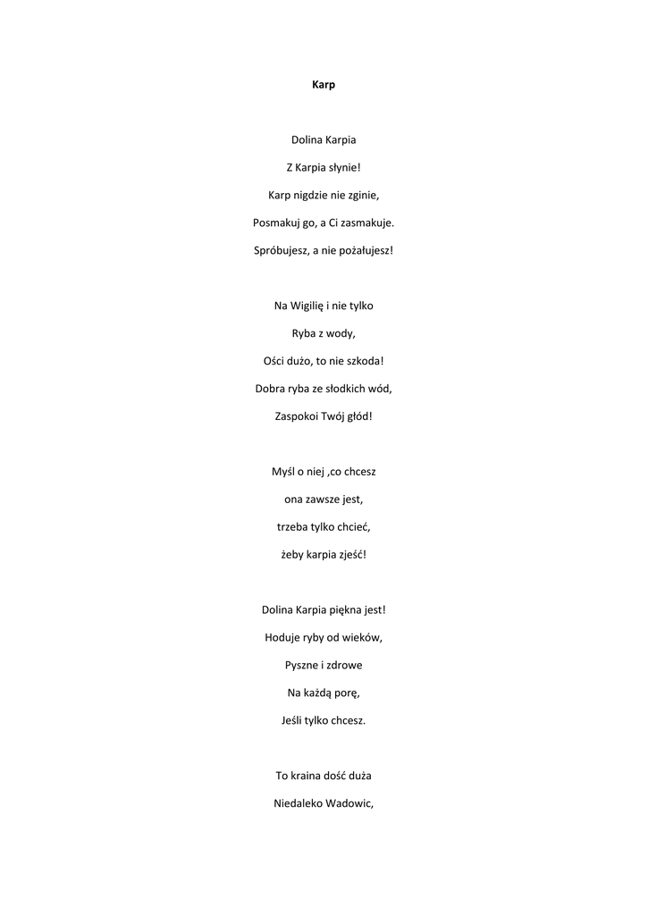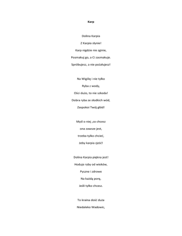 Karp Dolina Karpia Z Karpia słynie! Karp nigdzie nie zginie, Posmakuj go, a Ci zasmakuje. Spróbujesz, a nie pożałujesz! Na Wigilię i nie tylko Ryba z wody, Ości dużo, to nie szkoda! Dobra ryba ze słodkich wód, Zaspokoi Twój głód! Myśl o niej ,co chcesz ona zawsze jest, trzeba tylko chcieć, żeby karpia zjeść! Dolina Karpia piękna jest! Hoduje ryby od wieków, Pyszne i zdrowe Na każdą porę, Jeśli tylko chcesz. To kraina dość duża Niedaleko Wadowic, Stamtąd Karol Wojtyła Karpie jeździł łowić. Dużo zabawy miał z tych wycieczek, Bo karp nie chciał Wlecieć do sieci. Tak więc mówiąc krótko, Dolina Karpia Jest piękna, jak wiecie. Zawsze można znaleźć chwilkę, by Rozejrzeć się po świecie! Joanna Oleksy Gimnazjum w Brzeźnicy