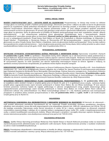 Serwis Informacyjny Urzędu Gminy Stare Babice, 14 października 2016 r. Nr 502 www.stare-babice.pl GMINA, URZĄD, TEREN BUDŻET PARTYCYPACYJNY 2017 – OSTATNI DZIEŃ NA GŁOSOWANIE Przypominamy, że dzisiaj mija termin na oddanie swojego głosu na wybrany projekt z budżetu partycypacyjnego. Głosowanie jest jawne i odbywa się tylko na karcie do głosowania poprzez jej wypełnienie. Każdy pełnoletni mieszkaniec może głosować na dowolny projekt, w dowolnie wybranym przez siebie obszarze terytorialnym. Głosowanie odbywa się poprzez postawienie znaku „X” przy jednym projekcie spośród wszystkich umieszczonych na karcie do głosowania. W sytuacji, gdy głosujący wziął udział w głosowaniu kilkukrotnie, wszystkie oddane przez niego głosy są nieważne. Karta do głosowania na projekty do budżetu partycypacyjnego musi mieć wypełnione rubryki „danych obowiązkowych” i być własnoręcznie podpisana przez głosującego (niepodpisanie karty i niewypełnienie „danych obowiązkowych” powoduje uznanie głosu za nieważny). Głosować można na kilka sposobów: a) wrzucając kartę do głosowania do urn w następujących punktach: Urząd Gminy Stare Babice ul. Rynek 32, Przedszkole w Bliznem Jasińskiego, ul. Kopernika 1, Zespół Szkolno - Przedszkolny w Borzęcinie Dużym, ul. Warszawska 697 b) korespondencyjnie – poprzez wysłanie karty do głosowania na adres Urzędu Gminy Stare Babice z dopiskiem „karta do głosowania budżet partycypacyjny” (liczy się data wpływu korespondencji do urzędu) c) internetowo – karta do głosowania powinna mieć formę skanu, który należy przesłać na adres email: [email protected] (do godz. 24:00 dnia 14 października 2016 r.). WYDARZENIA, ZAPROSZENIA SPOTKANIE OT!WARTE! STOWARZYSZENIA KUŹNIA PRZYJAŹNI Z HENRYKIEM SOCHĄ Zapraszamy wszystkich chętnych 21 października o godz. 18:00 na spotkanie z Henrykiem Sochą, które odbędzie się w sali koncertowej szkoły podstawowej w Starych Babicach. Henryk Socha jest znawcą historii i kultury Japonii i autorem wielu książek. Niedawno wrócił z kolejnej podróży do Kraju Kwitnącej Wiśni i podczas spotkania podzieli się najświeższymi wrażeniami i informacjami. Jak mawia bohater spotkania: W rzeczywistości Japonia, na wiele sposobów, jest obecnie najbardziej interesującym krajem na świecie. Zgodnie z tradycją, na spotkaniu zostaną wylosowane niespodzianki, po spotkaniu można będzie otrzymać autograf. JUBILEUSZOWY KONCERT MUZYCZNY Zapraszamy na Koncert Jubileuszowy Maestro Szymona Kawalla w 60 – lecie działalności artystycznej i 50 – lecie pracy pedagogicznej. Koncert odbędzie się w hołdzie Św. Janowi Pawłowi II pod honorowym patronatem Jego Eminencji Kazimierza Kardynała Nycza Metropolity Warszawskiego. Podczas koncertu wystąpią m.in.: Festiwalowa Orkiestra Kameralna im. I. J. Paderewskiego oraz zaproszeni przez Maestro Szymona Kawallę artyści. Zapraszamy 30 października o godz. 19:00 do kościoła Parafii Rzymskokatolickiej pw. Objawienia Pańskiego w Bliznem Jasińskiego, ul. Łaszczyńskiego 1. Po koncercie odbędzie się otwarcie wystawy plakatów koncertowych Szymona Kawalla i malarstwa śp. Aliny Kiepuszewskiej. WYŁOŻENIE PROJEKTU MIEJSCOWEGO PLANU ZAGOSPODAROWANIA PRZESTRZENNEGO Do 31 października 2016 r. (z wyjątkiem sobót, niedziel i świąt) w urzędzie gminy przy ul. Rynek 32, pok. nr 3, w godzinach pracy urzędu, wyłożony będzie projekt planu zagospodarowania części terenów położonych w Gminie Stare Babice dla wsi Blizne Jasińskiego. W tym samym terminie ponownie wyłożony będzie do wglądu publicznego w zakresie uwzględnionych uwag, projekt miejscowego planu zagospodarowania przestrzennego części terenów położonych w Gminie Stare Babice we wsiach: Babice Nowe (obszar 9), Latchorzew (obszar 10), Lubiczów(obszar 11), Blizne Łaszczyńskiego (obszar 13 i 14). Dyskusja publiczna nad rozwiązaniami przyjętymi w projekcie planu zostanie przeprowadzona w dniu 24 października 2016 r. o godz. 16.00 w sali konferencyjne urzędu gminy przy ul. Rynek 32. OGŁOSZENIA AKTYWIZACJA ZAWODOWA DLA BEZROBOTNYCH Z OBSZARÓW WIEJSKICH NA MAZOWSZU Od bierności do aktywności – czyli projekt aktywizacji zawodowej bezrobotnych już się rozpoczął! Projekt przewiduje darmowe poradnictwo zawodowe, szkolenia, staż zawodowy i pracę dla osób niepracujących oraz stypendium stażowe (ok. 1400 zł) i szkoleniowe (od 350 do 750 zł) dla każdego uczestnika. Zapraszamy osoby bierne zawodowo w wieku 30 lat i więcej, zamieszkujące na obszarach wiejskich województwa mazowieckiego i należące do co najmniej jednej z następujących grup: osoby 50+, osoby z niepełnosprawnościami, osoby o niskich kwalifikacjach zawodowych, kobiety. Więcej informacji o projekcie i szczegóły dotyczące zapisów dostępne są na stronie internetowej projektu: www.doaktywnosci.semius.pl oraz pod nr tel. 720-814-042. OGŁOSZENIA SPOŁECZNE PRACA. Spółka Ostoya Operating prowadząca Medyczny Dom Opieki Ostoya w Starych Babicach poszukuje osoby na stanowisko asystent/ka/pracownik administracyjny oraz opiekunów osób starszych. Osoby zainteresowane prosimy o wysłanie wiadomości na adres e-mail: [email protected]. PRACA. Poszukujemy ekspedientek z doświadczeniem w handlu do sklepu mięsnego w miejscowości Latchorzew. Gwarantujemy stabilne warunki zatrudnienia i umowę o pracę. Więcej informacji pod nr tel.: 727 919 491.