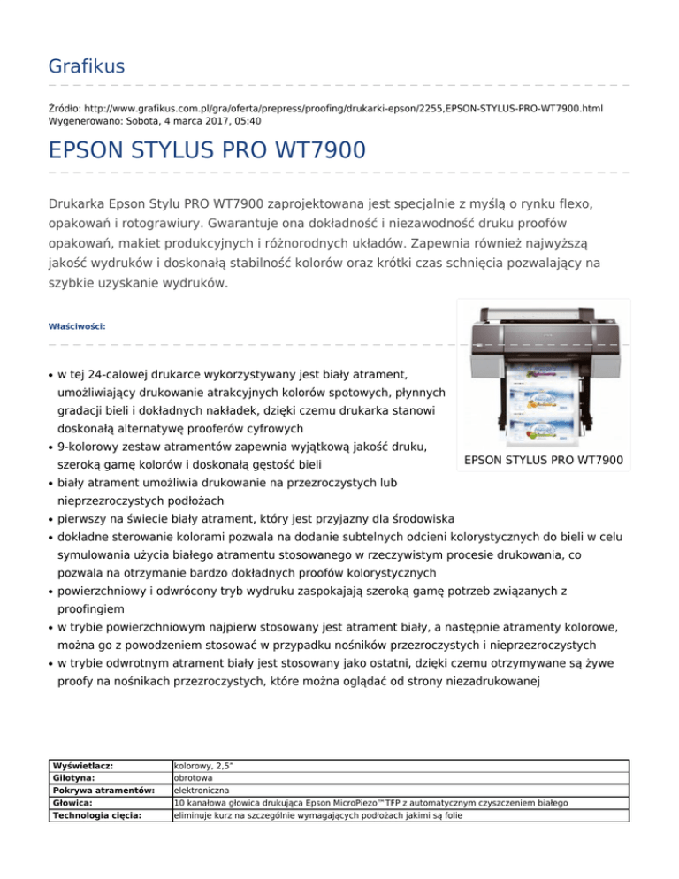 Grafikus Źródło: http://www.grafikus.com.pl/gra/oferta/prepress/proofing/drukarki-epson/2255,EPSON-STYLUS-PRO-WT7900.html Wygenerowano: Sobota, 4 marca 2017, 05:40 EPSON STYLUS PRO WT7900 Drukarka Epson Stylu PRO WT7900 zaprojektowana jest specjalnie z myślą o rynku flexo, opakowań i rotograwiury. Gwarantuje ona dokładność i niezawodność druku proofów opakowań, makiet produkcyjnych i różnorodnych układów. Zapewnia również najwyższą jakość wydruków i doskonałą stabilność kolorów oraz krótki czas schnięcia pozwalający na szybkie uzyskanie wydruków. Właściwości: ● w tej 24-calowej drukarce wykorzystywany jest biały atrament, umożliwiający drukowanie atrakcyjnych kolorów spotowych, płynnych gradacji bieli i dokładnych nakładek, dzięki czemu drukarka stanowi doskonałą alternatywę prooferów cyfrowych ● 9-kolorowy zestaw atramentów zapewnia wyjątkową jakość druku, szeroką gamę kolorów i doskonałą gęstość bieli ● EPSON STYLUS PRO WT7900 biały atrament umożliwia drukowanie na przezroczystych lub nieprzezroczystych podłożach ● pierwszy na świecie biały atrament, który jest przyjazny dla środowiska ● dokładne sterowanie kolorami pozwala na dodanie subtelnych odcieni kolorystycznych do bieli w celu symulowania użycia białego atramentu stosowanego w rzeczywistym procesie drukowania, co pozwala na otrzymanie bardzo dokładnych proofów kolorystycznych ● powierzchniowy i odwrócony tryb wydruku zaspokajają szeroką gamę potrzeb związanych z proofingiem ● w trybie powierzchniowym najpierw stosowany jest atrament biały, a następnie atramenty kolorowe, można go z powodzeniem stosować w przypadku nośników przezroczystych i nieprzezroczystych ● w trybie odwrotnym atrament biały jest stosowany jako ostatni, dzięki czemu otrzymywane są żywe proofy na nośnikach przezroczystych, które można oglądać od strony niezadrukowanej Wyświetlacz: Gilotyna: Pokrywa atramentów: Głowica: Technologia cięcia: kolorowy, 2,5” obrotowa elektroniczna 10 kanałowa głowica drukująca Epson MicroPiezo™TFP z automatycznym czyszczeniem białego eliminuje kurz na szczególnie wymagających podłożach jakimi są folie Czas cięcia: Tusze: Wkłady atramentowe: Rozdzielczość max.: Szybkość wydruku: Napięcie: Pobór mocy: Poziom hałasu: Wymiary: Waga: dla 24” arkusza < 1s. 9-kolorowy zestaw tuszy Epson UltraChrome HDR z białym atramentem pojemne, ciśnieniowe, 2 rozmiary – 350 i 700ml wkłady kolorowe, 350ml wkłady białe, zapewniają zgodność ze środowiskiem pracy, zwiększają ilość wydruków oraz gwarantujących spokój podczas wydruków nocnych 2880 x 1440 dpi (druk standardowy), 1440 x 1440 dpi (wydruk z użyciem białego atramentu) tryb powierzchniowy (720 x 1440dpi) na formacie A2: max. 9,8min. (dwukierunkowy) prąd zmienny, 100-240V, 50/60Hz tryb pracy - 70 W, tryb uśpienia - poniżej 16W, tryb oczekiwania - poniżej 1W <50dB (A) 1356mm x 667mm x 1218mm 103kg w całości
