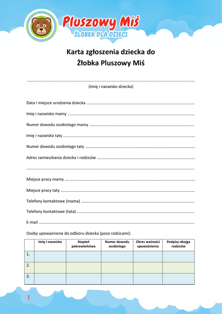 Karta zgłoszenia dziecka do Żłobka Pluszowy Miś