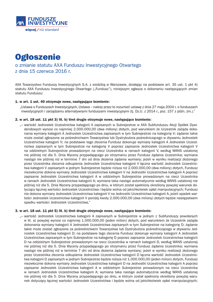 Ogłoszenie o zmianie statutu AXA Funduszu Inwestycyjnego Otwartego z dnia 15 czerwca 2016 r. AXA Towarzystwo Funduszy Inwestycyjnych S.A. z siedzibą w Warszawie, działając na podstawie art. 35 ust. 1 pkt 4) statutu AXA Funduszu Inwestycyjnego Otwartego („Fundusz”), niniejszym ogłasza o dokonaniu następujących zmian statutu Funduszu: 1. w art. 1 ust. 40 otrzymuje nowe, następujące brzmienie: „Ustawa o Funduszach Inwestycyjnych, Ustawa – należy przez to rozumieć ustawę z dnia 27 maja 2004 r. o funduszach inwestycyjnych i zarządzaniu alternatywnymi funduszami inwestycyjnymi (tj. Dz.U. z 2014 r., poz. 157 z późn. zm.).” 2. w art. 18 ust. 11 pkt 3) lit. b) tiret drugie otrzymuje nowe, następujące brzmienie: „– wartość Jednostek Uczestnictwa kategorii A zapisanych w Subrejestrze w AXA Subfunduszu Akcji Spółek Dywi dendowych wynosi co najmniej 2.000.000,00 (dwa miliony) złotych, pod warunkiem że Uczestnik zażąda doko nania wymiany kategorii A Jednostek Uczestnictwa zapisanych w tym Subrejestrze na kategorię V; żądanie takie może zostać zgłoszone za pośrednictwem Towarzystwa lub Dystrybutora pośredniczącego w zbywaniu Jednostek Uczestnictwa kategorii V; na podstawie tego zlecenia Fundusz dokonuje wymiany kategorii A Jednostek Uczest nictwa zapisanych w tym Subrejestrze na kategorię V poprzez zapisanie Jednostek Uczestnictwa kategorii V na oddzielnym Subrejestrze prowadzonym na rzecz Uczestnika w ramach kategorii V, według WANS ustalonej nie później niż dla 5. Dnia Wyceny przypadającego po otrzymaniu przez Fundusz żądania Uczestnika; wymiana nastąpi nie później niż w terminie 7 dni od dnia złożenia żądania wymiany; jeżeli w wyniku realizacji złożonego przez Uczestnika zlecenia odkupienia Jednostek Uczestnictwa kategorii V łączna wartość Jednostek Uczestnic twa kategorii V zapisanych w jednym Subrejestrze będzie niższa niż 2.000.000,00 (dwa miliony) złotych, Fundusz niezwłocznie dokona wymiany Jednostek Uczestnictwa kategorii V na Jednostki Uczestnictwa kategorii A poprzez zapisanie Jednostek Uczestnictwa kategorii A w oddzielnym Subrejestrze prowadzonym na rzecz Uczestnika w ramach Jednostek Uczestnictwa kategorii A; wymiana taka nastąpi automatycznie według WANS ustalonej nie później niż dla 5. Dnia Wyceny przypadającego po dniu, w którym został spełniony określony powyżej warunek do tyczący łącznej wartości Jednostek Uczestnictwa i będzie wolna od jakichkolwiek opłat manipulacyjnych; Fundusz nie dokona wymiany Jednostek Uczestnictwa kategorii V na Jednostki Uczestnictwa kategorii A, jeżeli spadek war tości Jednostek Uczestnictwa kategorii V poniżej kwoty 2.000.000,00 (dwa miliony) złotych będzie następstwem spadku wartości Jednostek Uczestnictwa,” 3. w art. 18 ust. 11 pkt 5) lit. b) tiret drugie otrzymuje nowe, następujące brzmienie: „– wartość Jednostek Uczestnictwa kategorii A zapisanych w Subrejestrze w jednym z Subfunduszy powołanych w lit. a) powyżej wynosi co najmniej 1.000.000,00 (jeden milion) złotych, pod warunkiem że Uczestnik zażąda dokonania wymiany kategorii A Jednostek Uczestnictwa zapisanych w tym Subrejestrze na kategorię D; żądanie takie może zostać zgłoszone za pośrednictwem Towarzystwa lub Dystrybutora pośredniczącego w zbywaniu Jed nostek Uczestnictwa kategorii D; na podstawie tego zlecenia Fundusz dokonuje wymiany kategorii A Jednostek Uczestnictwa zapisanych w tym Subrejestrze na kategorię D poprzez zapisanie Jednostek Uczestnictwa kategorii D na oddzielnym Subrejestrze prowadzonym na rzecz Uczestnika w ramach kategorii D, według WANS ustalonej nie później niż dla 5. Dnia Wyceny przypadającego po otrzymaniu przez Fundusz żądania Uczestnika; wymiana nastąpi nie później niż w terminie 7 dni od dnia złożenia żądania wymiany; jeżeli w wyniku realizacji złożonego przez Uczestnika zlecenia odkupienia Jednostek Uczestnictwa kategorii D łączna wartość Jednostek Uczestnic twa kategorii D zapisanych w jednym Subrejestrze będzie niższa niż 1.000.000,00 (jeden milion) złotych, Fundusz niezwłocznie dokona wymiany Jednostek Uczestnictwa kategorii D na Jednostki Uczestnictwa kategorii A poprzez zapisanie Jednostek Uczestnictwa kategorii A w oddzielnym Subrejestrze prowadzonym na rzecz Uczestnika w ramach Jednostek Uczestnictwa kategorii A; wymiana taka nastąpi automatycznie według WANS ustalonej nie później niż dla 5. Dnia Wyceny przypadającego po dniu, w którym został spełniony określony powyżej waru nek dotyczący łącznej wartości Jednostek Uczestnictwa i będzie wolna od jakichkolwiek opłat manipulacyjnych; Fundusz nie dokona wymiany Jednostek Uczestnictwa kategorii D na Jednostki Uczestnictwa kategorii A, jeżeli spadek wartości Jednostek Uczestnictwa kategorii D poniżej kwoty 1.000.000,00 (jeden milion) złotych będzie następstwem spadku wartości Jednostek Uczestnictwa;” 4. w art. 19a ust. 2 i 3 otrzymują nowe, następujące brzmienie: „2. Z bycie Jednostek Uczestnictwa nastąpi nie później niż w terminie 7 (siedmiu) dni od dnia złożenia zlecenia na bycia i dokonania wpłaty na te Jednostki Uczestnictwa na rachunek Funduszu, a w przypadku wpłat w papierach wartościowych – od dnia zapisania wpłaty na rachunku papierów wartościowych Funduszu, chyba że opóźnienie jest następstwem zdarzeń, za które Fundusz nie ponosi odpowiedzialności, a w szczególności złożenia wadliwe go zlecenia nabycia. Zlecenia nabycia otrzymane tego samego dnia realizowane są po cenie Jednostki Uczest nictwa według WANS ustalonej dla tego samego Dnia Wyceny, przypadającego nie później niż w 5. Dniu Wyceny po dniu, w którym Agent Transferowy otrzymał informację o takich zleceniach nabycia oraz o wpłynięciu środków na nabycie Jednostek Uczestnictwa na rachunek Funduszu prowadzony na rzecz danego Subfunduszu. 3. O dkupienie Jednostek Uczestnictwa nastąpi nie później niż w terminie 7 (siedmiu) dni od dni