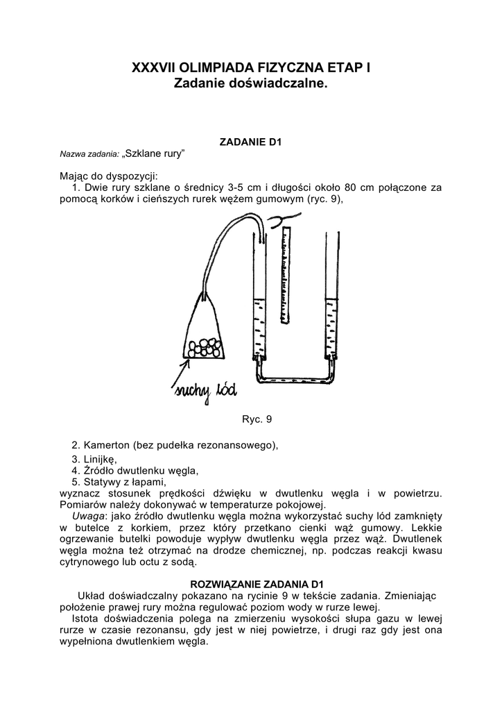 XXXVII OLIMPIADA FIZYCZNA ETAP I Zadanie doświadczalne. ZADANIE D1 Nazwa zadania: „Szklane rury” Mając do dyspozycji: 1. Dwie rury szklane o średnicy 3-5 cm i długości około 80 cm połączone za pomocą korków i cieńszych rurek wężem gumowym (ryc. 9), Ryc. 9 2. Kamerton (bez pudełka rezonansowego), 3. Linijkę, 4. Źródło dwutlenku węgla, 5. Statywy z łapami, wyznacz stosunek prędkości dźwięku w dwutlenku węgla i w powietrzu. Pomiarów należy dokonywać w temperaturze pokojowej. Uwaga: jako źródło dwutlenku węgla można wykorzystać suchy lód zamknięty w butelce z korkiem, przez który przetkano cienki wąż gumowy. Lekkie ogrzewanie butelki powoduje wypływ dwutlenku węgla przez wąż. Dwutlenek węgla można też otrzymać na drodze chemicznej, np. podczas reakcji kwasu cytrynowego lub octu z sodą. ROZWIĄZANIE ZADANIA D1 Układ doświadczalny pokazano na rycinie 9 w tekście zadania. Zmieniając położenie prawej rury można regulować poziom wody w rurze lewej. Istota doświadczenia polega na zmierzeniu wysokości słupa gazu w lewej rurze w czasie rezonansu, gdy jest w niej powietrze, i drugi raz gdy jest ona wypełniona dwutlenkiem węgla. W czasie rezonansu węzeł prędkości fali stojącej musi być przy powierzchni wody, natomiast przy górnym otworze musi wystąpić strzałka. Najmniejsza λ wysokość słupa powietrza w czasie rezonansu wynosi więc , gdzie λ jest 4 długością fali dźwiękowej wywołanej przez kamerton (o nieznanej częstości ν ), zaś υ = λν , Znając λ w obu przypadkach, z wzorów: υCO = λCO ν 2 2 υ pow = λ powν dostajemy υ CO = λCO . υ POW λ POW Recenzent otrzymał następujące wyniki: 1 λCO = (17 .0 ± 0.2 )cm, 4 1 λPOW = (19.0 ± 0.2) cm. 4 Stąd υ CO = 0 .89 ± 0 .02. υ POW Strzałka fali stojącej ze względu na różnego rodzaju efekty brzegowe nie wypada dokładnie w otwartym końcu rury i dlatego celowe jest wyznaczenie dwóch kolejnych wysokości słupa gazu przy których zachodzi rezonans. Różnica λ tych wysokości jest równa . Nie zawsze jednak daje się to uzyskać w 2 warunkach domowych. Przy wykonywaniu pomiarów z dwutlenkiem węgla należy zadbać o to, by w rurze był czysty CO 2, a nie jego mieszanina z powietrzem. Najłatwiej osiągnąć to zaczynając pomiar od wysokości słupa gazu większej niż przewidywana wysokość w rezonansie i zmniejszając tę wysokość dojść do wysokości rezonansowej. W tym przypadku wprowadzany do rury C02 w czasie pomiarów będzie z rury wychodził a na jego miejsce nie będzie wchodziło powietrze. Efekt ten nie daje się jednak całkowicie wyeliminować. Warto też zwrócić uwagę na to, by dwutlenek węgla użyty do doświadczenia był suchy (waże przy produkcji CO2 metodą rugowania z roztworem). Część teoretyczna zadania nie sprawiła uczniom żadnych kłopotów. Olbrzymia większość prac była poprawna z tym, że niewielu uczniów zwróciło uwagę na celowość pomiaru dwu częstości rezonansowych, zarówno dla powietrza jak i dla dwutlenku węgla. Część doświadczalna była zwykle także poprawna. Najwięcej trudności sprawiło uczniom zapobieżenie mieszania się dwutlenku węgla z powietrzem w czasie pomiarów i stąd spory rozrzut uzyskiwanych wyników. Zadanie to było nieco rzadziej wybierane niż zadanie D2. Brak podanej punktacji do rozwiązania zadania. 2 2 2 2 Źródło: Zadanie pochodzi z czasopisma „Fizyka w Szkole”87/88 Komitet Okregowy Olimpiady Fizycznej w Szczecinie www.of.szc.pl