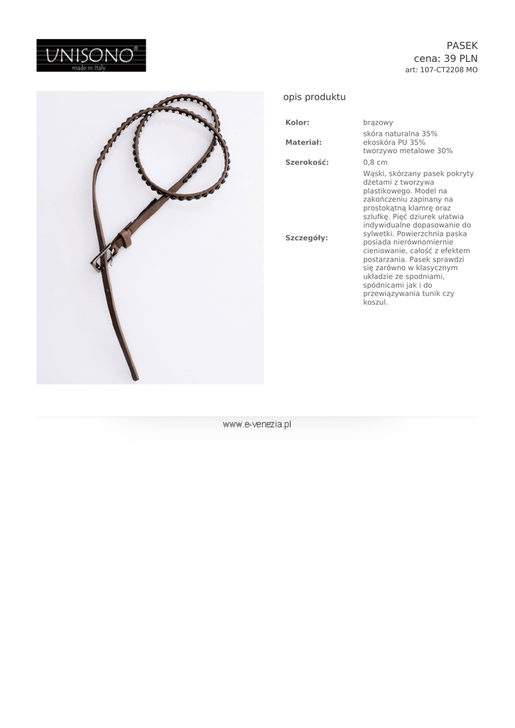 PASEK cena: 39 PLN art: 107-CT2208 MO opis produktu Kolor: brązowy Materiał: skóra naturalna 35% ekoskóra PU 35% tworzywo metalowe 30% Szerokość: 0,8 cm Szczegóły: Wąski, skórzany pasek pokryty dżetami z tworzywa plastikowego. Model na zakończeniu zapinany na prostokątną klamrę oraz szlufkę. Pięć dziurek ułatwia indywidualne dopasowanie do sylwetki. Powierzchnia paska posiada nierównomiernie cieniowanie, całość z efektem postarzania. Pasek sprawdzi się zarówno w klasycznym układzie ze spodniami, spódnicami jak i do przewiązywania tunik czy koszul.