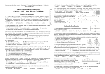 Stowarzyszenie Absolwentów i Przyjaciół V Liceum Ogólnokształcącego w Krakowie http://lwiatko.org Zadania 1–10 za 3 punkty 1. „Lwiątko” odbywa się co roku w ostatni poniedziałek marca, ale w roku 2016 dnia 28 marca przypada poniedziałek wielkanocny, więc konkurs trzeba przenieść na któryś z sąsiednich poniedziałków. W dodatku rok 2016 jest przestępny. Ile dni może liczyć odstęp między „Lwiątkiem 2014” a „Lwiątkiem 2016”? Uwaga: od dzisiaj do pojutrza jest odstęp dwóch dni, nie trzech! A. 721 lub 735. B. 722 lub 736. C. 723 lub 737. D. 728. E. 731. 2. Średnia temperatura Ziemi nie rośnie, mimo że Ziemia otrzymuje stale energię ze Słońca. Dzieje się tak z powodu strat energii przez A. przewodnictwo cieplne, B. promieniowanie, C. konwekcję, D. parowanie. E. Ziemia wcale nie traci energii, co jest powodem efektu cieplarnianego. 3. W pociągu, pod sufitem przedziału, ktoś umieścił zaśnieżone narty. Przedział jest ogrzewany i ma zamknięte okna. Gdy pociąg stoi, krople wody kapią na podłogę przedziału pionowo. Gdy pociąg jednostajnie zakręca w lewo, krople spadają A. na ten sam punkt podłogi, co na postoju, B. na punkt przesunięty w stronę jazdy pociągu, C. na punkt przesunięty w prawo, D. na punkt przesunięty w lewo, E. na punkt przesunięty w stronę przeciwną do jazdy pociągu. 4. W ubiegłym roku A. odkryto kolejny kwark, B. odkryto neutrony poruszające się szybciej od światła, C. odkryto izotop wodoru 3H, D. jedna z planet przeszła na tle tarczy Słońca, E. nastąpiło zaćmienie Słońca przez Księżyc w pełni. 5. W szklanej, U-kształtnej rurce, o jednakowym przekroju ramion, znajduje się woda. Do obu ramion rurki wrzucono dwie drewniane kulki: do lewego – kulkę o masie m1, do prawego – kulkę o masie m2 (m2 > m1). Kulki pływają przy powierzchni wody. Po wrzuceniu kulek poziom wody A. w obu ramionach podniesie się, ale w lewym bardziej, B. w obu ramionach podniesie się, ale w prawym bardziej, C. w obu ramionach podniesie się jednakowo, D. w lewym ramieniu podniesie się, a w prawym obniży, E. w lewym ramieniu obniży się, a w prawym podniesie. 6. Gdyby zatrzymać Ziemię i Księżyc w chwili, gdy znajduje się on dokładnie na jednej linii pomiędzy Ziemią i Słońcem, a następnie pozwolić Księżycowi poruszać się swobodnie, to A. Księżyc spadnie na Ziemię, B. Księżyc spadnie na Słońce, C. Księżyc pozostanie w spoczynku, D. Księżyc i tak zacznie krążyć wokół Ziemi, E. wszystkie ciała w Układzie Słonecznym również zatrzymają się. 7. Odkryta w ubiegłym roku cząstka elementarna to być może od dawna poszukiwana tzw. boska cząstka, nazywana również bozonem A. Einsteina, B. Hawkinga, C. Higgsa, D. Plancka, E. Hubble’a. © Copyright by SAiP V LO Kraków Polsko-Ukraiński Konkurs Fizyczny „Lwiątko – 2013” klasy II liceum i technikum 8. Na biegunie północnym 22 grudnia Księżyc widać przez całe 24 godziny, gdy jest w pobliżu A. pełni, B. nowiu, C. I kwadry, D. III kwadry. E. Inna odpowiedź. 9. Za ciemnym kwadratem kryje się pojedyncze zwierciadło, które odbija zbieżną wiązkę światła (rys.). Każda linia pokazuje jeden z promieni padających i jeden z odbitych. Zwierciadło to może być A. tylko płaskie, B. tylko wypukłe, C. tylko wklęsłe, D. wypukłe lub wklęsłe, ale nie płaskie, E. płaskie, wypukłe lub wklęsłe. 10. Dwa impulsy poruszają się po naciągniętym, gumowym sznurze, w przeciwne strony, każdy z szybkością 1 m/s (rys.). Jednostka odległości na osi to 1 m. Który z rysunków przedstawia kształt sznura 4 s później? Zadania 11–20 za 4 punkty 11. Które z podanych liczb mogą być wskazaniami idealnych woltomierzy – górnego i dolnego (rysunek)? A. 0 V, 0 V. B. 0 V, 3 V. C. 3 V, 0 V. D. 6 V, 6 V. E. 3 V, 6 V. 12. Pociąg porusza się po prostej ze stałą prędkością, a w wagonie skacze sobie małpka. Porównujemy prędkości, przyspieszenia oraz drogi przebyte przez małpkę względem wagonu i względem układu odniesienia związanego z torami. A. Prędkości, przyspieszenia i drogi przebyte względem obu układów odniesienia są jednakowe. B. Prędkości i drogi są jednakowe, a przyspieszenia różne. C. Przyspieszenia są jednakowe, a prędkości i drogi różne. D. Prędkości są jednakowe, a przyspieszenia i drogi różne. E. Prędkości, przyspieszenia i drogi są różne. 13. Do szklanki pełnej wody włożono drewnianą kulkę (rys.), wskutek czego część wody wylała się. Wagi wyskalowano w gramach. Po dokładnym wytarciu rozlanej wody, wskazanie wagi 2 w porównaniu ze wskazaniem wagi 1 będzie A. niższe o masę wylanej wody, B. takie samo, C. niższe o masę mniejszą niż ma wylana woda, D. wyższe o masę kulki, E. wyższe o różnicę między masą kulki a masą wylanej wody. 14. Gdy samochód pana Leona rusza z pewnym stałym przyspieszeniem, w ciągu pierwszej sekundy uzyskuje energię kinetyczną 1,2 kJ. Poruszając się nadal z tym samym przyspieszeniem, samochód w ciągu następnych dwóch sekund zwiększy swą energię kinetyczną o A. 2,4 kJ, B. 3,6 kJ, C. 4,8 kJ, D. 9,6 kJ, E. 10,8 kJ. 15. Podziurkowaną metalową listwę o masie 2 kg powieszono za jedną z dziurek, jak pokazuje rysunek. Podczepienie ciężarka 1 kg do jednej z dziurek oznaczonych literami pozwoli listwie być w równowadze w położeniu poziomym. Która to dziurka? 16. Promień Ziemi wynosi około 6400 km, a promień jej orbity 150 mln km. Jaka, w przybliżeniu, część energii emitowanej przez Słońce dociera do Ziemi? A. 4,2∙10−5. B. 1,8∙10−9. C. 9∙10−10. D. 4,5∙10−10. E. 4,5∙10−16. 17. Jednorodny walec stacza się bez poślizgu z równi pochyłej, dużo dłuższej od promienia walca, w czasie t. Walec wykonany z tego samego materiału, ale o wszystkich wymiarach dwa razy mniejszych będzie staczał się z tej samej równi w czasie A. t / 8, B. t / 4, C. t / 2, D. t, E. 2t. 18. Ramiona U-rur