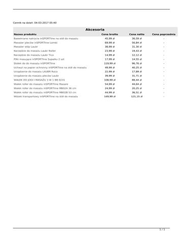 Cennik na dzień: 04-03-2017 05:40 Akcesoria Nazwa produktu Cena brutto Cena netto Cena poprzednia Bawełniane nakrycie inSPORTline na stół do masażu 45,99 zł 36,59 zł - Masażer pleców inSPORTline Lombi 69,99 zł 56,84 zł - Masażer stóp Laubr 38,99 zł 31,30 zł - Narzędzie do masażu Laubr Roller 23,99 zł 19,43 zł - Narzędzie do masażu Laubr Tico 14,99 zł 12,12 zł - Piłki masujące inSPORTline Supaiku 2 szt 17,99 zł 14,55 zł - Stołek do do masażu inSPORTline 119,99 zł 96,76 zł - Uchwyt na papier ochronny inSPORTline na stół do masażu 49,99 zł 40,25 zł - Urządzenie do masażu LAUBR Roco 22,99 zł 17,89 zł - Urządzenie do masażu pleców Laubr 39,99 zł 31,71 zł - WAŁEK DO JOGI I MASAŻU 3 W 1 BB 0231 108,99 zł 88,44 zł - Wałek roller do masażu inSPORTline Masare 54,99 zł 44,64 zł - Wałek roller do masażu inSPORTline MB02A 36 cm 24,99 zł 20,25 zł - 44,99 zł 36,51 zł - 149,99 zł 121,15 zł - Wałek roller do masażu inSPORTline MB02B 53 cm Wózek transportowy inSPORTline na stół do masażu 1/1 Powered by TCPDF (www.tcpdf.org)