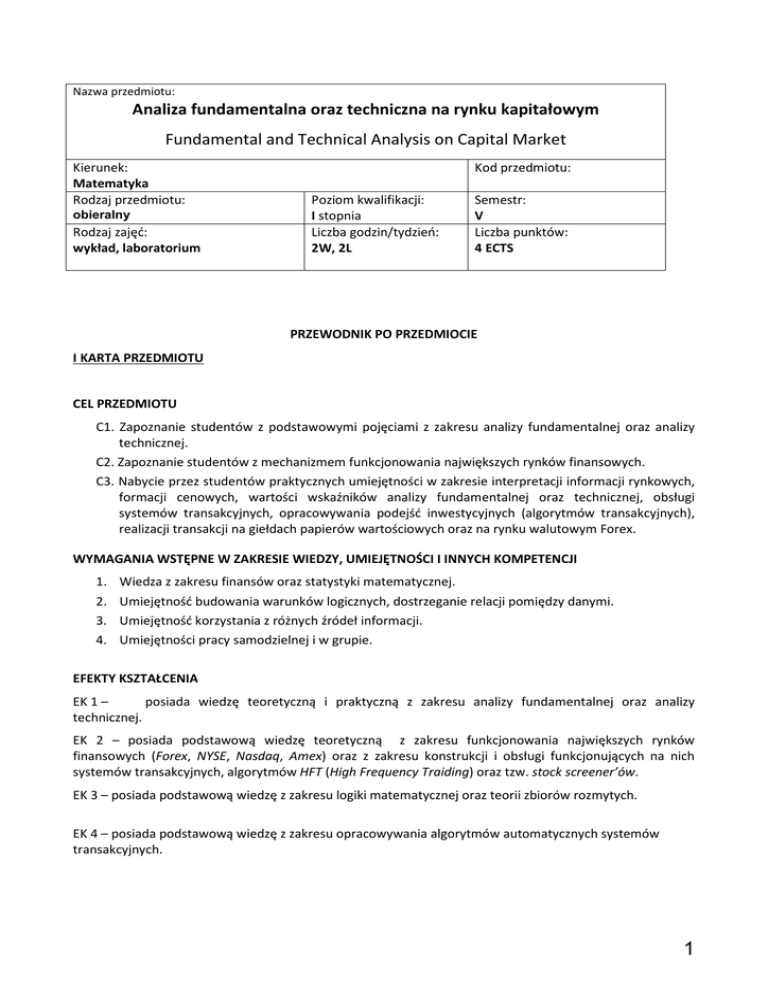 Nazwa przedmiotu: Analiza fundamentalna oraz techniczna na rynku kapitałowym Fundamental and Technical Analysis on Capital Market Kierunek: Matematyka Rodzaj przedmiotu: obieralny Rodzaj zajęć: wykład, laboratorium Kod przedmiotu: Poziom kwalifikacji: I stopnia Liczba godzin/tydzień: 2W, 2L Semestr: V Liczba punktów: 4 ECTS PRZEWODNIK PO PRZEDMIOCIE I KARTA PRZEDMIOTU CEL PRZEDMIOTU C1. Zapoznanie studentów z podstawowymi pojęciami z zakresu analizy fundamentalnej oraz analizy technicznej. C2. Zapoznanie studentów z mechanizmem funkcjonowania największych rynków finansowych. C3. Nabycie przez studentów praktycznych umiejętności w zakresie interpretacji informacji rynkowych, formacji cenowych, wartości wskaźników analizy fundamentalnej oraz technicznej, obsługi systemów transakcyjnych, opracowywania podejść inwestycyjnych (algorytmów transakcyjnych), realizacji transakcji na giełdach papierów wartościowych oraz na rynku walutowym Forex. WYMAGANIA WSTĘPNE W ZAKRESIE WIEDZY, UMIEJĘTNOŚCI I INNYCH KOMPETENCJI 1. 2. 3. 4. Wiedza z zakresu finansów oraz statystyki matematycznej. Umiejętność budowania warunków logicznych, dostrzeganie relacji pomiędzy danymi. Umiejętność korzystania z różnych źródeł informacji. Umiejętności pracy samodzielnej i w grupie. EFEKTY KSZTAŁCENIA EK 1 – posiada wiedzę teoretyczną i praktyczną z zakresu analizy fundamentalnej oraz analizy technicznej. EK 2 – posiada podstawową wiedzę teoretyczną z zakresu funkcjonowania największych rynków finansowych (Forex, NYSE, Nasdaq, Amex) oraz z zakresu konstrukcji i obsługi funkcjonujących na nich systemów transakcyjnych, algorytmów HFT (High Frequency Traiding) oraz tzw. stock screener’ów. EK 3 – posiada podstawową wiedzę z zakresu logiki matematycznej oraz teorii zbiorów rozmytych. EK 4 – posiada podstawową wiedzę z zakresu opracowywania algorytmów automatycznych systemów transakcyjnych. 1 TREŚCI PROGRAMOWE Forma zajęć – WYKŁADY W1 – Struktura rynku finansowego. Omówienie zasad funkcjonowania rynku walutowego Forex oraz największych giełd papierów wartościowych (NYSE, Nasdaq) . W2 – Podstawy analizy fundamentalnej. W3 – Wskaźniki mikro- i makroekonomiczne. W4 – Podstawy analizy technicznej. W5 – Świece japońskie. W6 – Formacje cenowe. W7 – Metody analizy wykresów notowań giełdowych. W8 – Wskaźniki analizy technicznej. W9 – Metody formułowania decyzji transakcyjnych na podstawie analizy wartości uzyskiwanych przez wybrane wskaźniki analizy technicznej. W10 – Wprowadzenie do przetwarzanie wiedzy nieprecyzyjnej. W11 – Zastosowanie arytmetyki przedziałowej w analizie danych giełdowych. W12 – Metody konstruowania algorytmów systemów generujących sygnały transakcyjne w oparciu o analizę danych rynkowych. W13 – Informatyzacja rynków finansowych. Wprowadzenie do daytradingu. W14 – Rodzaje zleceń rynkowych. Zasady składania zleceń za pośrednictwem sieci ECN (Electronic Communication Network). W 5 – Metody daytradingu i strategie handlowe. Forma zajęć – LABORATORIUM L1 – Źródła informacji rynkowych. L2 – Platformy handlu elektronicznego obsługujące rynek walutowy Forex. L3 – Platformy handlu elektronicznego obsługujące wybrane giełdy papierów wartościowych (NYSE, Nasdaq, Amex). L4 – Zastosowanie analizy fundamentalnej w praktyce – analiza archiwalnych danych rynkowych na tle zaistniałych wydarzeń (rynkowych, politycznych, itp.) L5 – Zastosowanie tzw. stock screener’ów - specjalistycznych narzędzi informatycznych do analizy danych giełdowych. L6 – Wyszukiwanie grup spółek notowanych na wybranych giełdach spełniających określone warunki. L7 – Formacje cenowe w praktyce – wyszukiwanie, interpretacja. L8 – Świece japońskie w praktyce. L9 – Zastosowanie wskaźników analizy technicznej na rynkach finansowych. L10 – Transakcje rynkowe - obliczanie zysku/strat osiągniętego poprzez realizację poszczególnych transakcji rynkowych L11 – Analiza informacji prezentowanej w Level 2 oraz w TAS (Time and Sale) L12 – Symulator notowań giełdowych – zapoznanie z podstawowymi metodami otwierania i zamykania pozycji L13 – Zastosowanie metod logiki rozmytej na rynkach finansowych. L14 – Opracowanie algorytmu systemu transakcyjnego – adaptacja wyselekcjonowanych wskaźników analizy technicznej. L15 – Opracowanie algorytmu systemu transakcyjnego – definicja założeń inwestycyjnych. Liczba godzin 2 2 2 2 2 2 2 2 2 2 2 2 2 2 Liczba godzin 2 2 2 2 2 2 2 2 2 2 2 2 2 2 2 2 NARZĘDZIA DYDAKTYCZNE 1. – wykład z wykorzystaniem prezentacji multimedialnych 2. – ćwiczenia laboratoryjne - stanowiska wyposażone w systemy informatyczne symulujące procesy transakcyjne oraz posiadające dostęp do źródeł informacji rynkowych 3. – instrukcje do wykonania ćwiczeń laboratoryjnych SPOSOBY OCENY ( F – FORMUJĄCA, P – PODSUMOWUJĄCA) F1. – ocena przygotowania do ćwiczeń laboratoryjnych F2. – ocena umiejętności stosowania zdobytej wiedzy podczas wykonywania ćwiczeń F3. – ocena aktywności podczas zajęć P1. – ocena umiejętności rozwiązywania postawionych problemów oraz sposobu prezentacji uzyskanych wyników – zaliczenie na ocenę* *) warunkiem uzyskania zaliczenia jest otrzymanie pozytywnych ocen ze wszystkich kolokwiów, OBCIĄŻENIE PRACĄ STUDENTA Forma aktywności Godziny kontaktowe z prowadzącym Średnia liczba godzin na zrealizowanie aktywności 30W + 30L 60 h Konsultacje z prowadzącym 5h Zapoznanie się ze wskazaną literaturą 10 h Przygotowanie do ćwiczeń laboratoryjnych 15 h Wykonanie sprawozdań z realizacji ćwiczeń laboratoryjnych 10 h (czas poza zajęciami laboratoryjnymi) Suma SUMARYCZNA LICZBA PUNKTÓW ECTS DLA PRZEDMIOTU Liczba punktów ECTS, którą student uzyskuje na zajęciach wymagających bezpośredniego udziału prowadzącego Liczba punktów ECTS, którą student uzyskuje w ramach zajęć o charakterz
