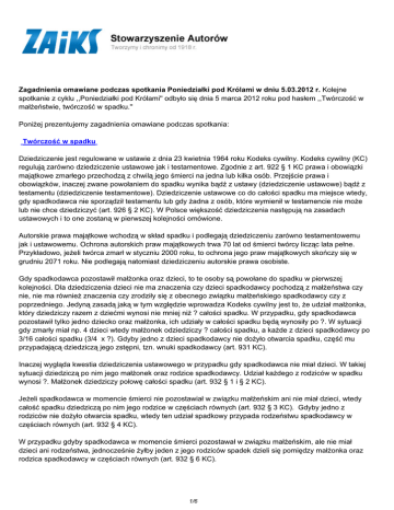 Zagadnienia omawiane podczas spotkania Poniedziałki pod Królami w dniu 5.03.2012 r. Kolejne spotkanie z cyklu ,,Poniedziałki pod Królami'' odbyło się dnia 5 marca 2012 roku pod hasłem ,,Twórczość w małżeństwie, twórczość w spadku.'' Poniżej prezentujemy zagadnienia omawiane podczas spotkania: Twórczość w spadku Dziedziczenie jest regulowane w ustawie z dnia 23 kwietnia 1964 roku Kodeks cywilny. Kodeks cywilny (KC) regulują zarówno dziedziczenie ustawowe jak i testamentowe. Zgodnie z art. 922 § 1 KC prawa i obowiązki majątkowe zmarłego przechodzą z chwilą jego śmierci na jedna lub kilka osób. Przejście prawa i obowiązków, inaczej zwane powołaniem do spadku wynika bądź z ustawy (dziedziczenie ustawowe) bądź z testamentu (dziedziczenie testamentowe). Dziedziczenie ustawowe co do całości spadku ma miejsce wtedy, gdy spadkodawca nie sporządził testamentu lub gdy żadna z osób, które wymienił w testamencie nie może lub nie chce dziedziczyć (art. 926 § 2 KC). W Polsce większość dziedziczenia następują na zasadach ustawowych i to one zostaną w pierwszej kolejności omówione. Autorskie prawa majątkowe wchodzą w skład spadku i podlegają dziedziczeniu zarówno testamentowemu jak i ustawowemu. Ochrona autorskich praw majątkowych trwa 70 lat od śmierci twórcy licząc lata pełne. Przykładowo, jeżeli twórca zmarł w styczniu 2000 roku, to ochrona jego praw majątkowych skończy się w grudniu 2071 roku. Nie podlegają natomiast dziedziczeniu autorskie prawa osobiste. Gdy spadkodawca pozostawił małżonka oraz dzieci, to te osoby są powołane do spadku w pierwszej kolejności. Dla dziedziczenia dzieci nie ma znaczenia czy dzieci spadkodawcy pochodzą z małżeństwa czy nie, nie ma również znaczenia czy zrodziły się z obecnego związku małżeńskiego spadkodawcy czy z poprzedniego. Jedyną zasadą jaką w tym względzie wprowadza Kodeks cywilny jest to, że udział małżonka, który dziedziczy razem z dziećmi wynosi nie mniej niż ? całości spadku. W przypadku, gdy spadkodawca pozostawił tylko jedno dziecko oraz małżonka, ich udziały w całości spadku będą wynosiły po ?. W sytuacji gdy zmarły miał np. 4 dzieci wtedy małżonek odziedziczy ? całości spadku, a każde z dzieci spadkodawcy po 3/16 całości spadku (3/4 x ?). Gdyby jedno z dzieci spadkodawcy nie dożyło otwarcia spadku, część mu przypadającą dziedziczą jego zstępni, tzn. wnuki spadkodawcy (art. 931 KC). Inaczej wygląda kwestia dziedziczenia ustawowego w przypadku gdy spadkodawca nie miał dzieci. W takiej sytuacji dziedziczą po nim jego małżonek oraz rodzice spadkodawcy. Udział każdego z rodziców w spadku wynosi ?. Małżonek dziedziczy połowę całości spadku (art. 932 § 1 i § 2 KC). Jeżeli spadkodawca w momencie śmierci nie pozostawiał w związku małżeńskim ani nie miał dzieci, wtedy całość spadku dziedziczą po nim jego rodzice w częściach równych (art. 932 § 3 KC). Gdyby jedno z rodziców nie dożyło otwarcia spadku, wtedy ten udział spadkowy przypada rodzeństwu spadkodawcy w częściach równych (art. 932 § 4 KC). W przypadku gdyby spadkodawca w momencie śmierci pozostawał w związku małżeńskim, ale nie miał dzieci ani rodzeństwa, jednocześnie żyłby jeden z jego rodziców spadek dzieli się pomiędzy małżonka oraz rodzica spadkodawcy w częściach równych (art. 932 § 6 KC). 1/6 W sytuacji gdy spadkodawca oprócz małżonka nie miał innej rodziny (jego rodzice już nie żyją, spadkodawca nigdy nie miał dzieci oraz nie miał rodzeństwa), całość spadku dziedziczy małżonek spadkodawcy (art. 933 § 2). Ważną zasadę wyraża art. 933 § 1 KC, który stanowi, iż udział małżonka spadkodawcy, który dziedziczy w zbiegu z rodzicami, rodzeństwem oraz dziećmi rodzeństwa spadkodawcy wynosi nie mniej niż połowę spadku. Taki przypadek będzie miał miejsce, gdy spadkodawca nie miał dzieci, a w momencie śmierci pozostawał w związku małżeńskim. Jak już zostało wyjaśnione powyżej, na wypadek śmierci może zostać spisany testament, w którym spadkodawca rozrządzi swoim majątkiem. Sporządzenie ważnego testamentu ma taki skutek, że co do zasady, nie będzie miało miejsce dziedziczenie ustawowe. Oznacza, to że spadkodawca sporządzając testament może zmienić kolejność dziedziczenia albo wykluczyć od dziedziczenie pewne osoby. Dwoma najbardziej popularnymi rodzajami testamentów, jakie przewiduje Kodeks cywilny są: testament własnoręczny oraz testament w formie aktu notarialnego. Zgodnie z art. 949 § 1 KC testament własnoręczny musi być w całości spisany pismem ręcznym, podpisany oraz opatrzony datą. Nie można spisać testamentu na komputerze, wydrukować i podpisać, ponieważ taki testament nie będzie ważny i nie wywoła zamierzonych przez spadkodawcę skutków prawnych. Testament w formie aktu notarialnego (art. 950 KC) jest sporządzany przez notariusza. Ponadto, od dnia 5 października 2011 roku funkcjonuje Notarialny Rejestr Testamentów prowadzony przez Krajową Radę Notarialną. W Rejestrze zawarte są informacje, czy dana osoba sporządziła testament lub czy zdeponowała testament w konkretnej kancelarii notarialnej. Za życia testatora nie będzie można jednakże sprawdzić jakie postanowienia zawiera testament. Dostęp do treści testamentu będzie możliwy wyłącznie po śmierci testatora za okazaniem aktu zgonu. Bliższe informacje na temat Rejestru można uzyskać na stronie Naczelnej Rady Notarialnej (http://www.krn.org.pl//strona/ID_36). Testament, nie zależnie czy własnoręczny czy notarialny może zawierać rozrządzenia majątkiem wyłącznie jednej osoby. Nie jest możliwe sporządzenie wspólnego testamentu z inną osobą np. małżonkiem (art. 942 KC). Osoba, która sporządziła testament może go w każdej chwili odwołać zarówno w całości jak i odwołać poszczególne jego postanowienia. Odwołanie testamentu może nastąpić p