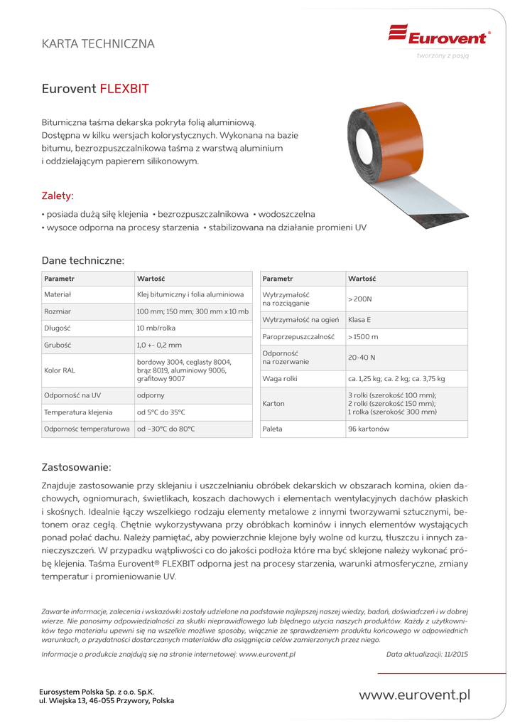 KARTA TECHNICZNA Eurovent FLEXBIT Bitumiczna taśma dekarska pokryta folią aluminiową. Dostępna w kilku wersjach kolorystycznych. Wykonana na bazie bitumu, bezrozpuszczalnikowa taśma z warstwą aluminium i oddzielającym papierem silikonowym. Zalety: • posiada dużą siłę klejenia • bezrozpuszczalnikowa • wodoszczelna • wysoce odporna na procesy starzenia • stabilizowana na działanie promieni UV Dane techniczne: Parametr Wartość Parametr Wartość Materiał Klej bitumiczny i folia aluminiowa Wytrzymałość na rozciąganie > 200N Rozmiar 100 mm; 150 mm; 300 mm x 10 mb Wytrzymałość na ogień Klasa E Długość 10 mb/rolka Paroprzepuszczalność > 1500 m Grubość 1,0 +- 0,2 mm Odporność na rozerwanie 20-40 N Kolor RAL bordowy 3004, ceglasty 8004, brąz 8019, aluminiowy 9006, grafitowy 9007 Waga rolki ca. 1,25 kg; ca. 2 kg; ca. 3,75 kg Karton 3 rolki (szerokość 100 mm); 2 rolki (szerokość 150 mm); 1 rolka (szerokość 300 mm) Paleta 96 kartonów Odporność na UV odporny Temperatura klejenia od 5°C do 35°C Odpornośc temperaturowa od –30°C do 80°C Zastosowanie: Znajduje zastosowanie przy sklejaniu i uszczelnianiu obróbek dekarskich w obszarach komina, okien dachowych, ogniomurach, świetlikach, koszach dachowych i elementach wentylacyjnych dachów płaskich i skośnych. Idealnie łączy wszelkiego rodzaju elementy metalowe z innymi tworzywami sztucznymi, betonem oraz cegłą. Chętnie wykorzystywana przy obróbkach kominów i innych elementów wystających ponad połać dachu. Należy pamiętać, aby powierzchnie klejone były wolne od kurzu, tłuszczu i innych zanieczyszczeń. W przypadku wątpliwości co do jakości podłoża które ma być sklejone należy wykonać próbę klejenia. Taśma Eurovent® FLEXBIT odporna jest na procesy starzenia, warunki atmosferyczne, zmiany temperatur i promieniowanie UV. Zawarte informacje, zalecenia i wskazówki zostały udzielone na podstawie najlepszej naszej wiedzy, badań, doświadczeń i w dobrej wierze. Nie ponosimy odpowiedzialności za skutki nieprawidłowego lub błędnego użycia naszych produktów. Każdy z użytkowników tego materiału upewni się na wszelkie możliwe sposoby, włącznie ze sprawdzeniem produktu końcowego w odpowiednich warunkach, o przydatności dostarczanych materiałów dla osiągnięcia celów zamierzonych przez niego. Informacje o produkcie znajdują się na stronie internetowej: www.eurovent.pl Eurosystem Polska Sp. z o.o. Sp.K. ul. Wiejska 13, 46-055 Przywory, Polska Data aktualizacji: 11/2015 www.eurovent.pl KARTA TECHNICZNA Eurovent FLEXBIT Przechowywanie / transport: Rolki należy przechowywać w temp. od +10°C do +30°C, w pomieszczeniach suchych, krytych, wolnych od wilgoci i bezpośredniego promieniowania UV. Rolki należy przewozić krytymi środkami transportu, zabezpieczone przed uszkodzeniem. Taśmę należy chronić przed działaniem środków chemicznych, a w szczególności substancji na bazie rozpuszczalników, gdyż mogą one obniżyć parametry techniczne lub trwale uszkodzić produkt. Inne zalecenia: • natychmiast po zakończeniu pracy należy taśmę przyciąć i zwinąć, gdyż po kilku godzinach warstwa bitumiczna mogłaby stwardnieć • unikać długotrwałego, bezpośredniego kontaktu ze skórą. Produkt objęty jest gwarancją pod warunkiem bezwzględnego przestrzegania wytycznych zawartych w karcie technicznej. Producent zastrzega sobie prawo do odmowy uznania reklamacji w przypadku nie stosowania się do przedstawionych wytycznych. Zawarte informacje, zalecenia i wskazówki zostały udzielone na podstawie najlepszej naszej wiedzy, badań, doświadczeń i w dobrej wierze. Nie ponosimy odpowiedzialności za skutki nieprawidłowego lub błędnego użycia naszych produktów. Każdy z użytkowników tego materiału upewni się na wszelkie możliwe sposoby, włącznie ze sprawdzeniem produktu końcowego w odpowiednich warunkach, o przydatności dostarczanych materiałów dla osiągnięcia celów zamierzonych przez niego. Informacje o produkcie znajdują się na stronie internetowej: www.eurovent.pl Eurosystem Polska Sp. z o.o. Sp.K. ul. Wiejska 13, 46-055 Przywory, Polska Data aktualizacji: 11/2015 www.eurovent.pl